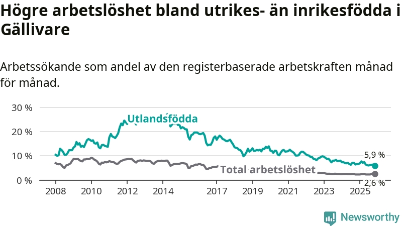 Arbetslösheten bland utlandsfödda var 5,9 procent i Gällivare under november månad, motsvarande 78 av 1 322 personer. Det är 0,7 procentenheter färre än vid samma tidpunkt i fjol (−6 om man räknar personer). Den nuvarande arbetslöshetsnivån är den lägsta sedan januari 2008. Den senaste månadens nedgång innebär ett trendbrott. Under de ett föregående månaderna hade arbetslösheten bland utlandsfödda varit högre än motsvarande tidpunkt året innan.