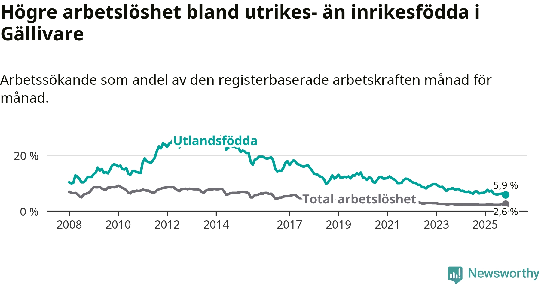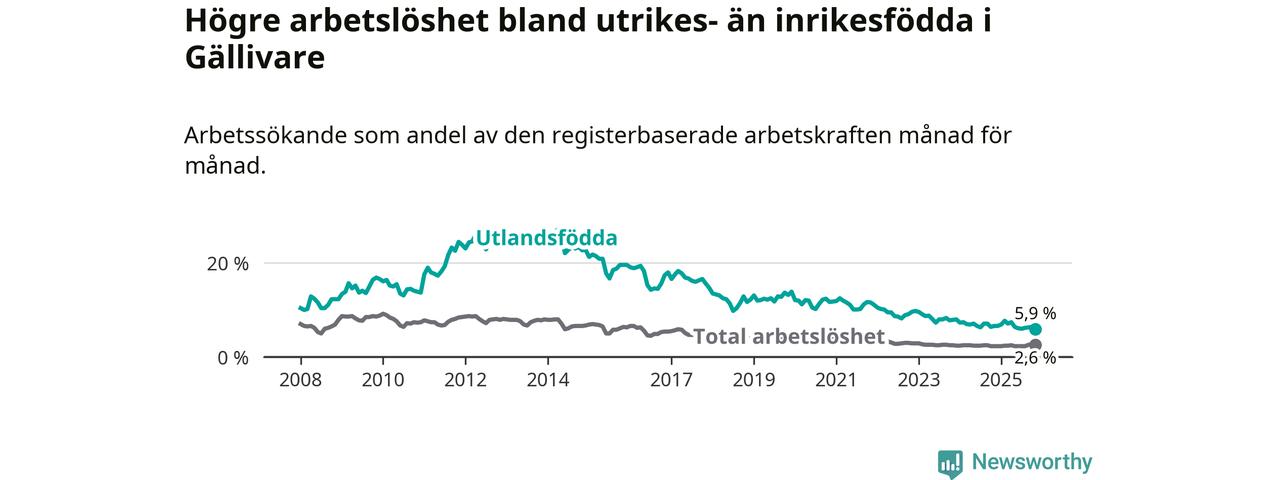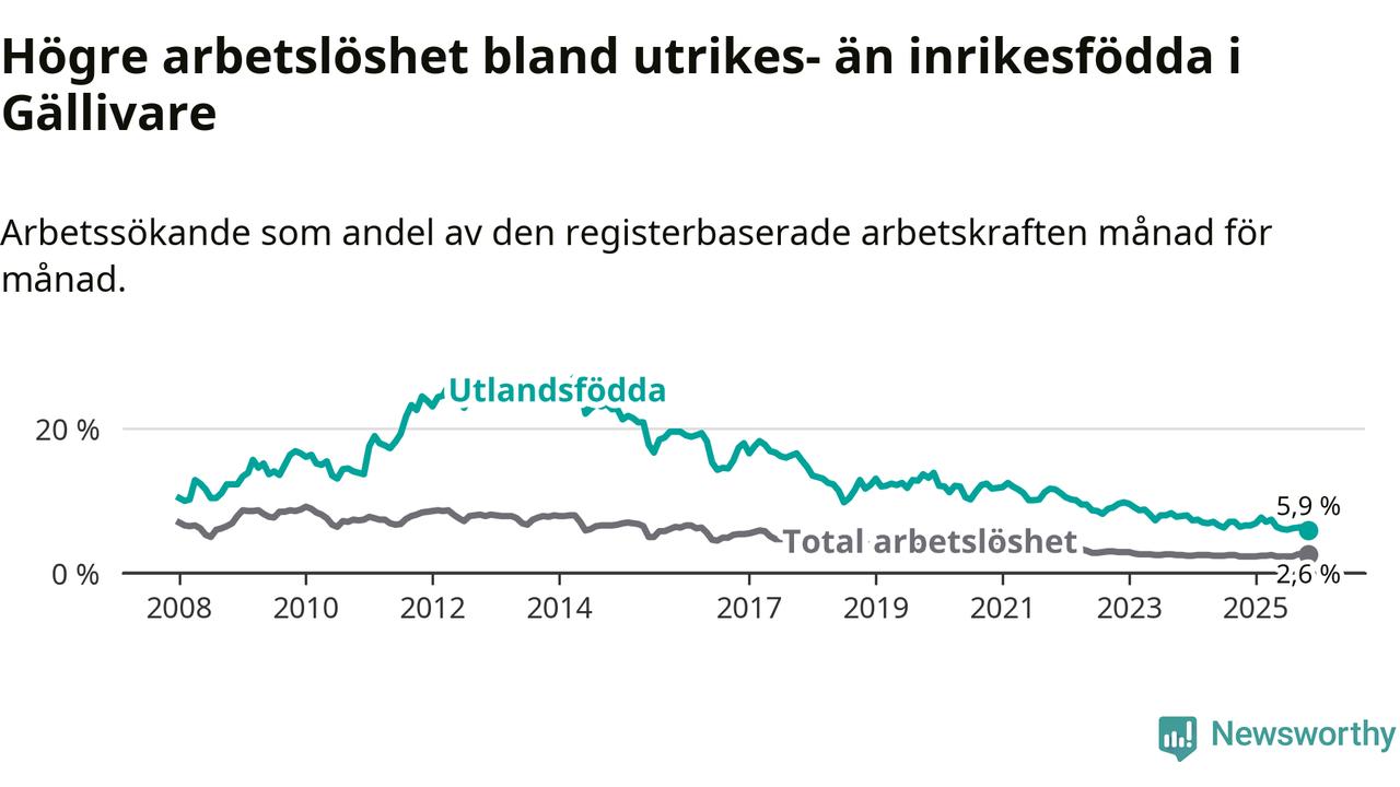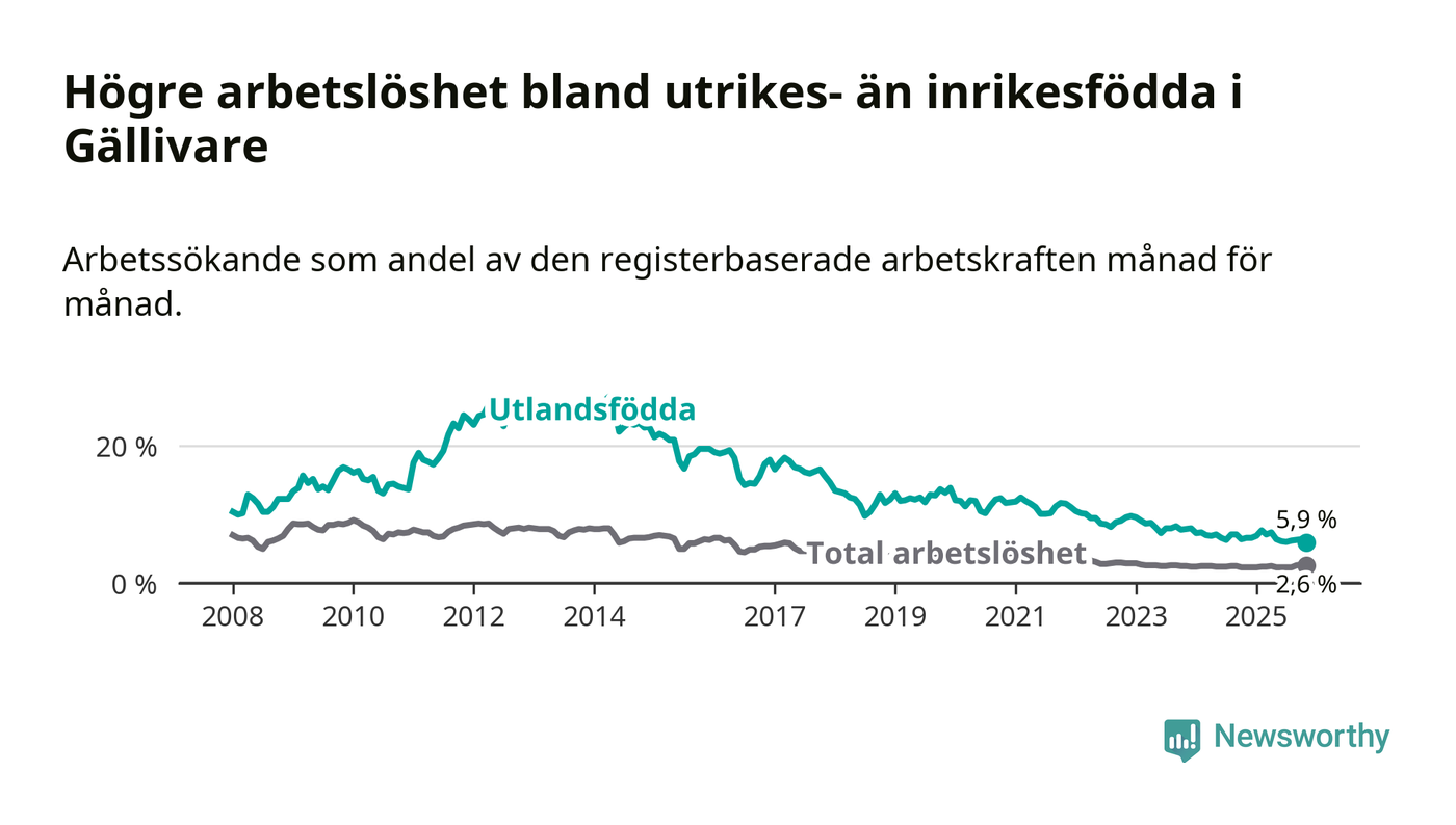 Skillnaden i arbetslöshet mellan utrikesfödda och hela befolkningen är 3,3 procentenheter i Gällivare. Det är en mindre skillnad än för ett år sedan (−1,0 procentenheter).