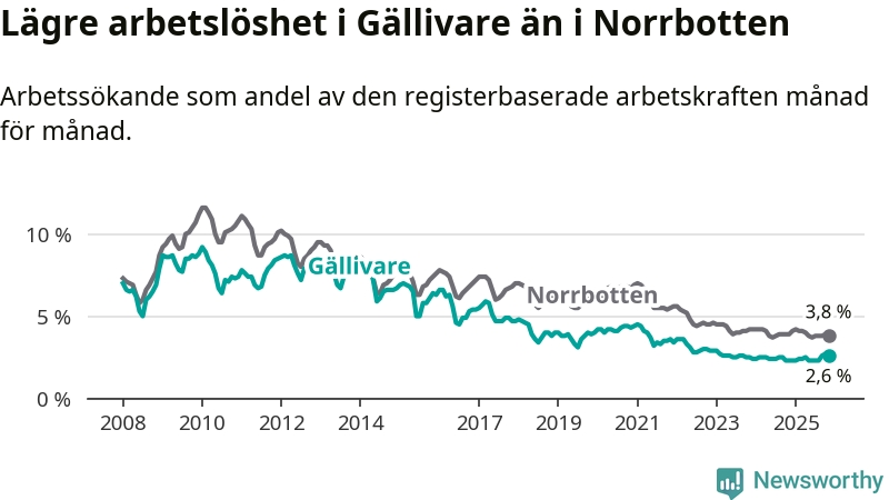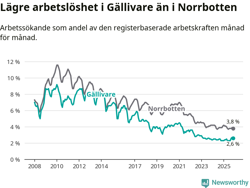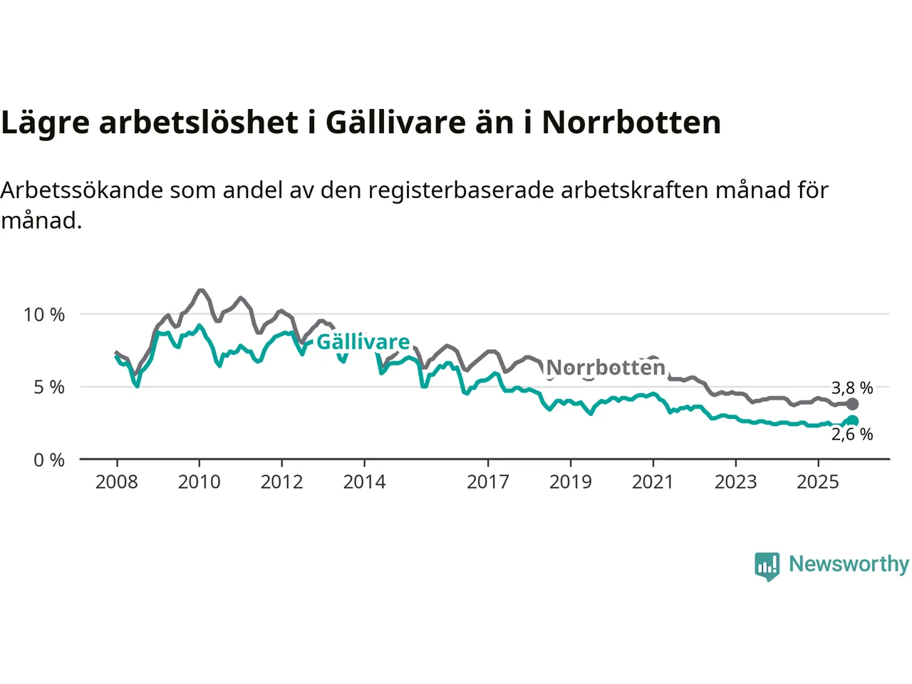Även om arbetslösheten i Gällivare alltså ökar, så ligger den fortfarande under snittet i hela Norrbottens län (2,6 procent i kommunen, jämfört med 3,8 procent i hela länet). Kiruna har den lägsta arbetslösheten i länet (2,5 procent), medan Haparanda har den högsta (7,0 procent).