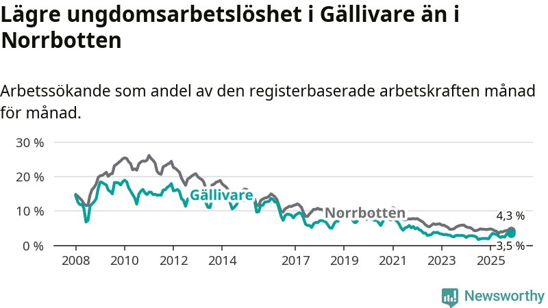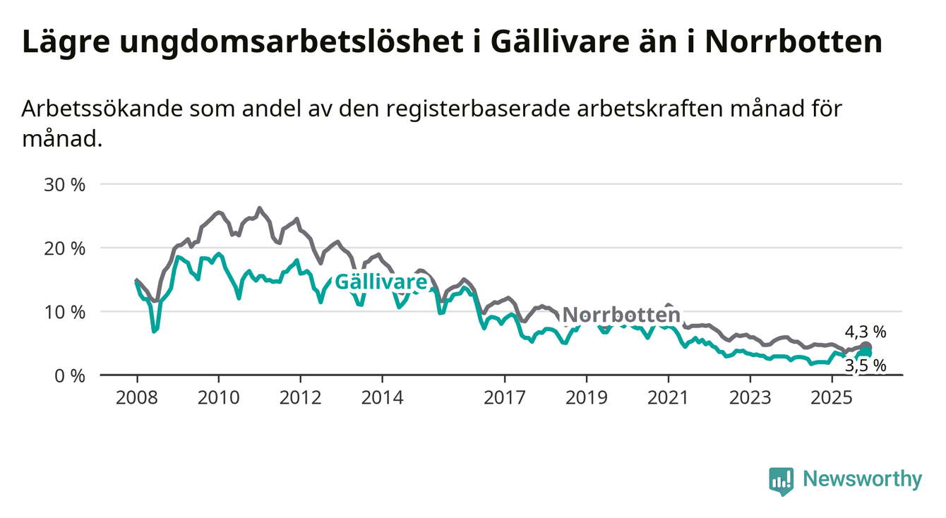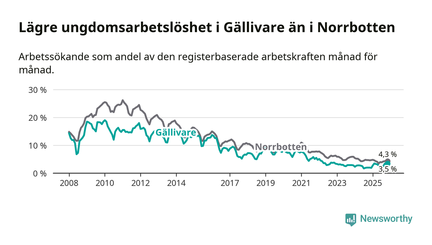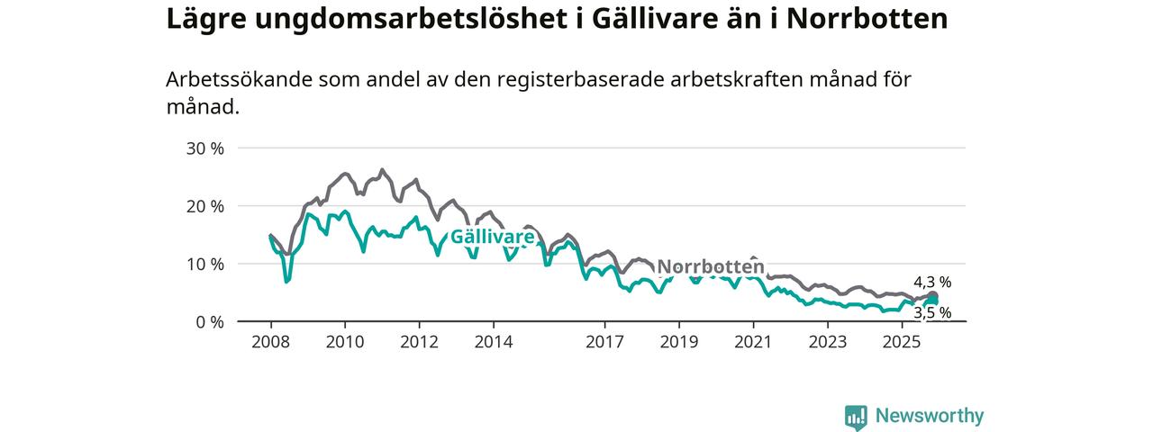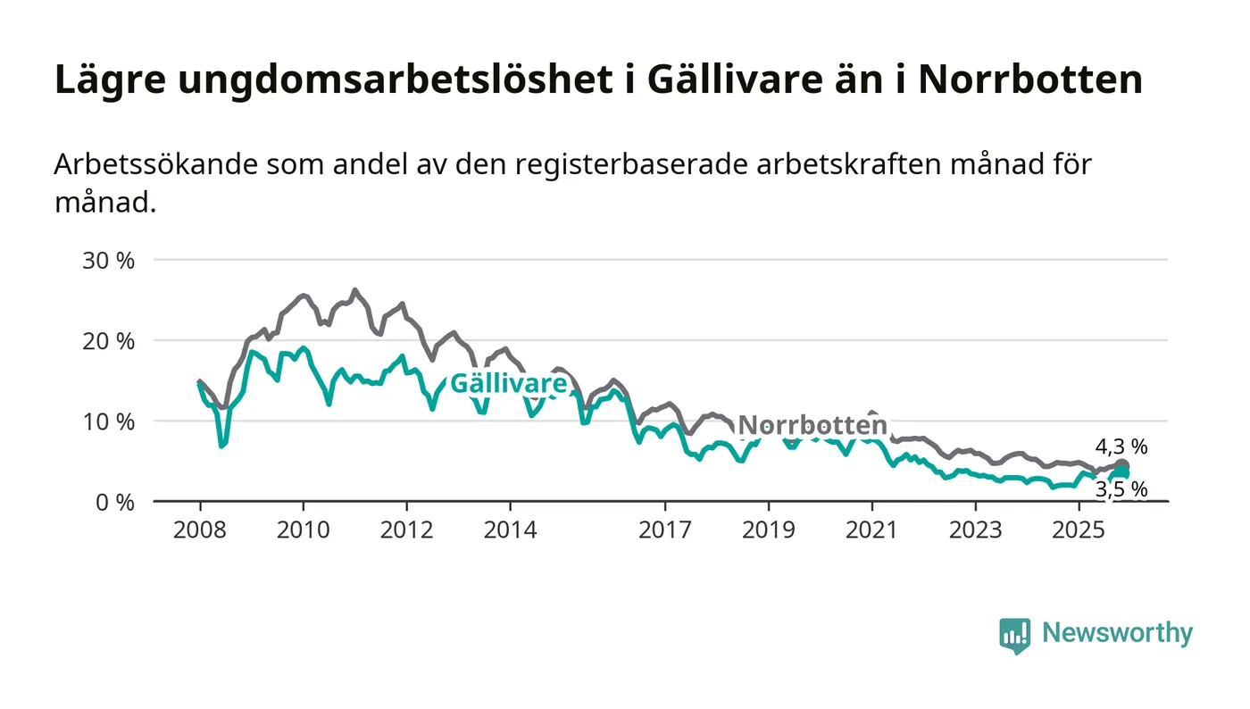 Precis som den totala arbetslösheten ligger ungdomsarbetslösheten i Gällivare lägre än i Norrbotten som helhet. Skillnaden mellan kommunen och länet är 0,8 procentenheter.
