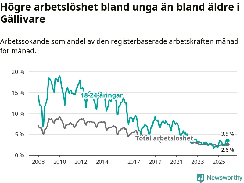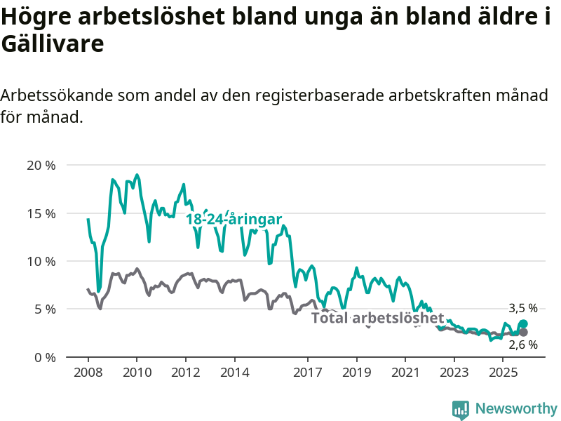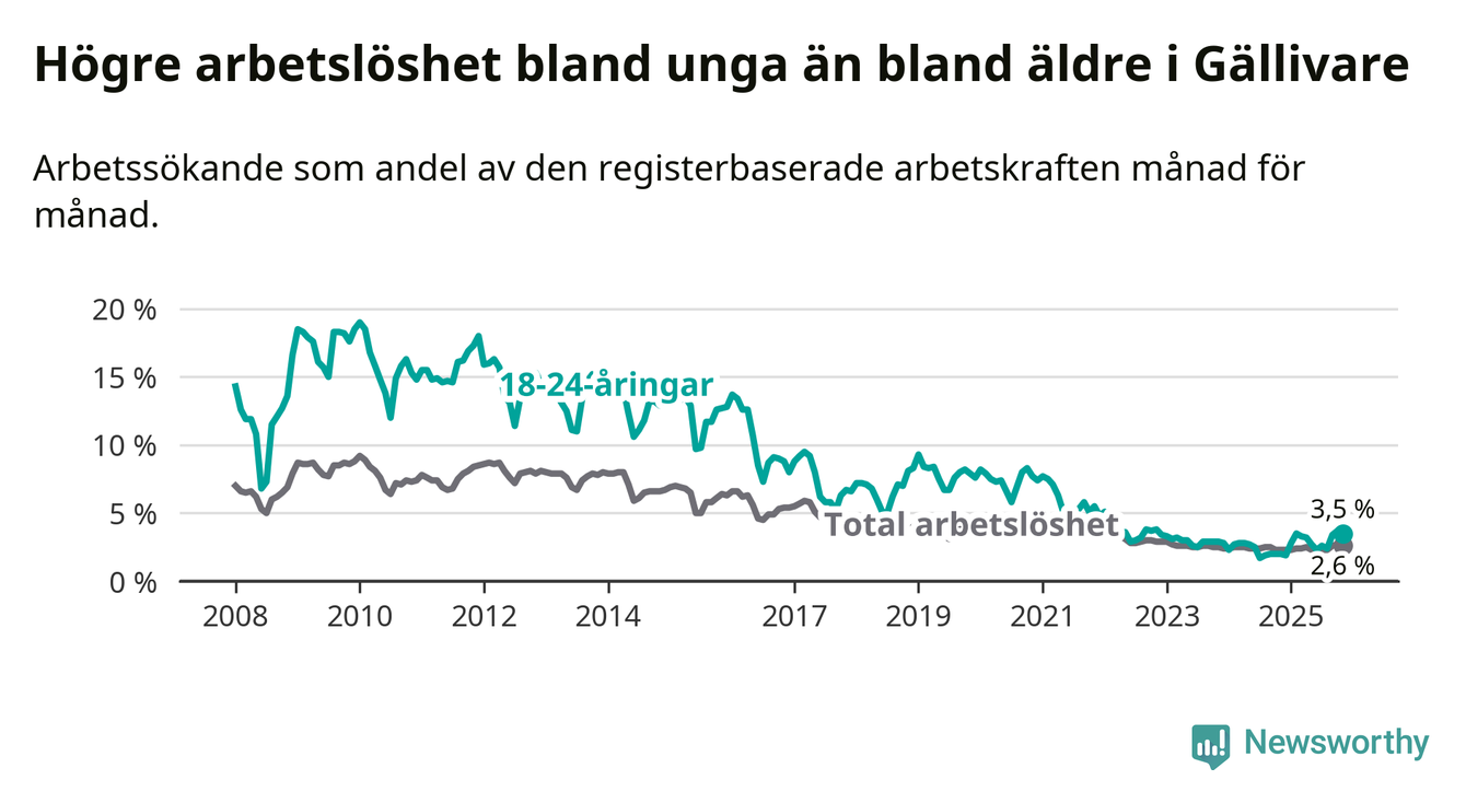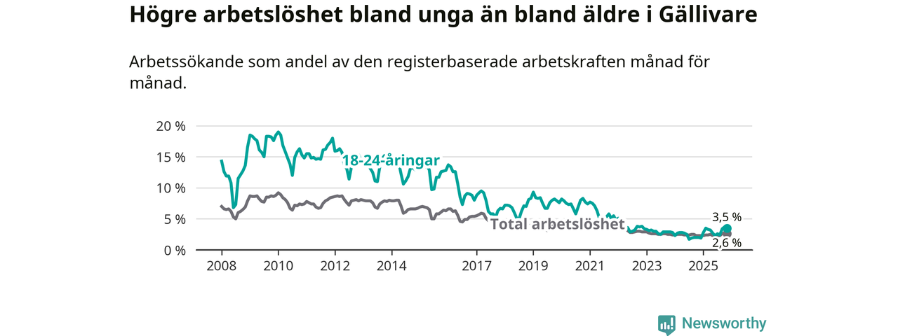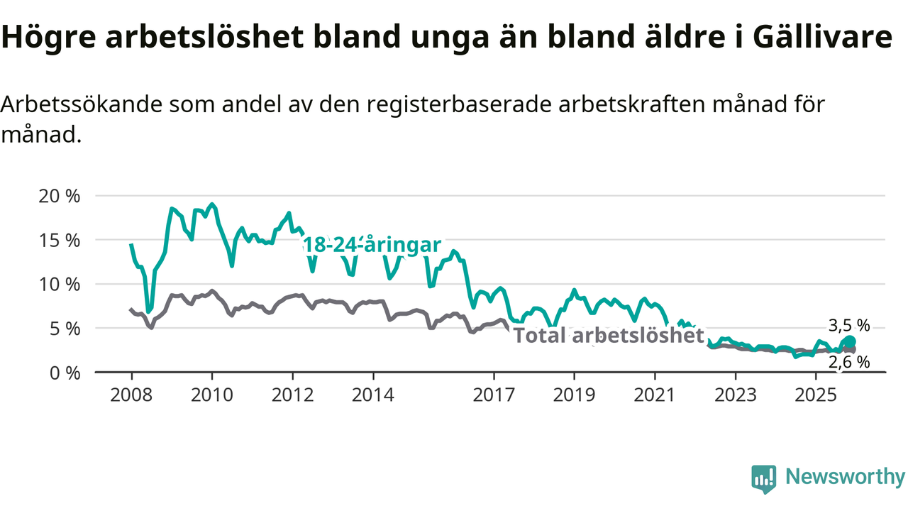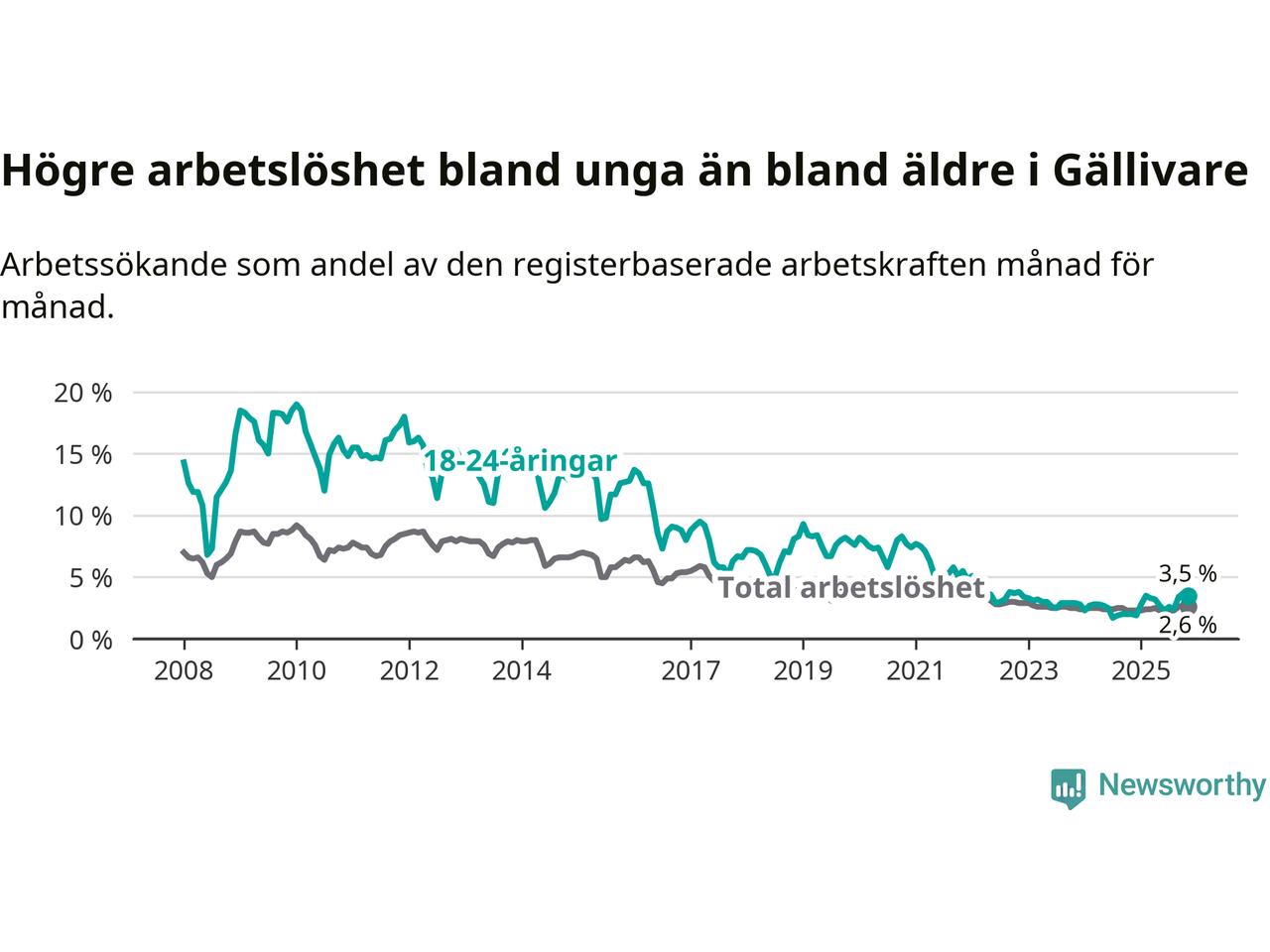 Precis som den totala arbetslösheten ligger ungdomsarbetslösheten i Gällivare lägre än i Norrbotten som helhet. Skillnaden mellan kommunen och länet är 0,8 procentenheter.