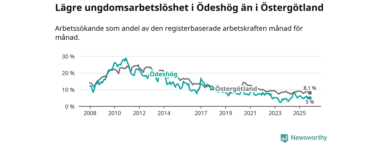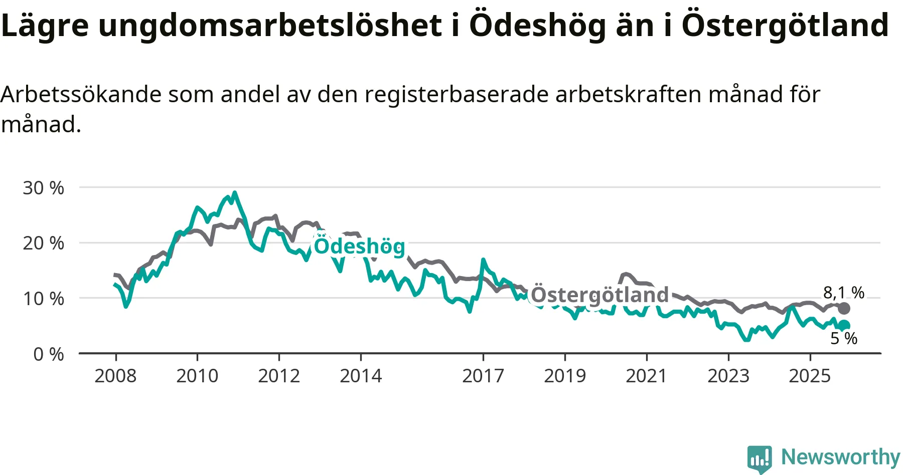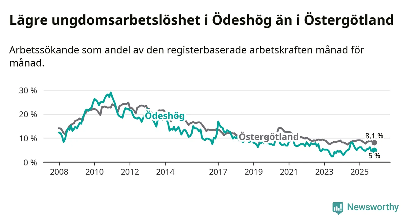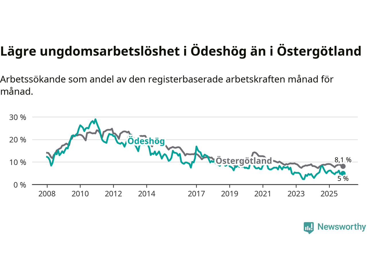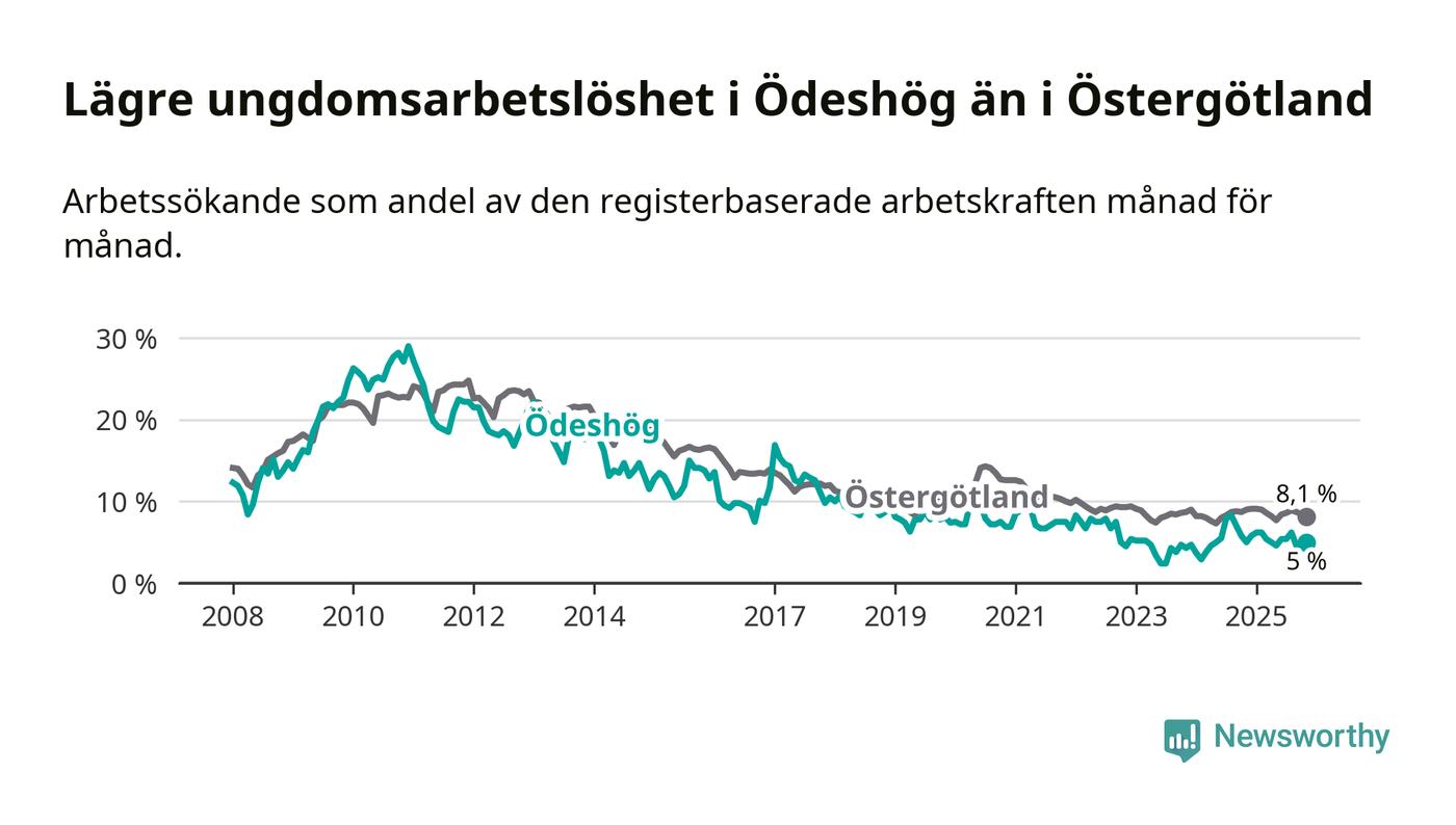 Precis som den totala arbetslösheten ligger ungdomsarbetslösheten i Ödeshög lägre än i Östergötland som helhet. Skillnaden mellan kommunen och länet är 3,1 procentenheter.