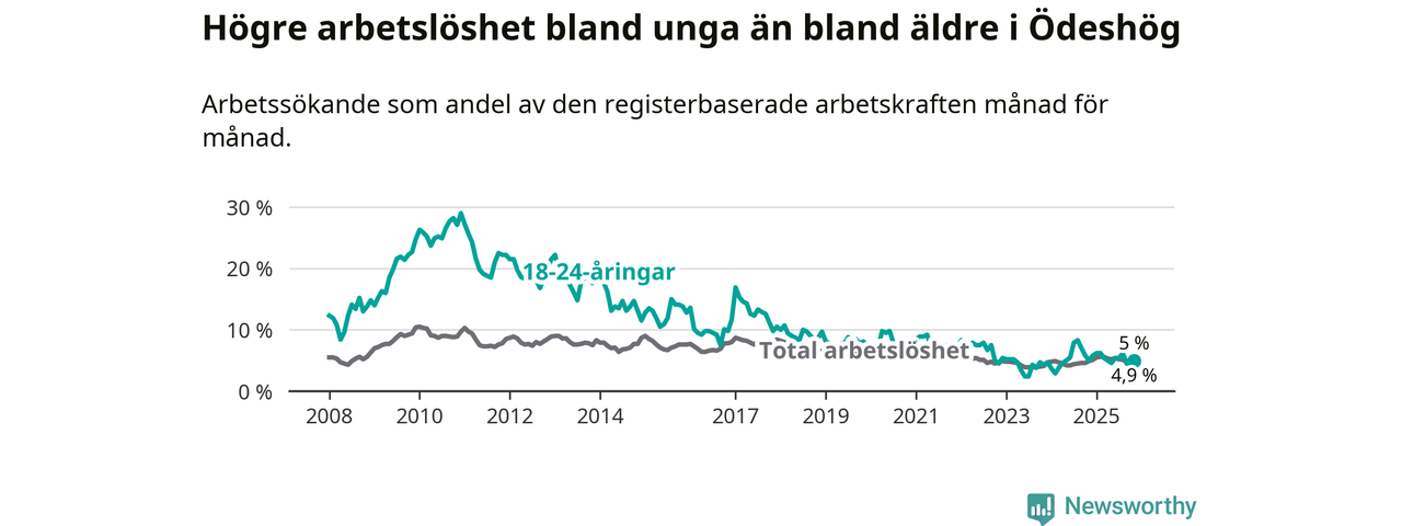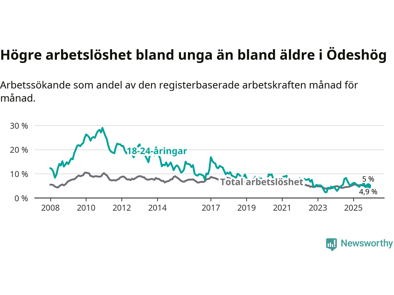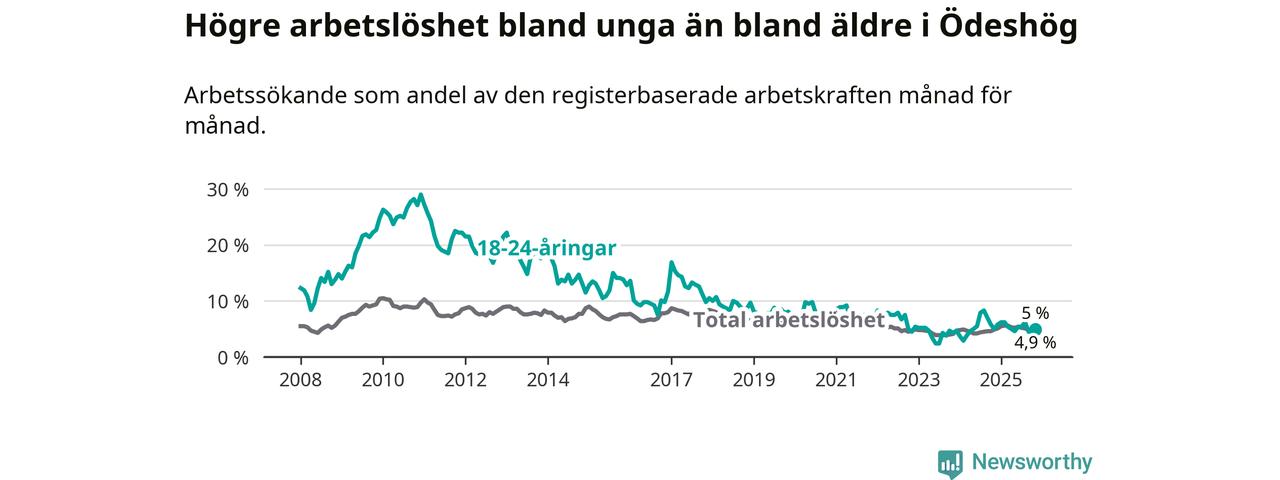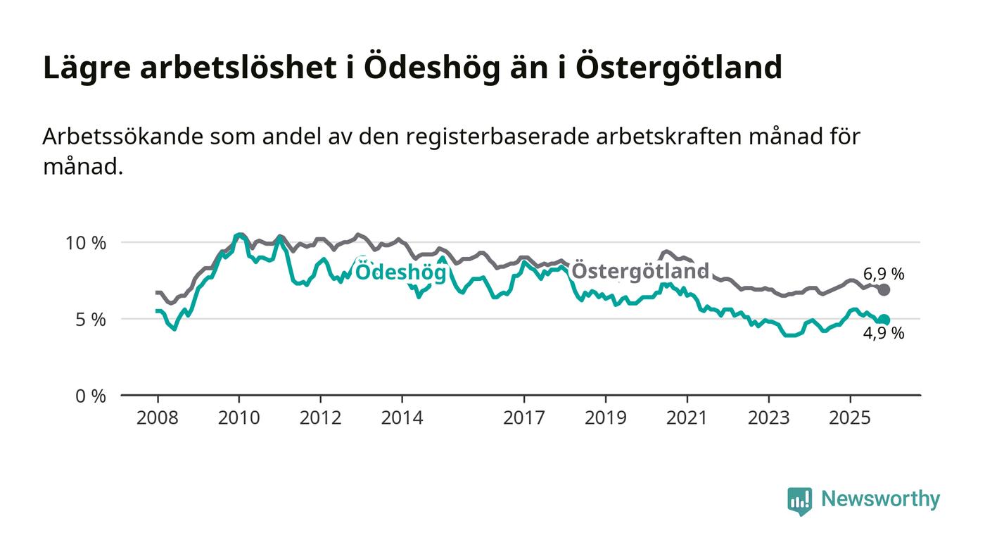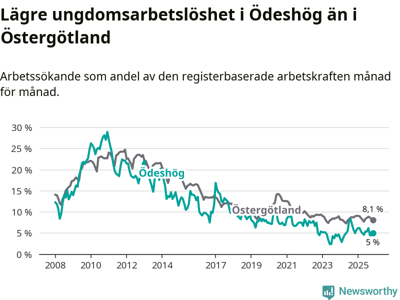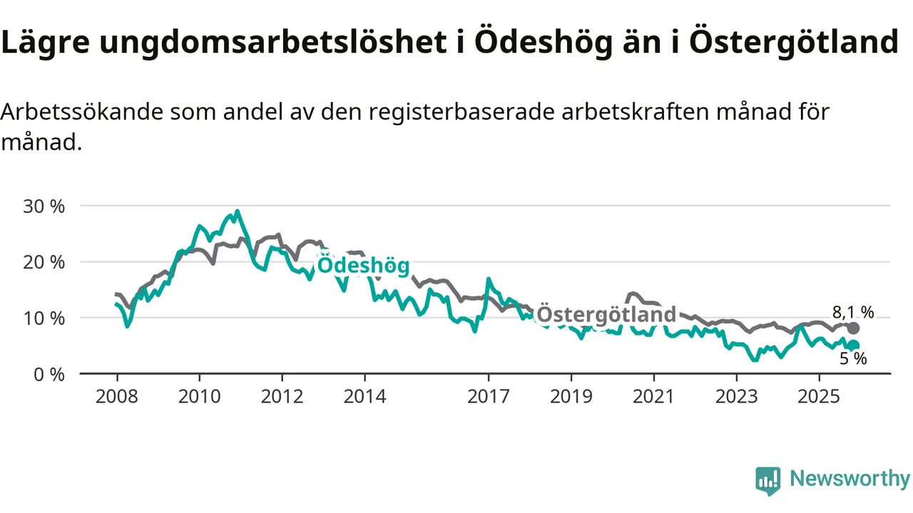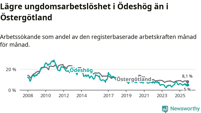 Precis som den totala arbetslösheten ligger ungdomsarbetslösheten i Ödeshög lägre än i Östergötland som helhet. Skillnaden mellan kommunen och länet är 3,1 procentenheter.
