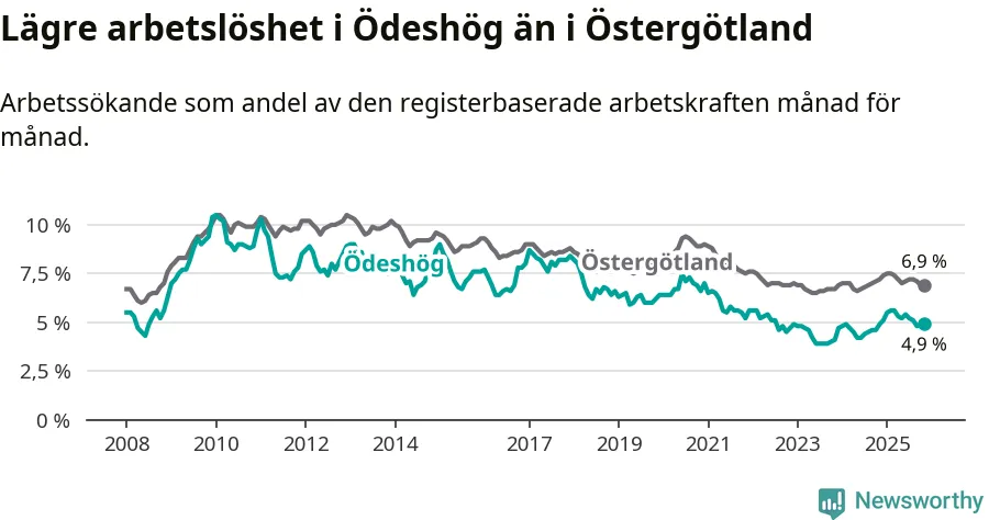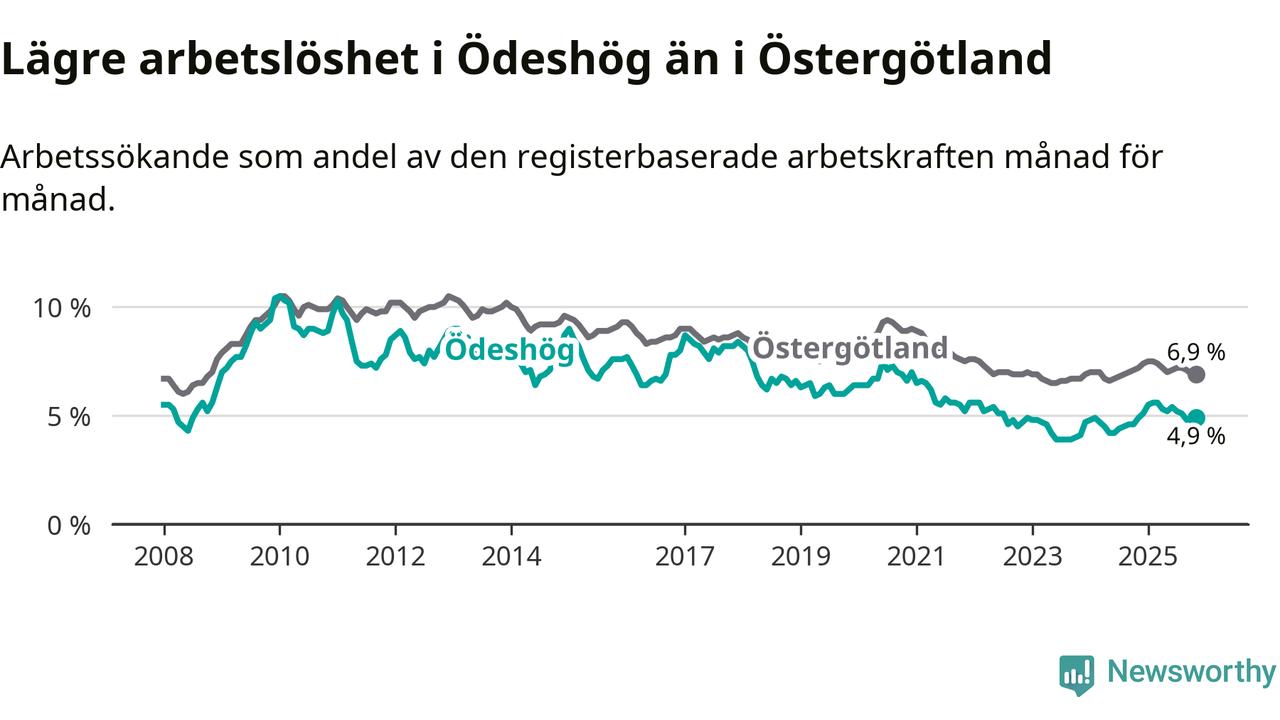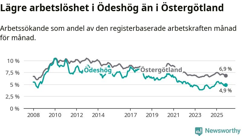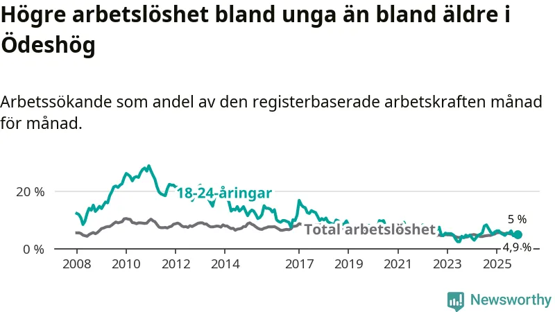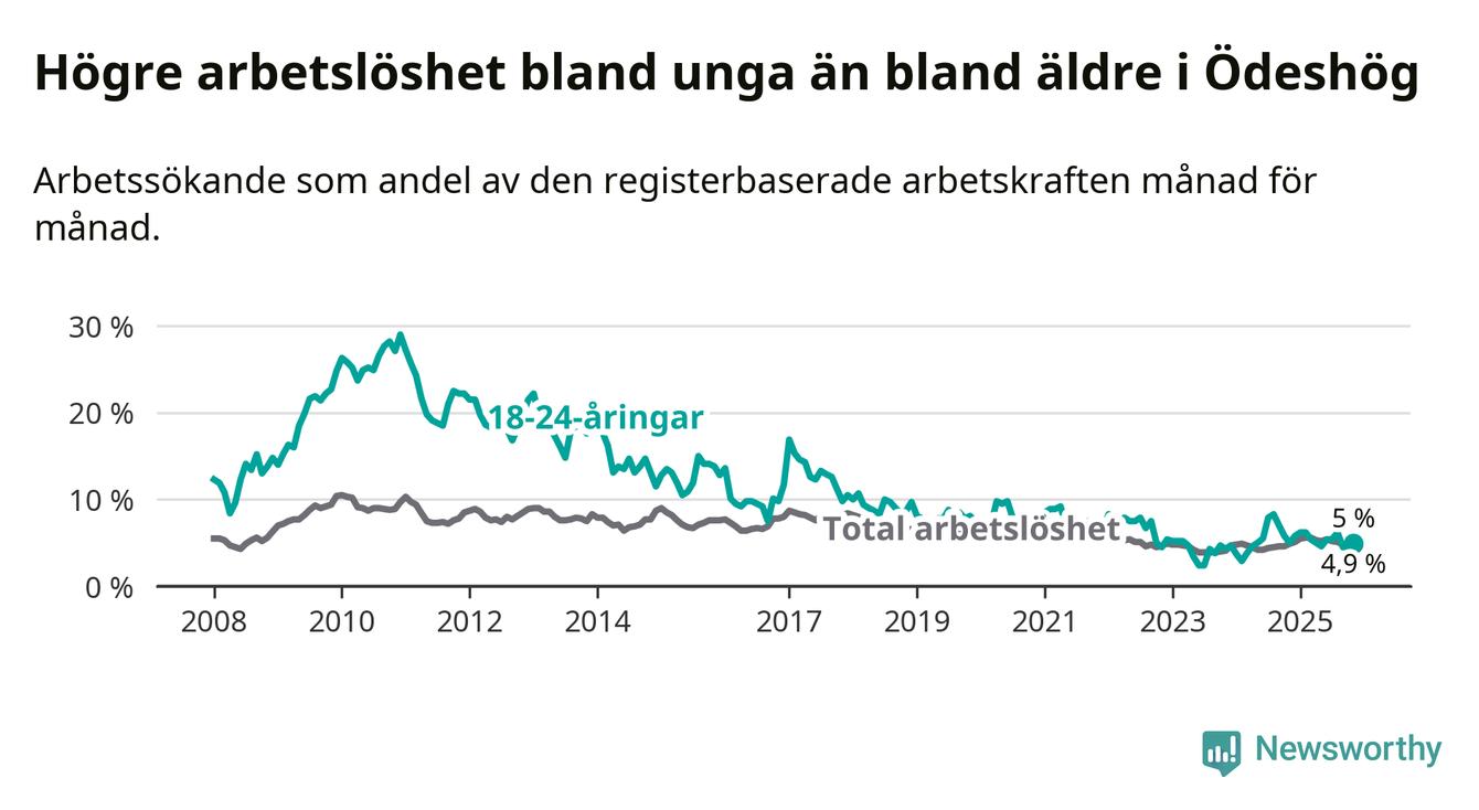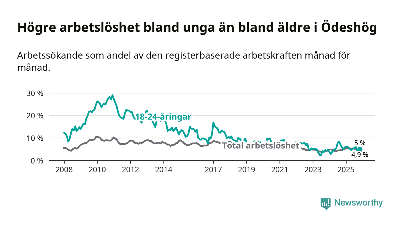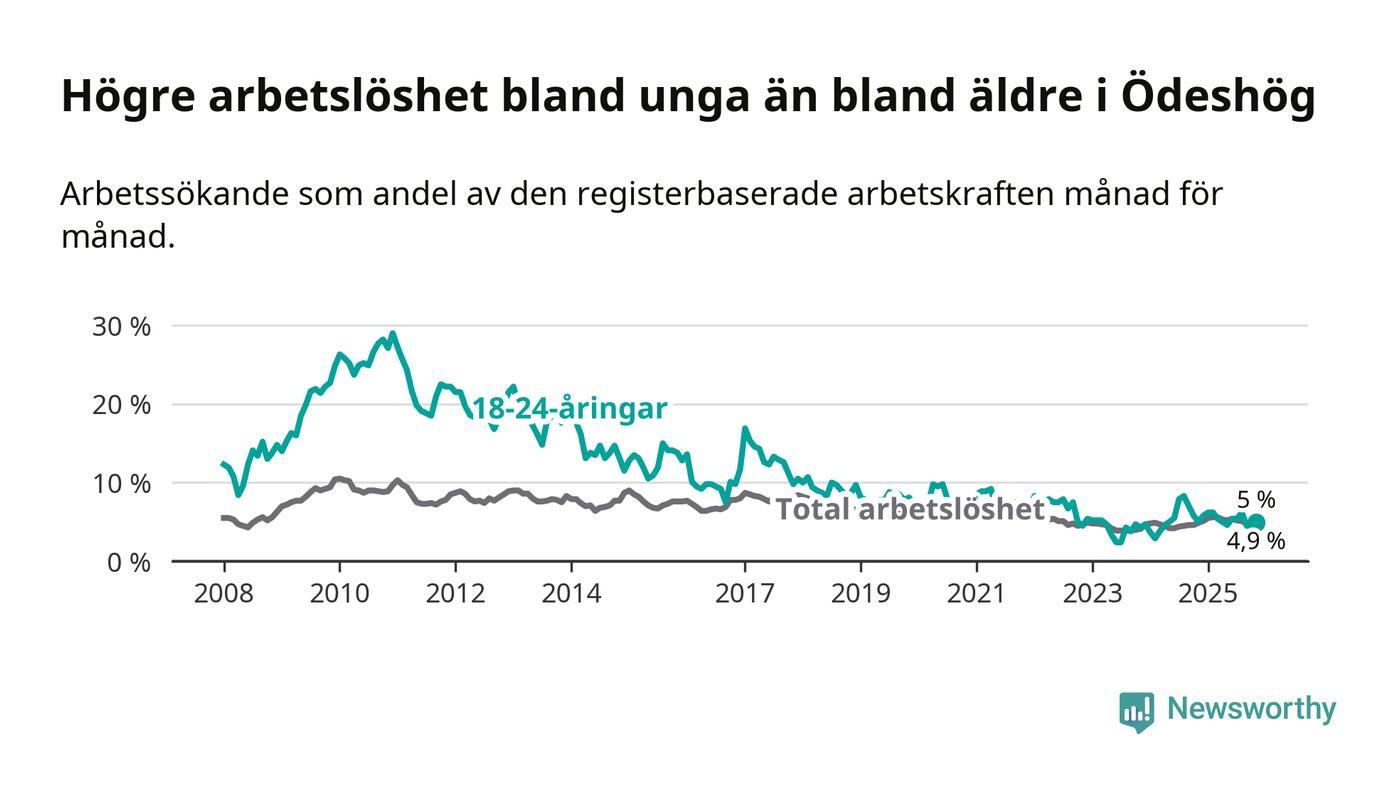 Precis som den totala arbetslösheten ligger ungdomsarbetslösheten i Ödeshög lägre än i Östergötland som helhet. Skillnaden mellan kommunen och länet är 3,1 procentenheter.