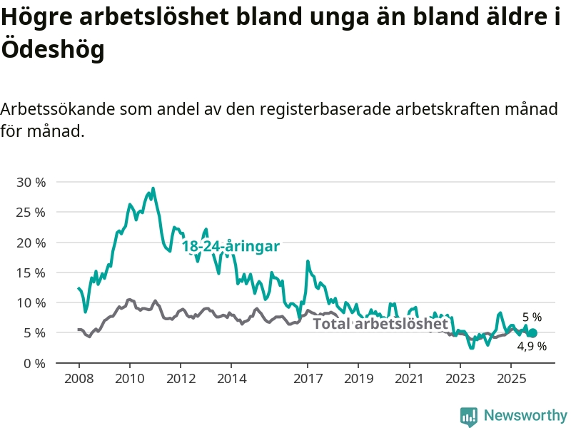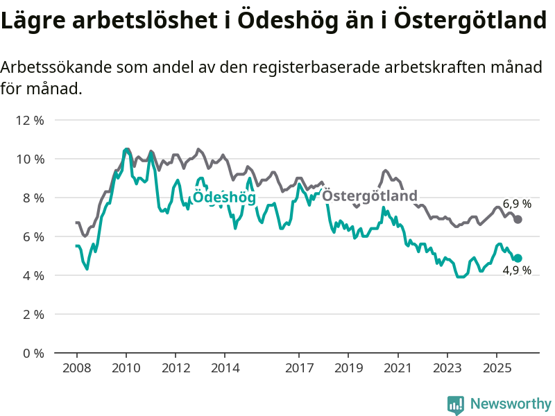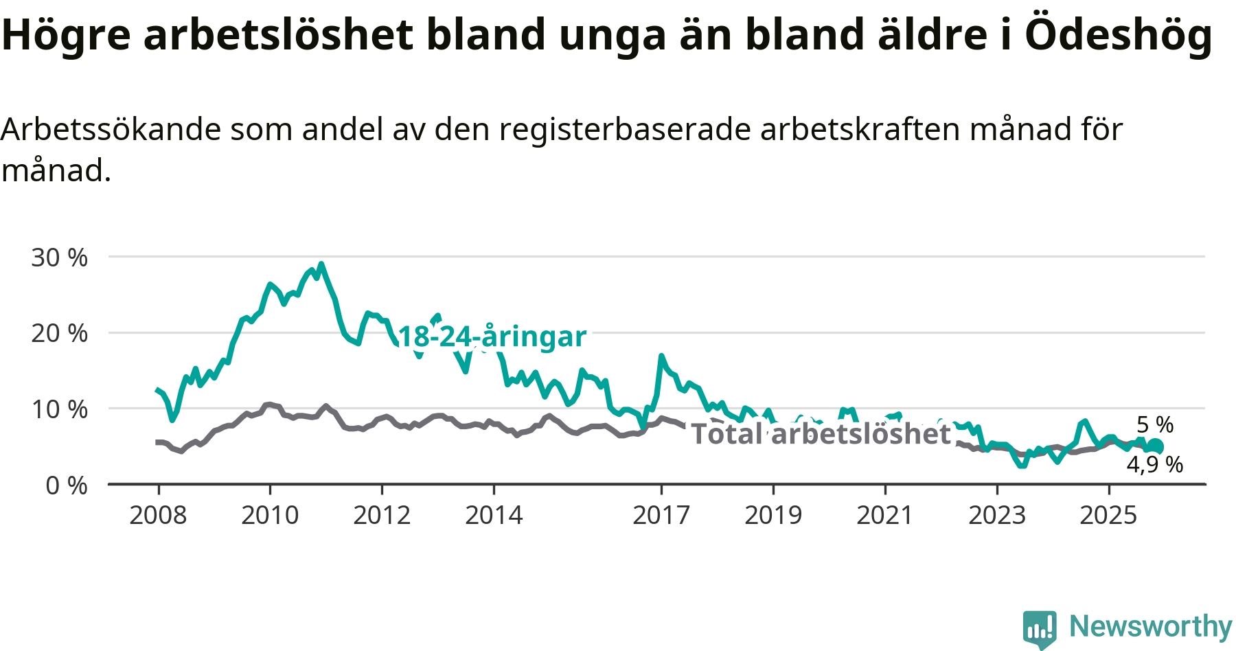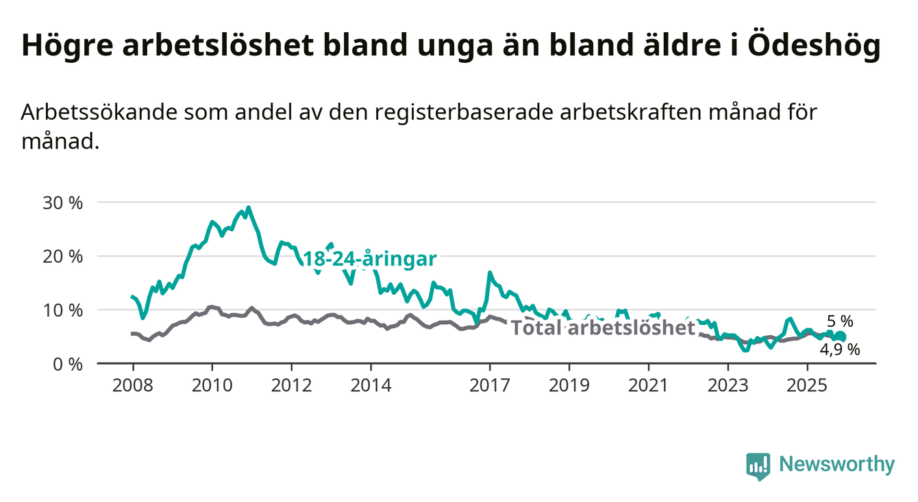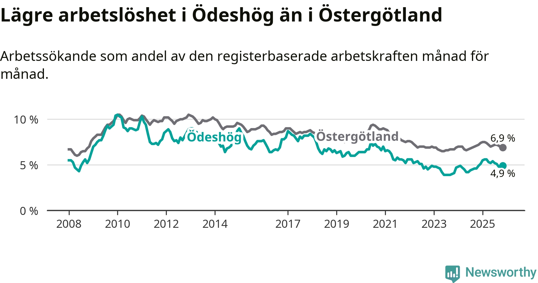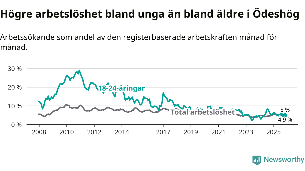 Precis som den totala arbetslösheten ligger ungdomsarbetslösheten i Ödeshög lägre än i Östergötland som helhet. Skillnaden mellan kommunen och länet är 3,1 procentenheter.