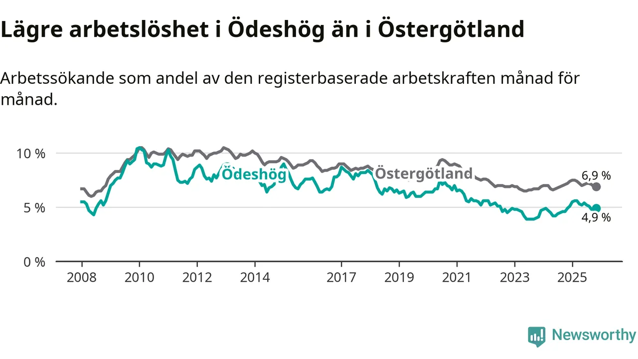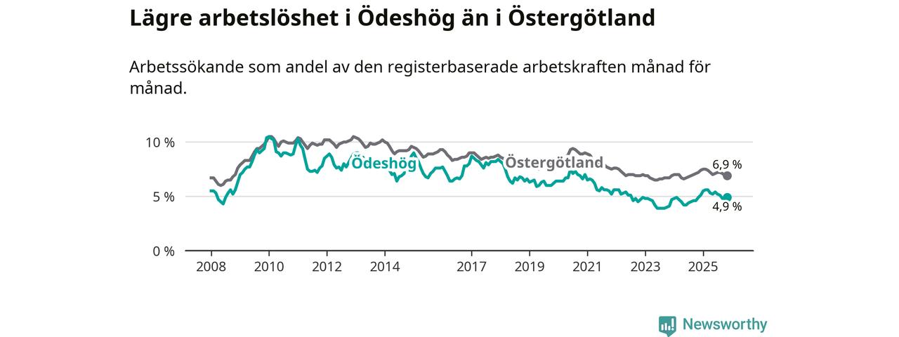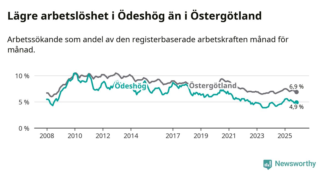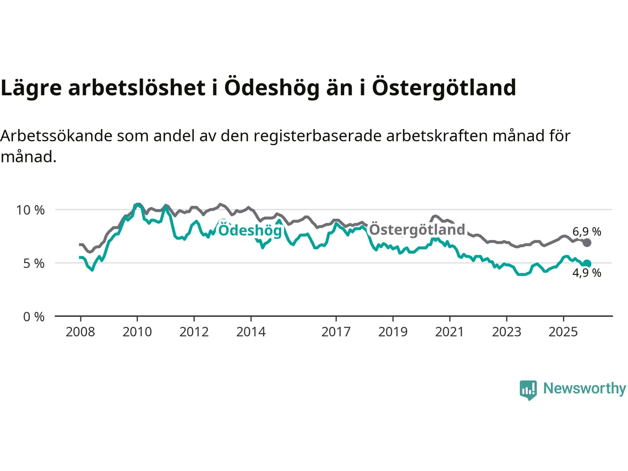 Under november månad rapporterade Ödeshögs kommun en total arbetslöshet på 4,9 procent. Det är i samma nivå som i november i fjol. I Östergötlands län däremot sjunker arbetslösheten