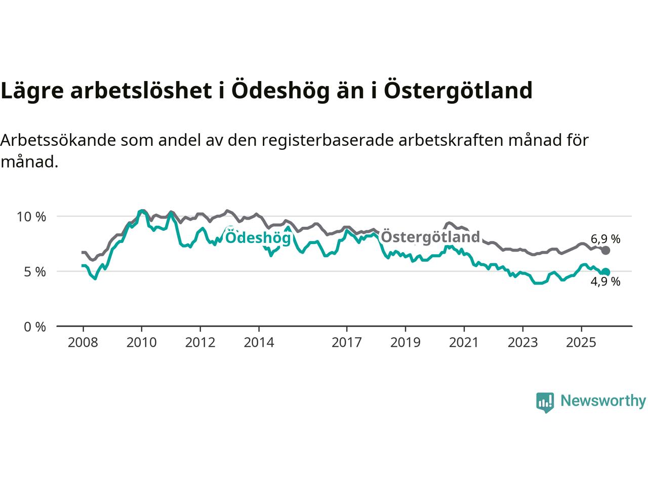 Arbetslösheten i Ödeshög ligger under nivån i hela Östergötlands län (4,9 procent i kommunen, jämfört med 6,9 procent i hela länet). Ydre har den lägsta arbetslösheten i länet (3,1 procent), medan Norrköping har den högsta (9,0 procent). För att Ödeshög skulle komma ner i samma arbetslöshetsnivå som Ydre skulle 44 personer behöva sysselsättas.