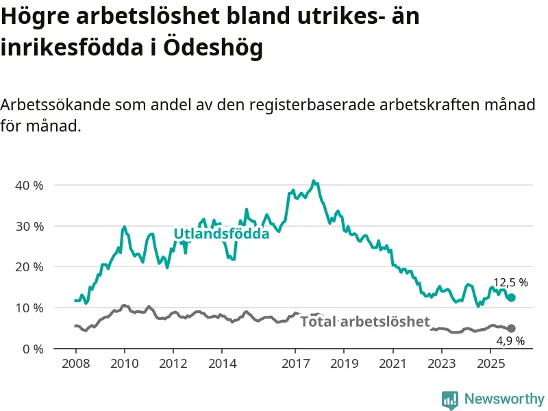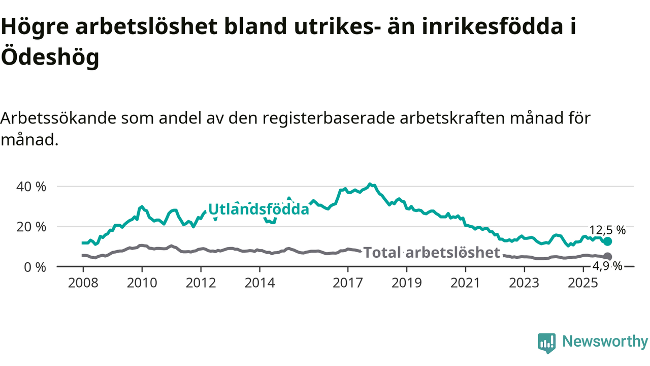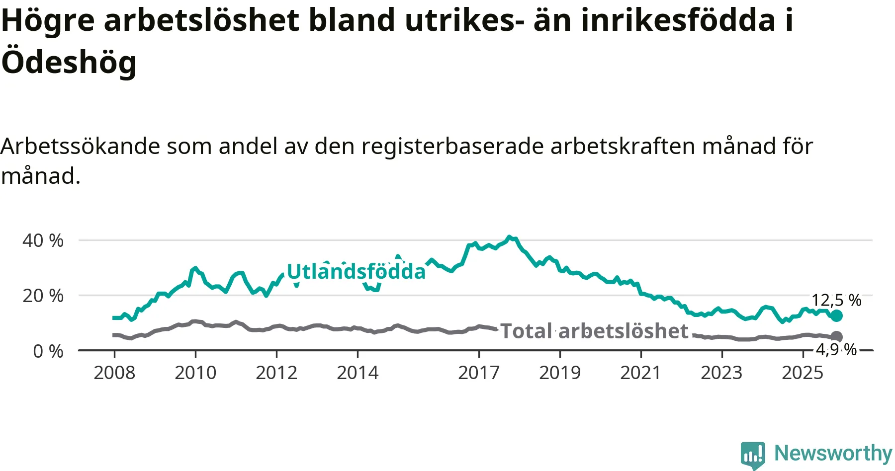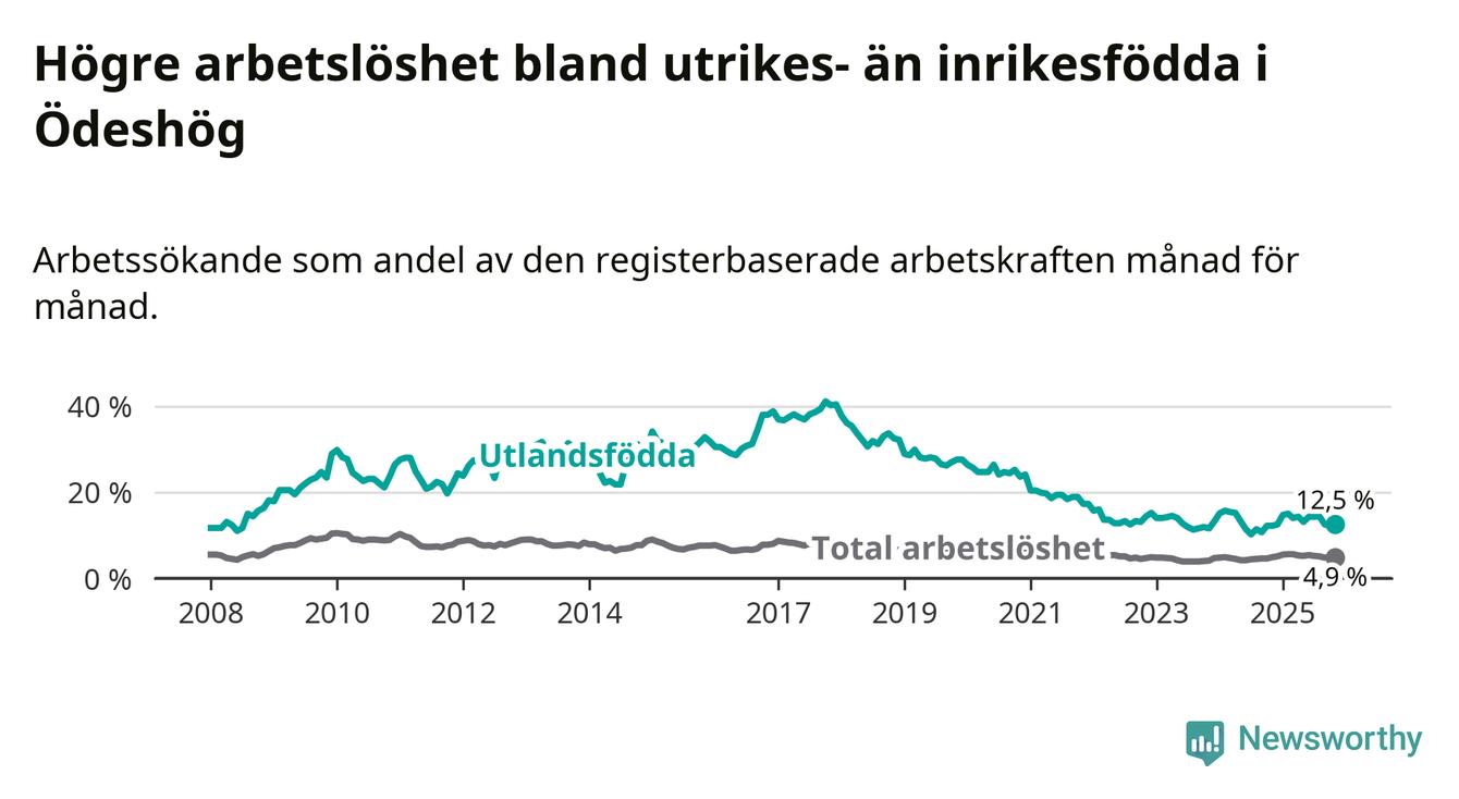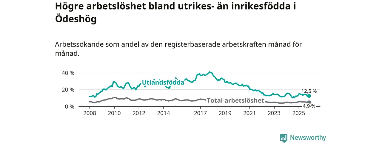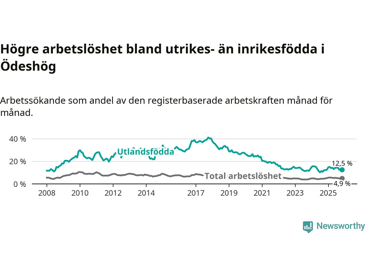 Arbetslösheten bland utlandsfödda var 12,5 procent i Ödeshög under november månad, motsvarande 41 av 328 personer. Det är 0,3 procentenheter fler än vid samma tidpunkt i fjol (+1 om man räknar personer). Den senaste månadens uppgång innebär ett trendbrott. Under de ett föregående månaderna hade arbetslösheten bland utlandsfödda varit lägre än motsvarande tidpunkt året innan.