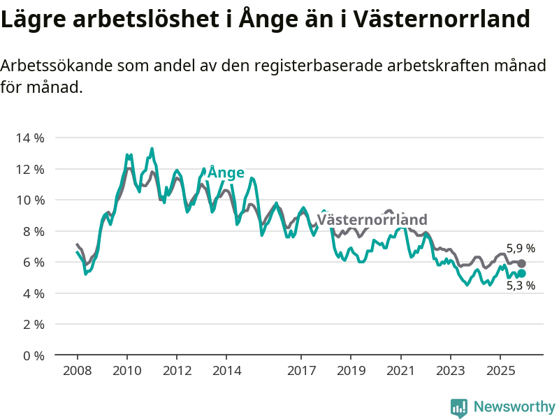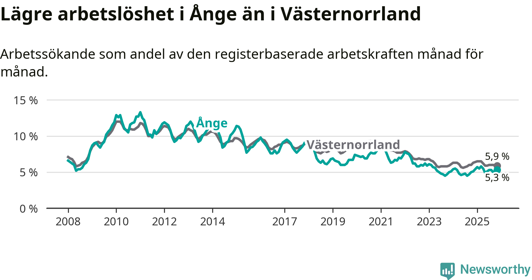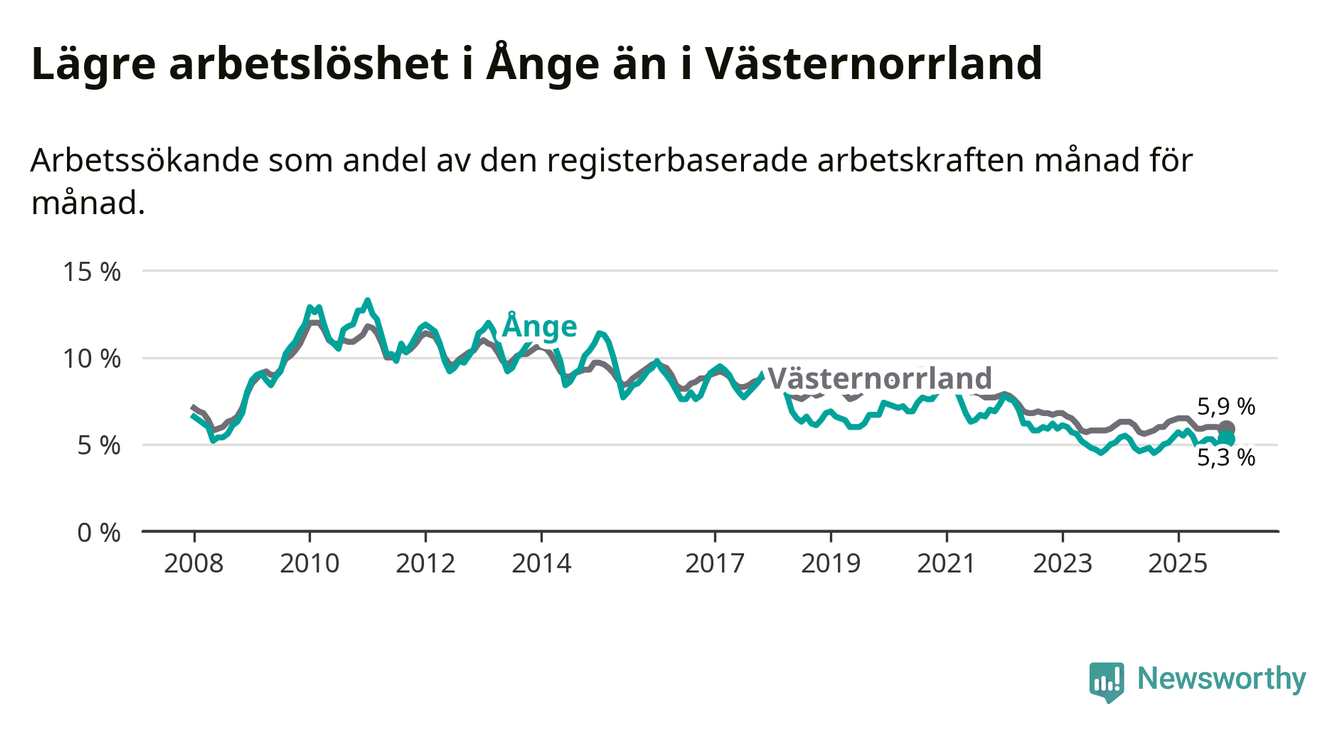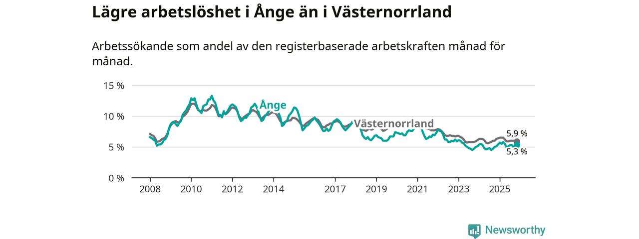 Ånge går därmed mot strömmen i förhållande till andra kommuner i Västernorrlands län. I de flesta andra kommuner i länet går arbetslösheten nedåt. Störst är minskningen i Sundsvall, där arbetslösheten sjunker med 0,5 procentenheter. I tabellen längre ner ser du utvecklingen i samtliga kommuner i länet.