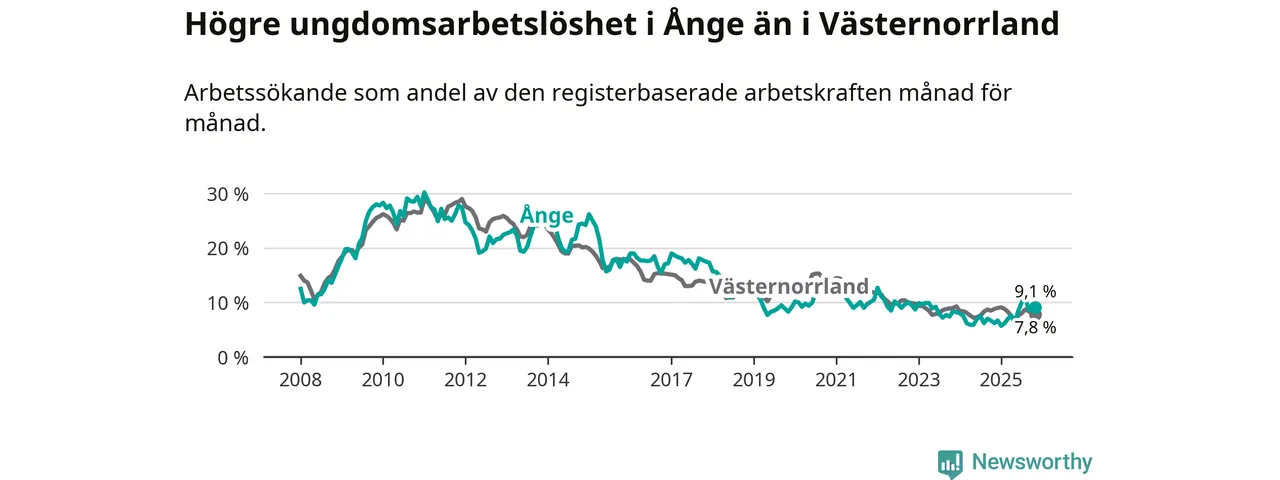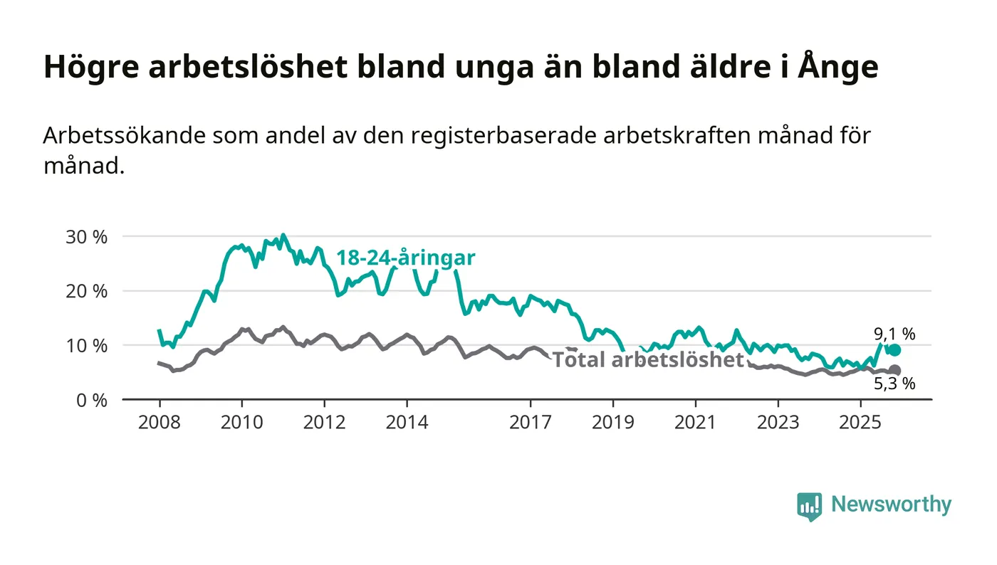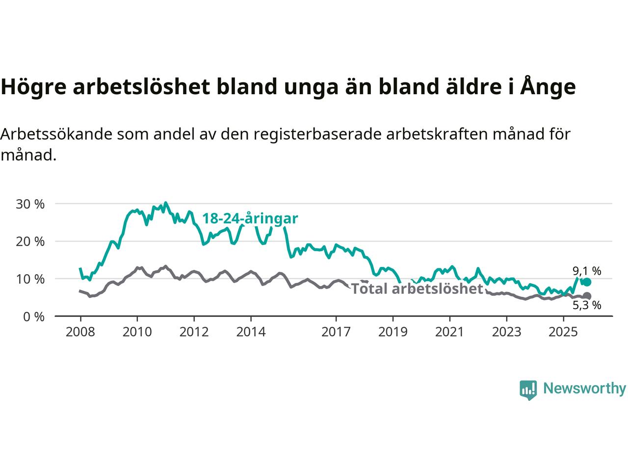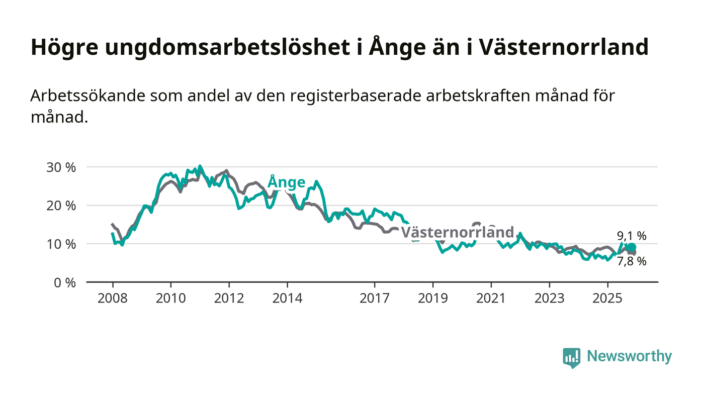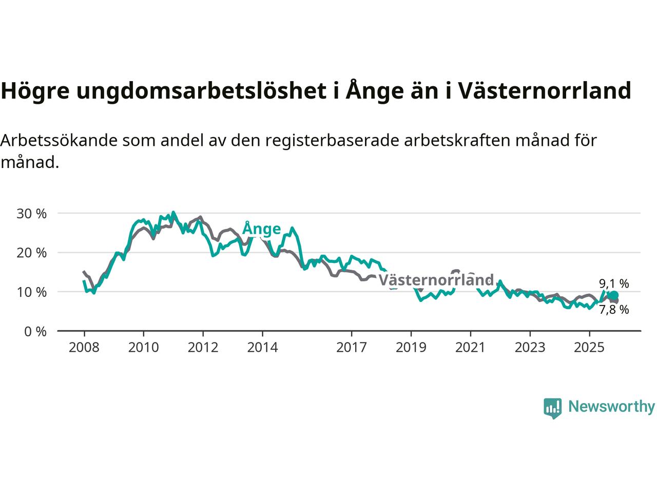 Medan Ånge har lägre total arbetslöshet än Västernorrland, ligger ungdomsarbetslösheten 1,3 procentenheter högre i Ånge.