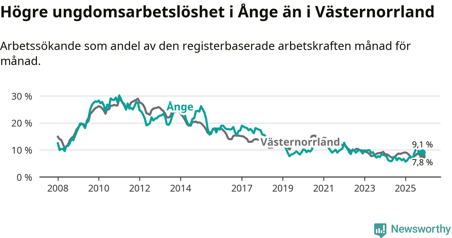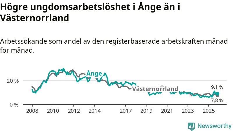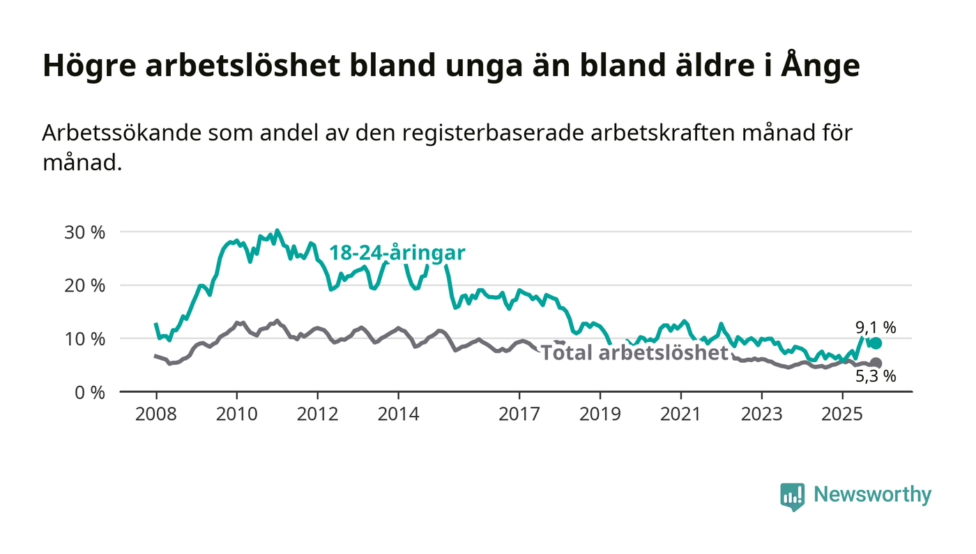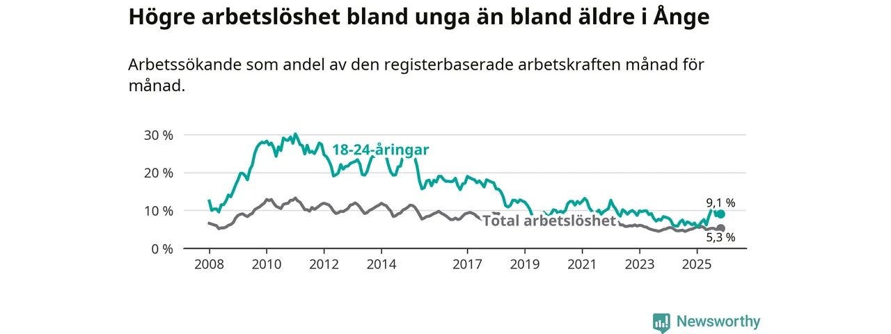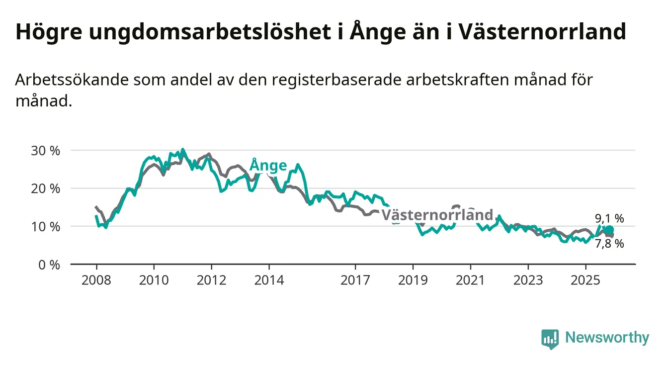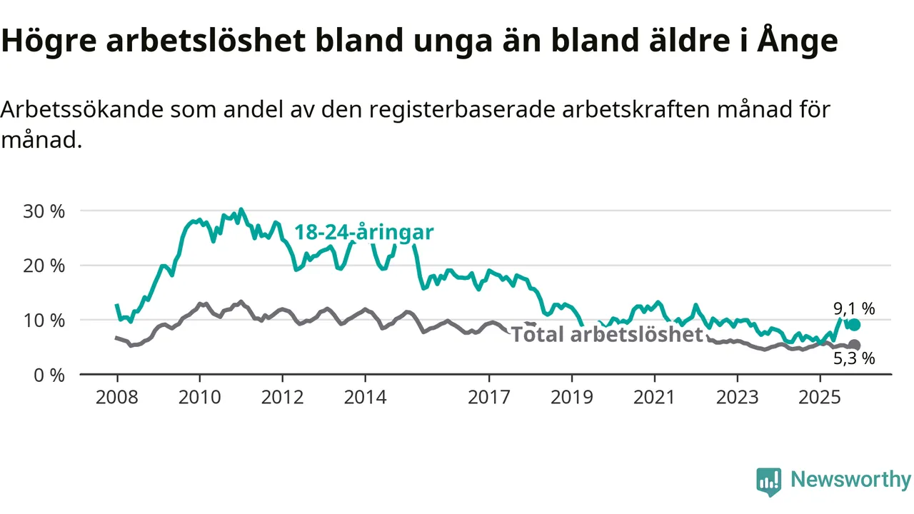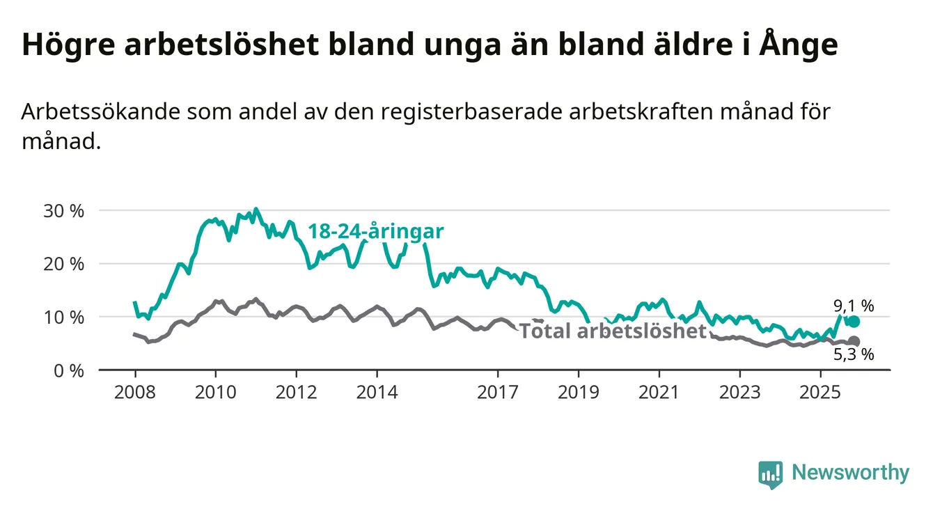 Medan Ånge har lägre total arbetslöshet än Västernorrland, ligger ungdomsarbetslösheten 1,3 procentenheter högre i Ånge.
