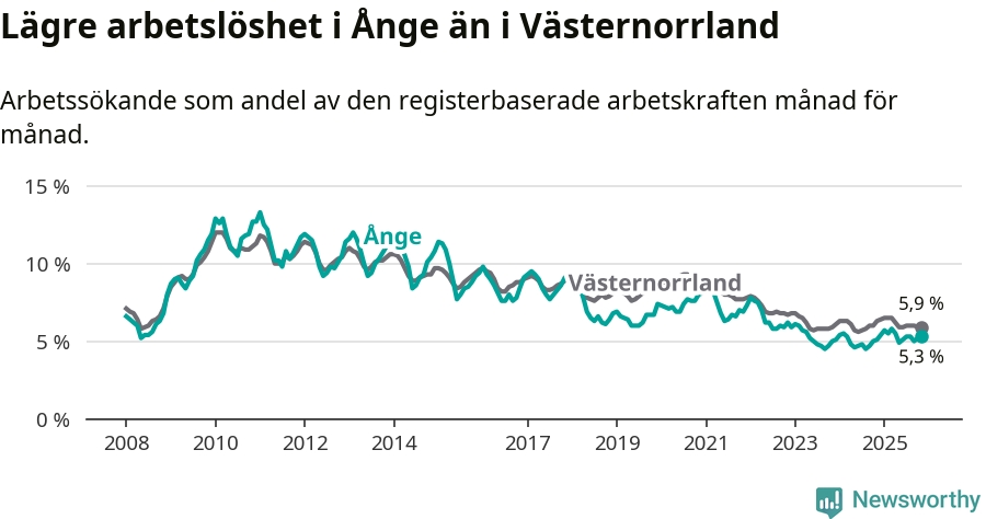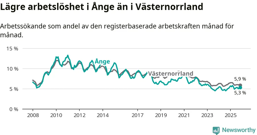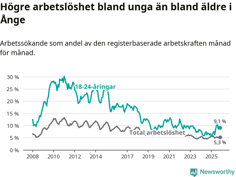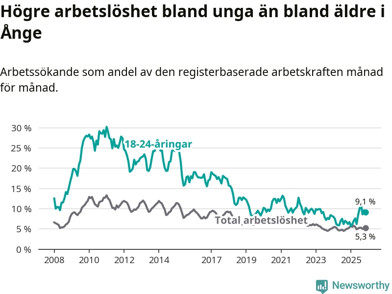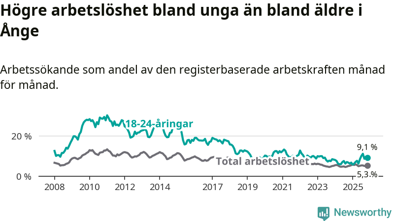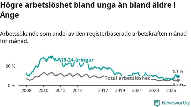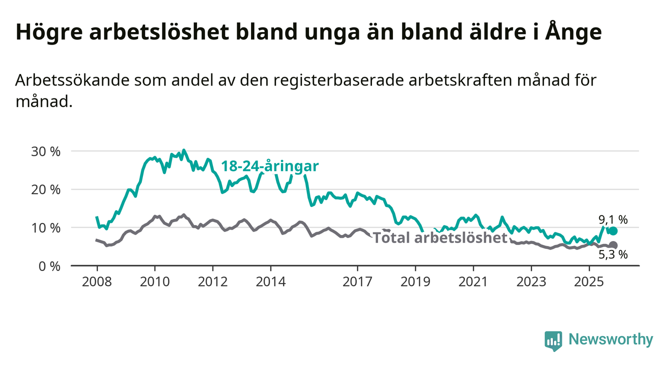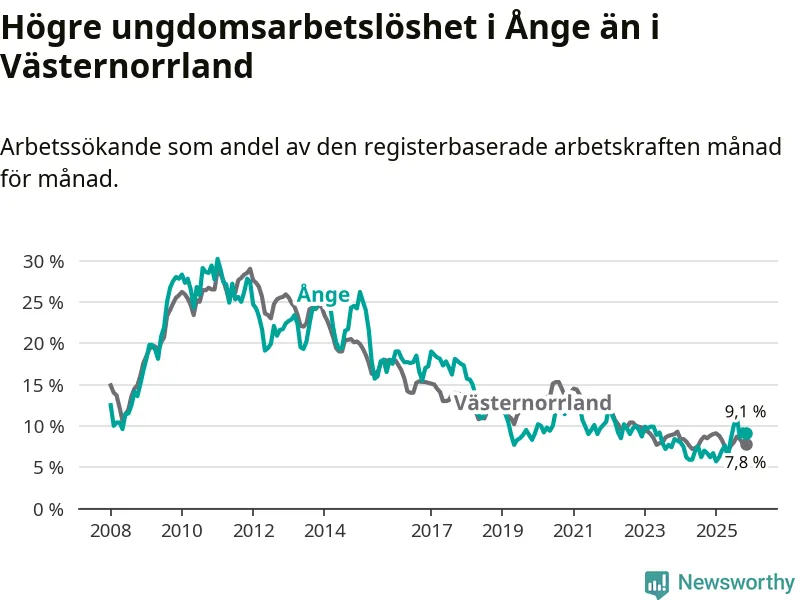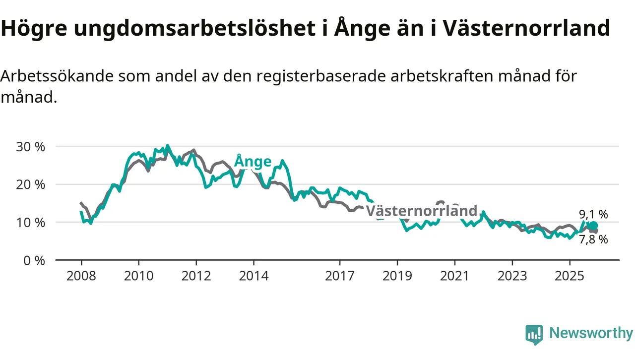Medan Ånge har lägre total arbetslöshet än Västernorrland, ligger ungdomsarbetslösheten 1,3 procentenheter högre i Ånge.