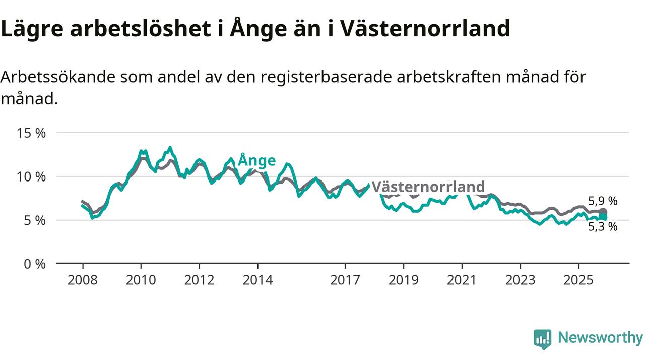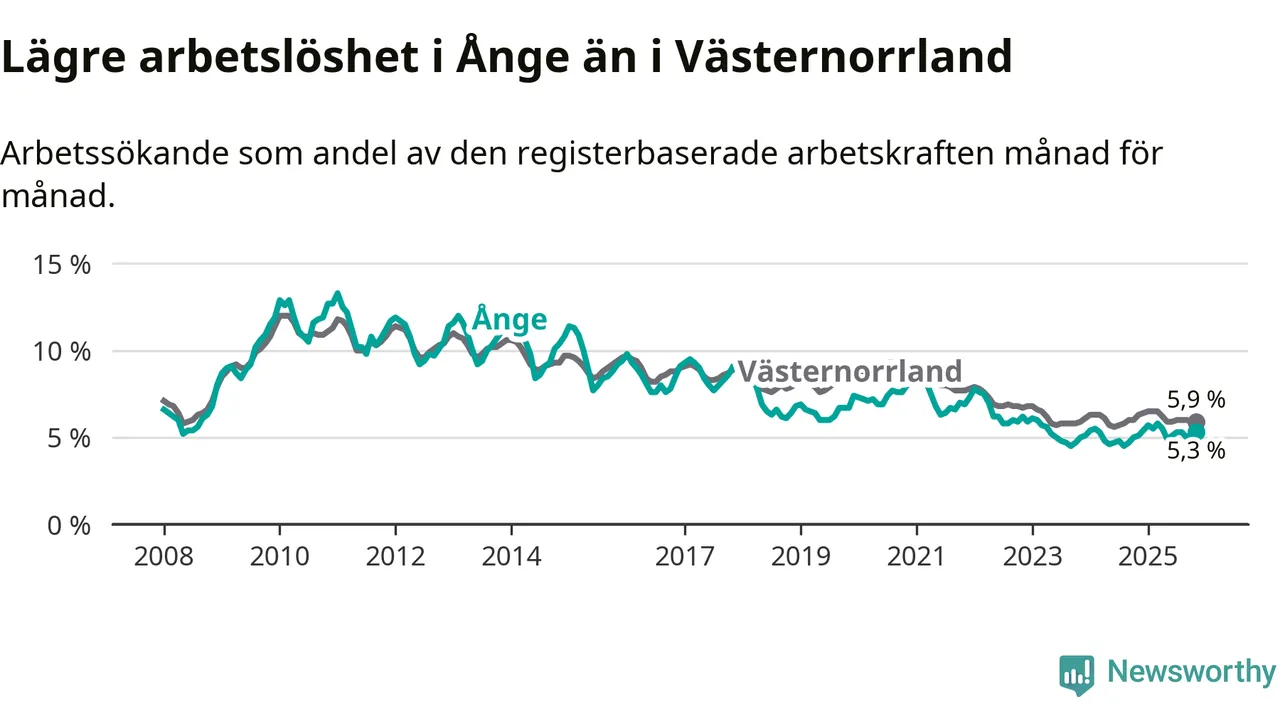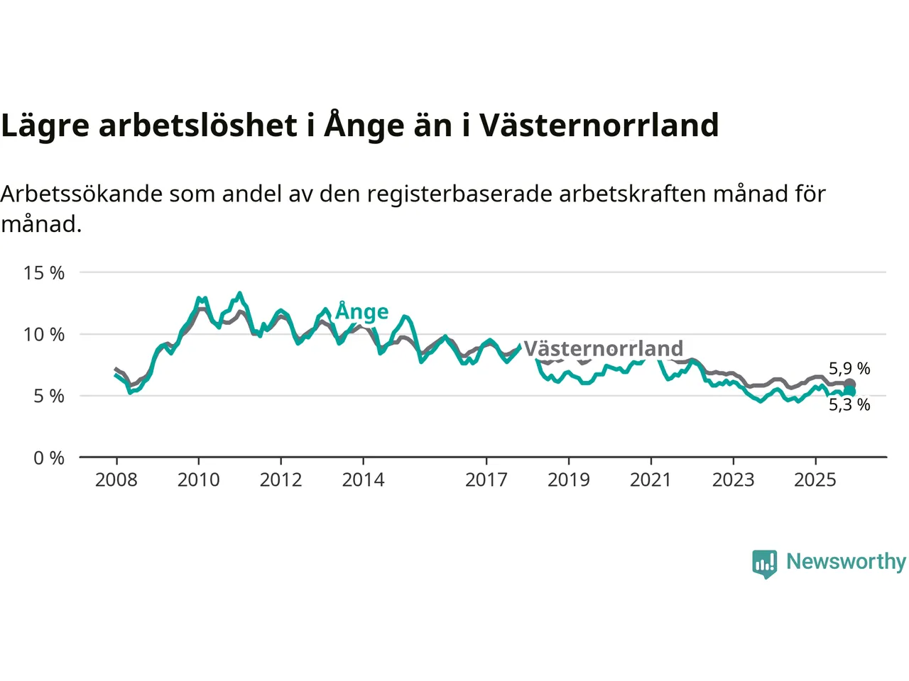Under november månad rapporterade Ånge kommun en total arbetslöshet på 5,3 procent. Det är en ökning jämfört med samma tidpunkt i fjol (+0,2 procentenheter). I Västernorrlands län däremot sjunker arbetslösheten .