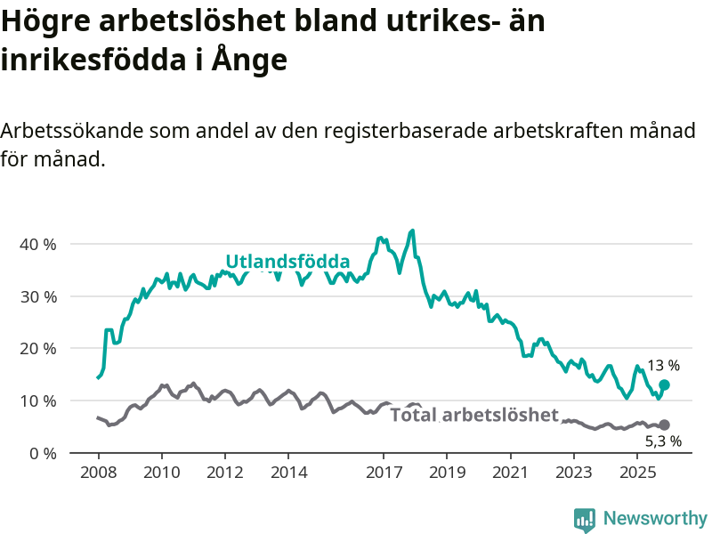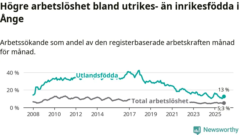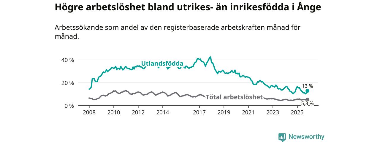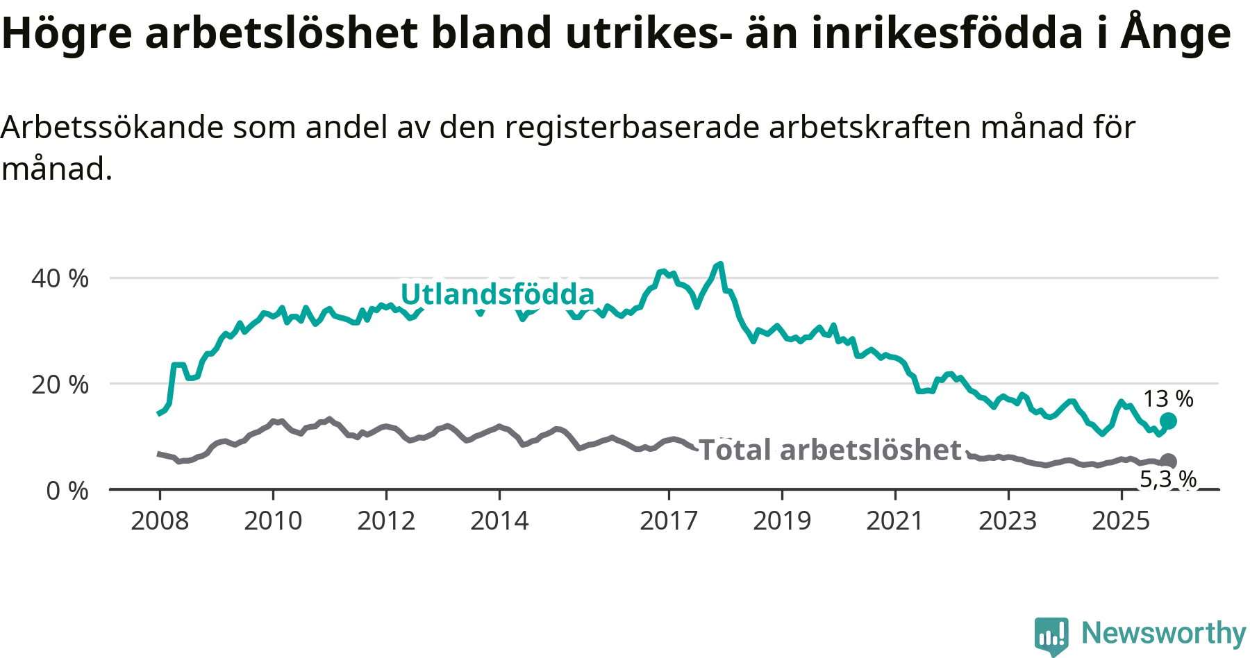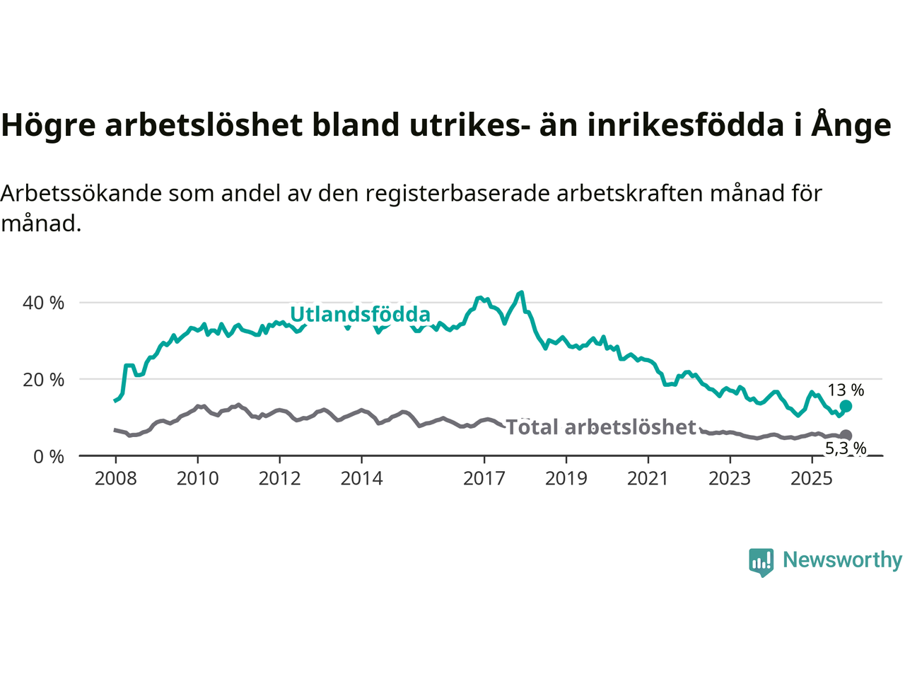 Arbetslösheten bland utlandsfödda var 13,0 procent i Ånge under november månad, motsvarande 50 av 385 personer. Det är 0,9 procentenheter fler än vid samma tidpunkt i fjol (+6 om man räknar personer). Den senaste månadens uppgång innebär ett trendbrott. Under de två föregående månaderna hade arbetslösheten bland utlandsfödda varit lägre än motsvarande tidpunkt året innan.