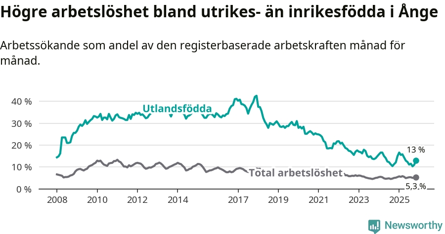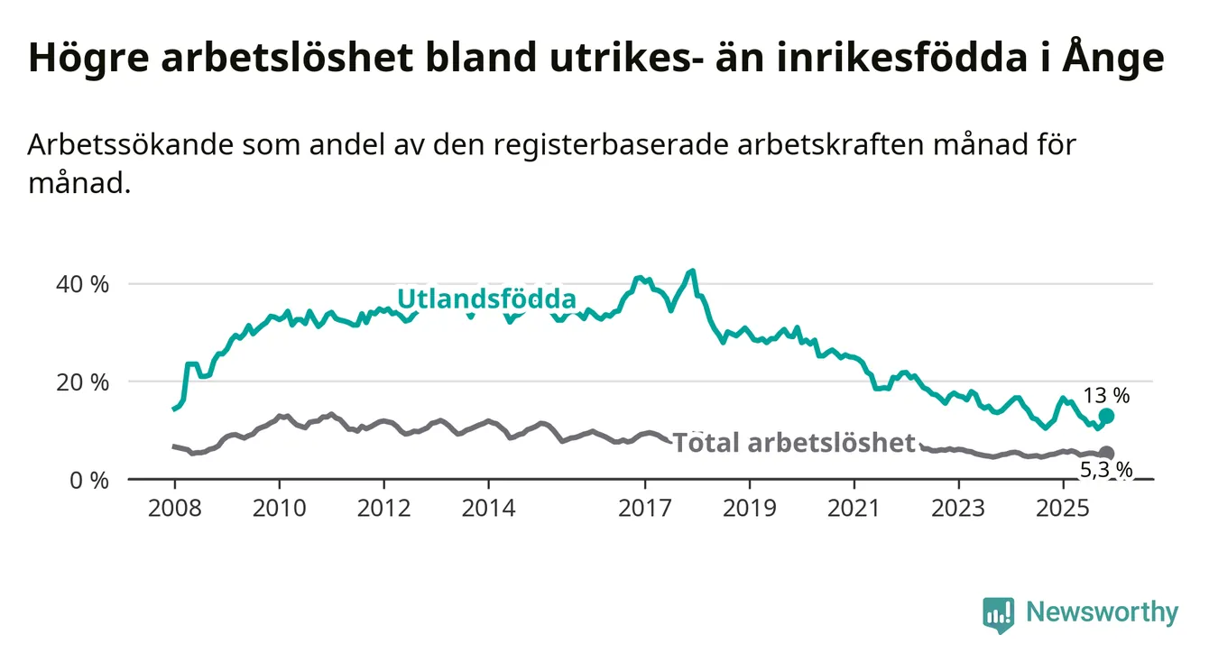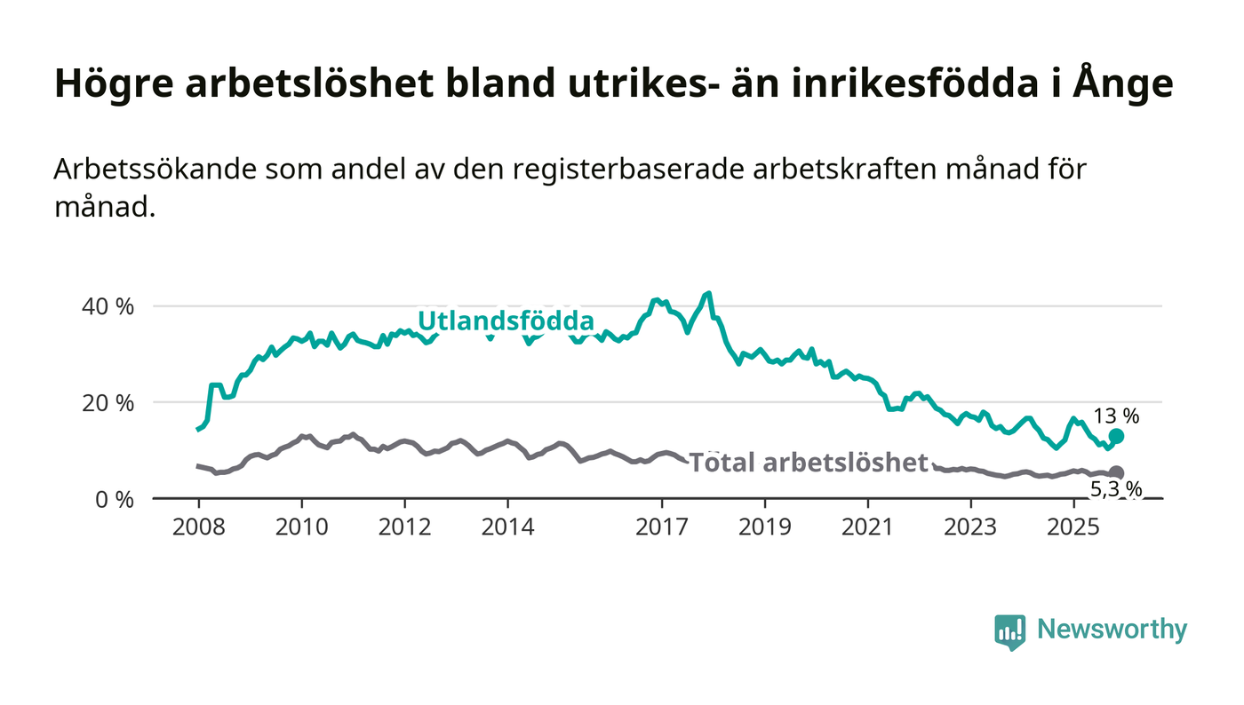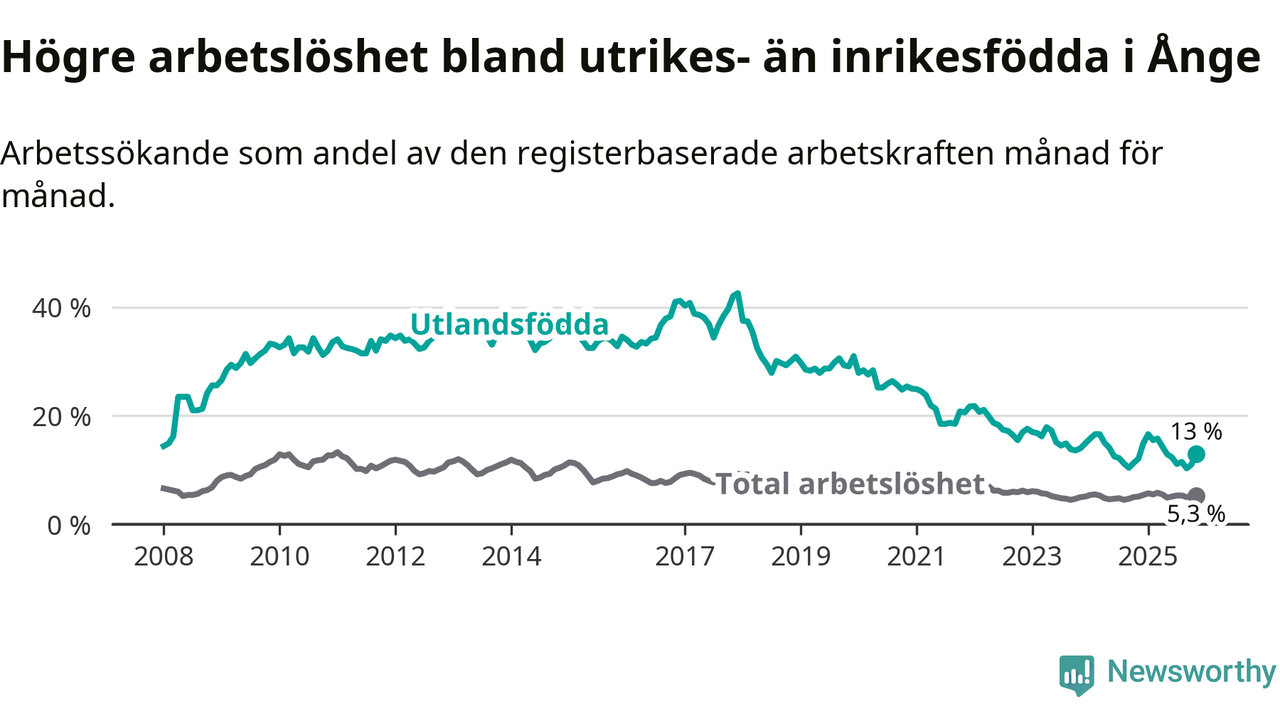 Arbetslösheten bland utlandsfödda var 13,0 procent i Ånge under november månad, motsvarande 50 av 385 personer. Det är 0,9 procentenheter fler än vid samma tidpunkt i fjol (+6 om man räknar personer). Den senaste månadens uppgång innebär ett trendbrott. Under de två föregående månaderna hade arbetslösheten bland utlandsfödda varit lägre än motsvarande tidpunkt året innan.