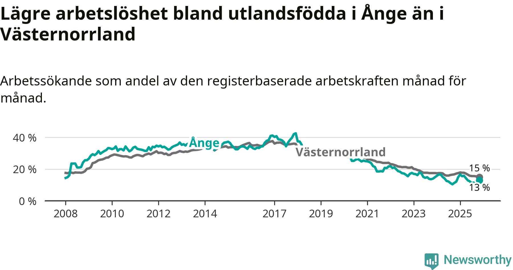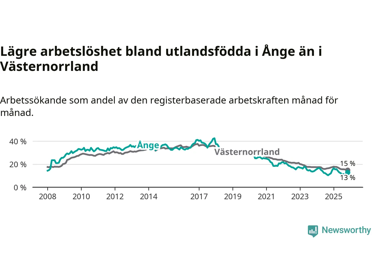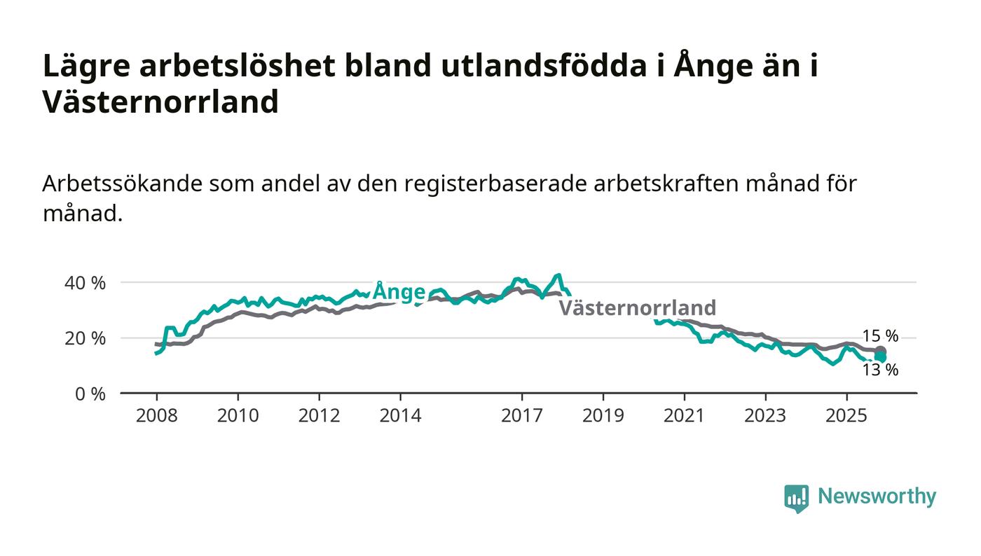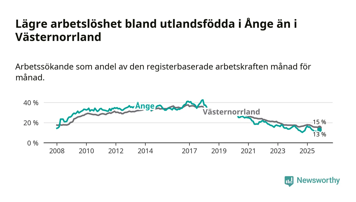 Medan arbetslösheten bland utlandsfödda alltså ökar i Ånge så minskar den i Västernorrland. Jämfört med november förra året har andelen arbetslösa utlandsfödda i länet minskat med 2,2 procentenheter (till 15,0 procent). Trots den senaste uppgången har Ånge med andra ord fortfarande lägre arbetslöshet bland utlandsfödda än Västernorrland.