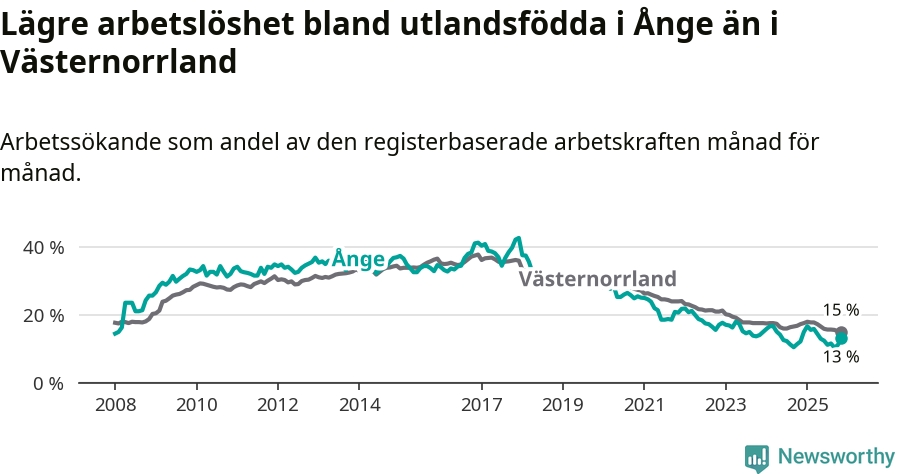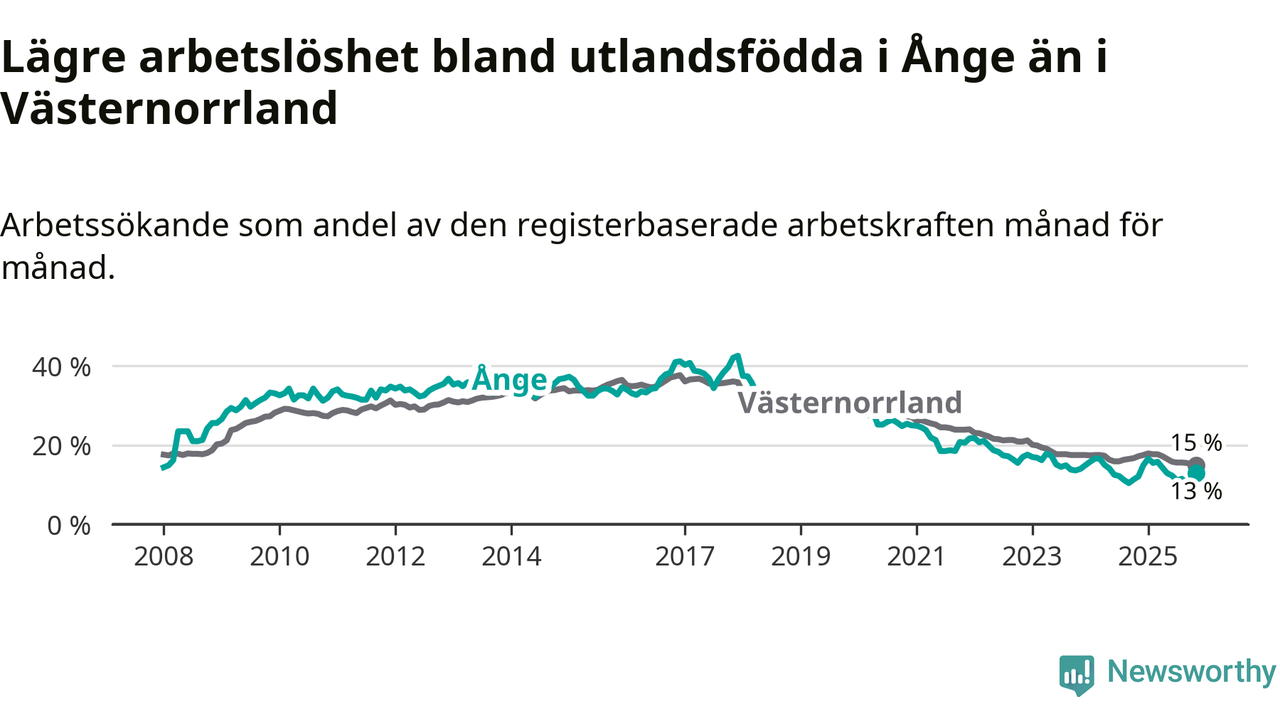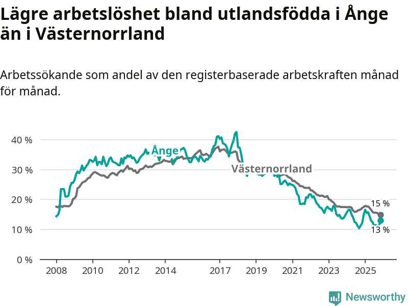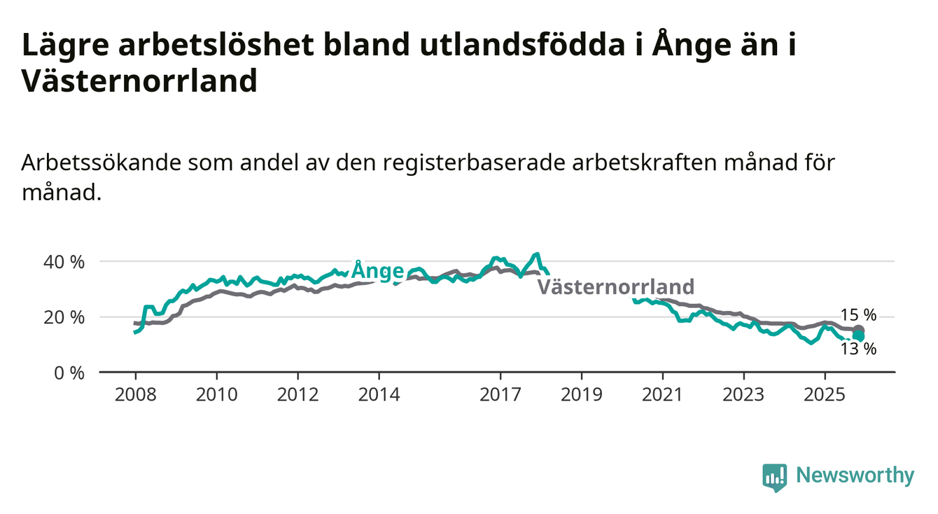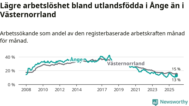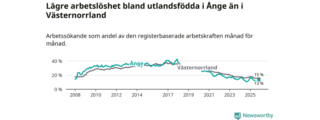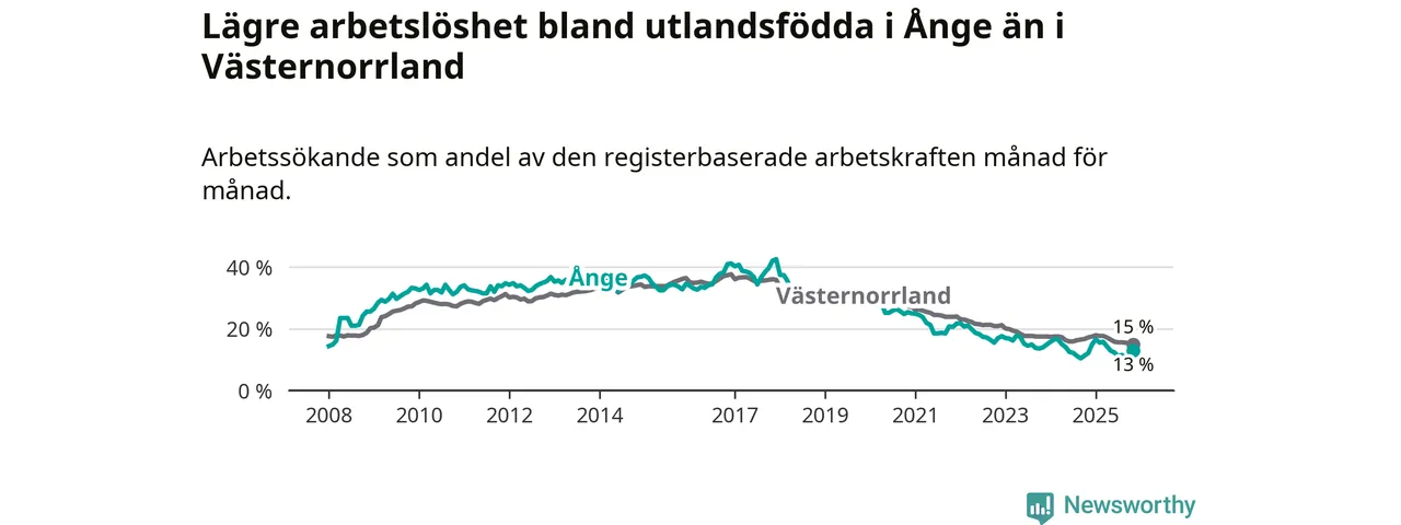 Medan arbetslösheten bland utlandsfödda alltså ökar i Ånge så minskar den i Västernorrland. Jämfört med november förra året har andelen arbetslösa utlandsfödda i länet minskat med 2,2 procentenheter (till 15,0 procent). Trots den senaste uppgången har Ånge med andra ord fortfarande lägre arbetslöshet bland utlandsfödda än Västernorrland.
