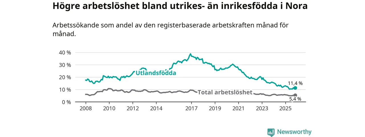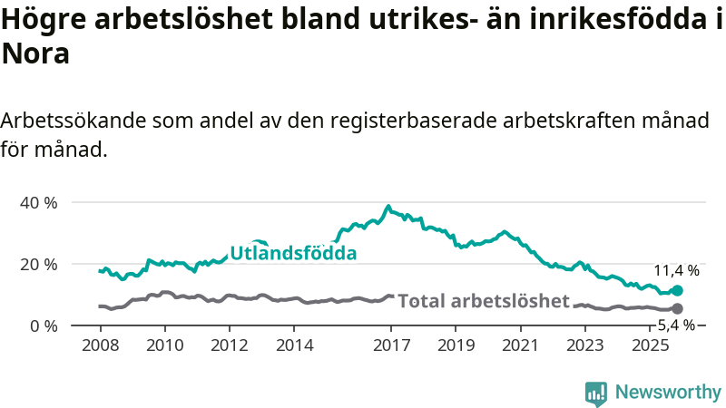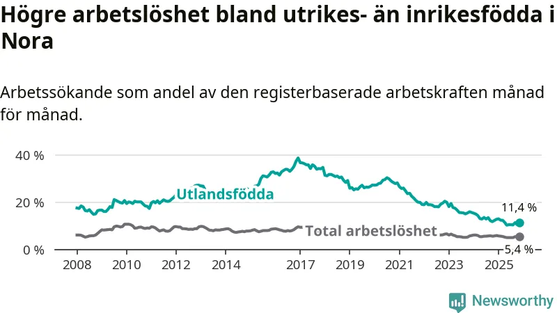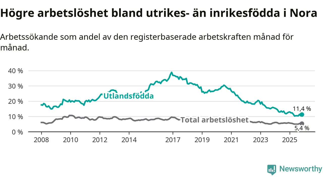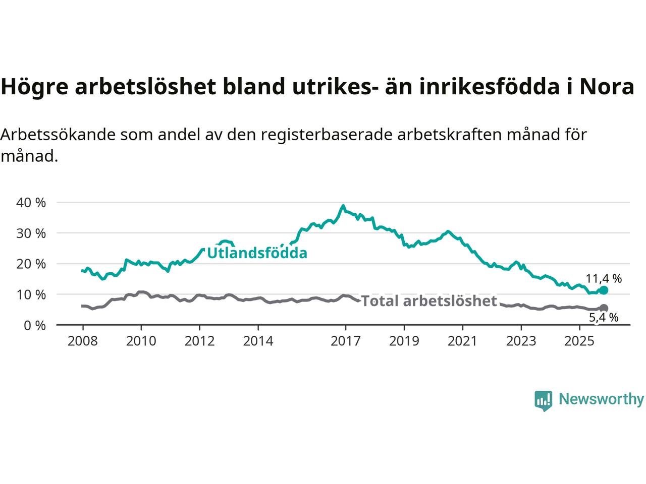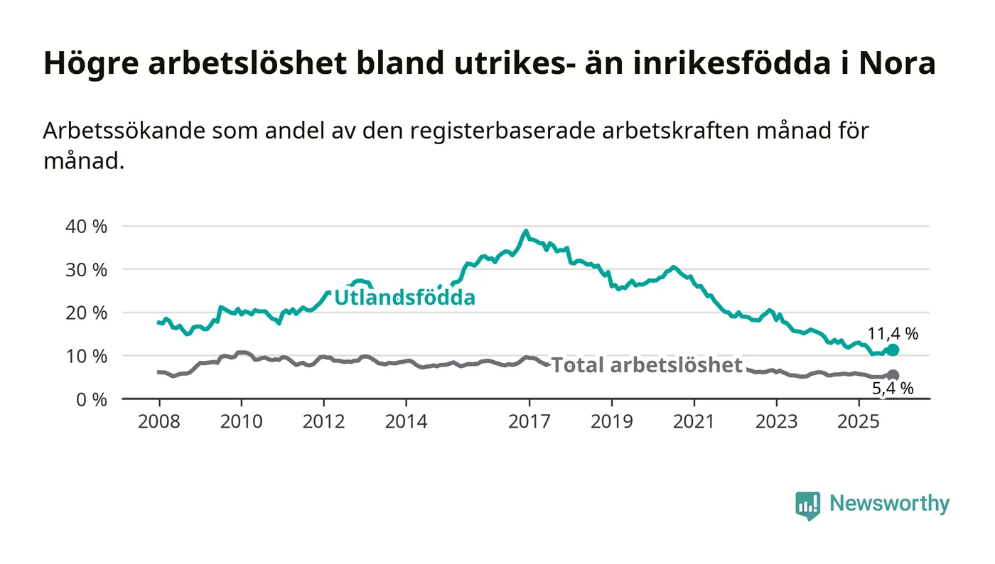 Arbetslösheten bland utlandsfödda var 11,4 procent i Nora under november månad, motsvarande 81 av 711 personer. Det är 0,9 procentenheter färre än vid samma tidpunkt i fjol (−10 om man räknar personer). Därmed har de utlandsföddas arbetslöshet varit lägre än vid samma tidpunkt i fjol i över två år i sträck. Sedan december 2022 har arbetslösheten bland utlandsfödda minskat från 20,0 till 11,4 procent.