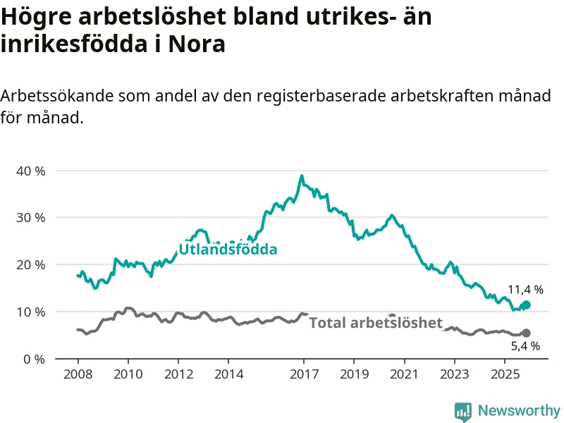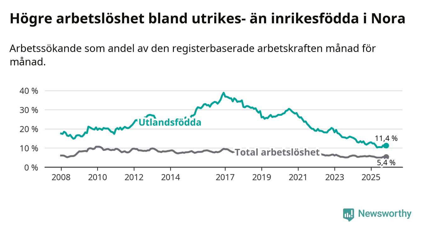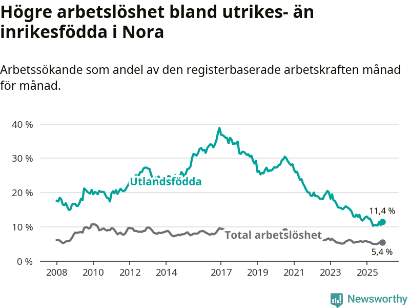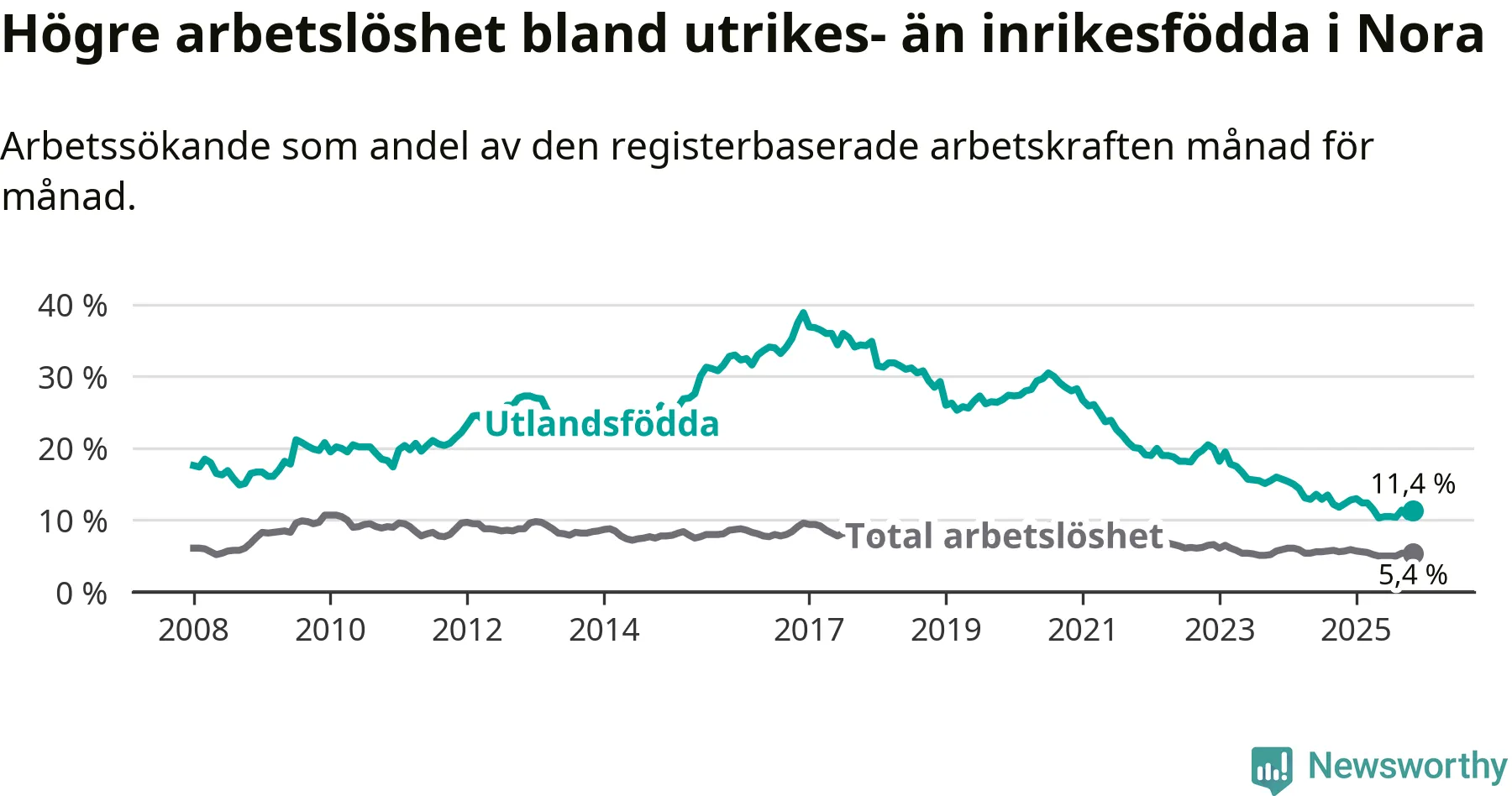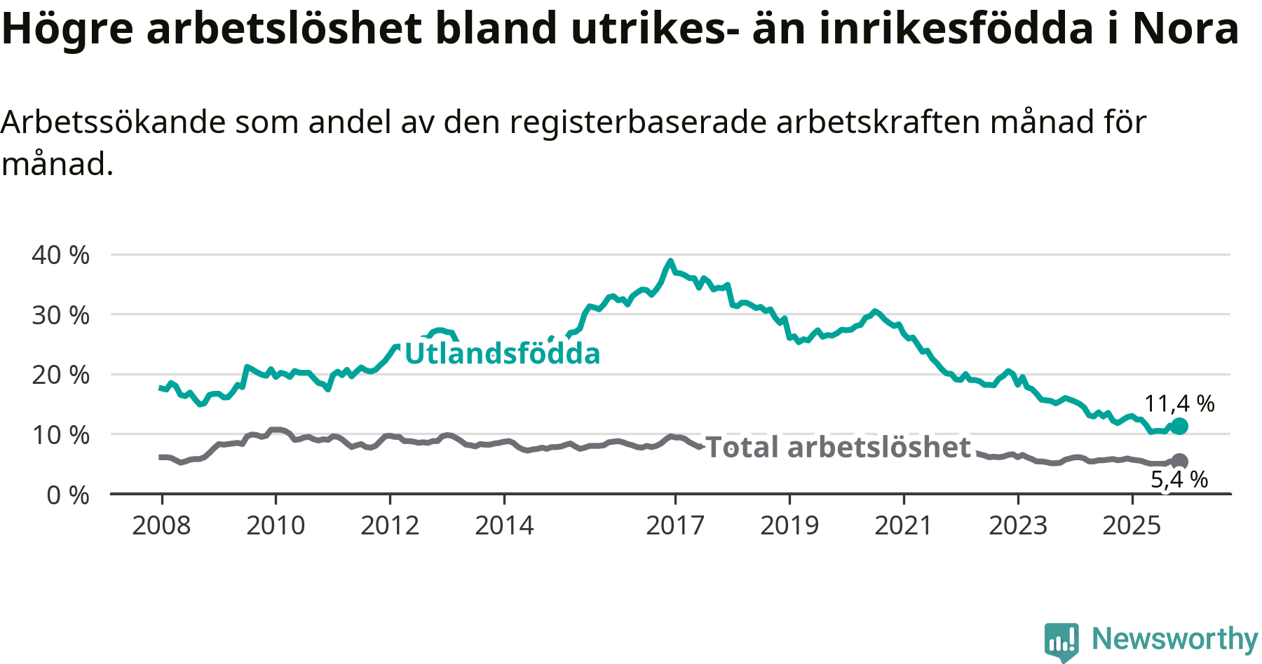 Arbetslösheten bland utlandsfödda var 11,4 procent i Nora under november månad, motsvarande 81 av 711 personer. Det är 0,9 procentenheter färre än vid samma tidpunkt i fjol (−10 om man räknar personer). Därmed har de utlandsföddas arbetslöshet varit lägre än vid samma tidpunkt i fjol i över två år i sträck. Sedan december 2022 har arbetslösheten bland utlandsfödda minskat från 20,0 till 11,4 procent.