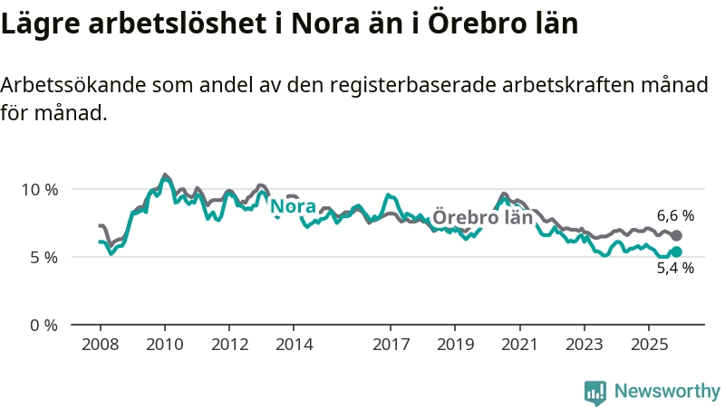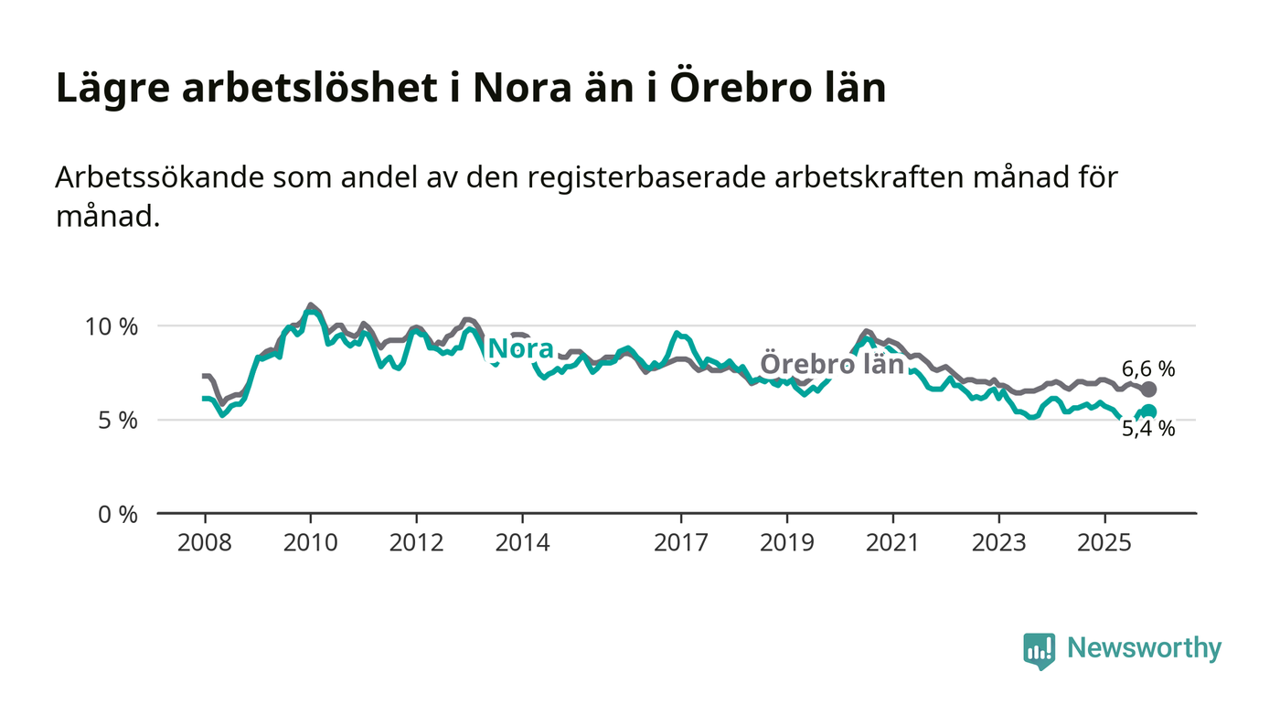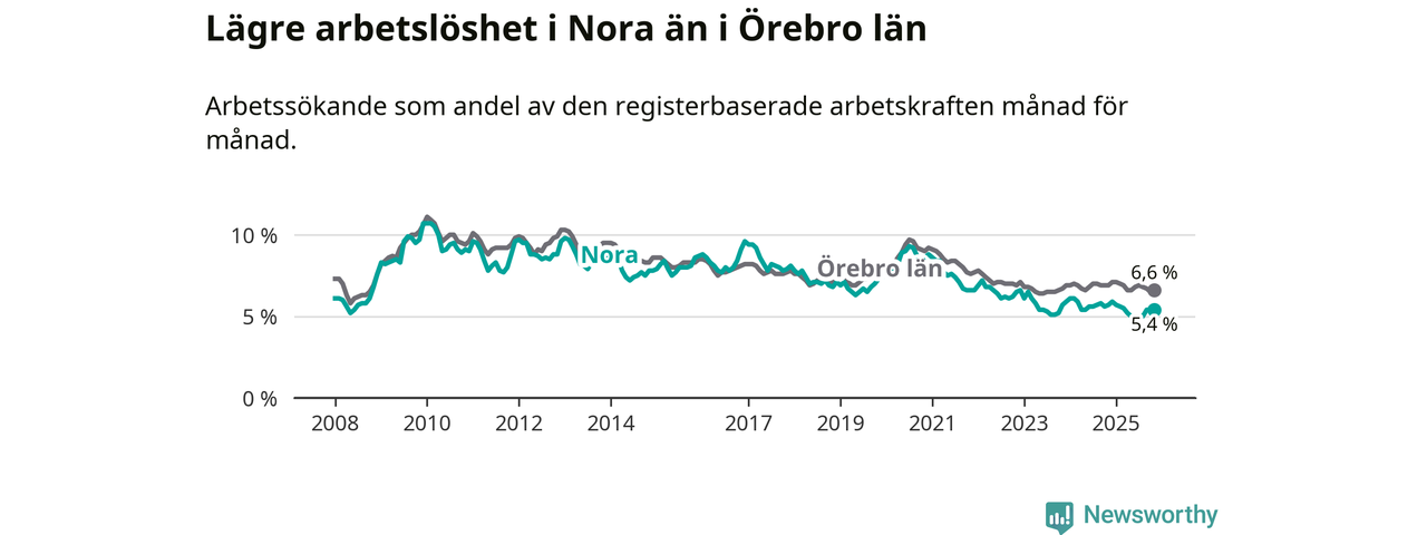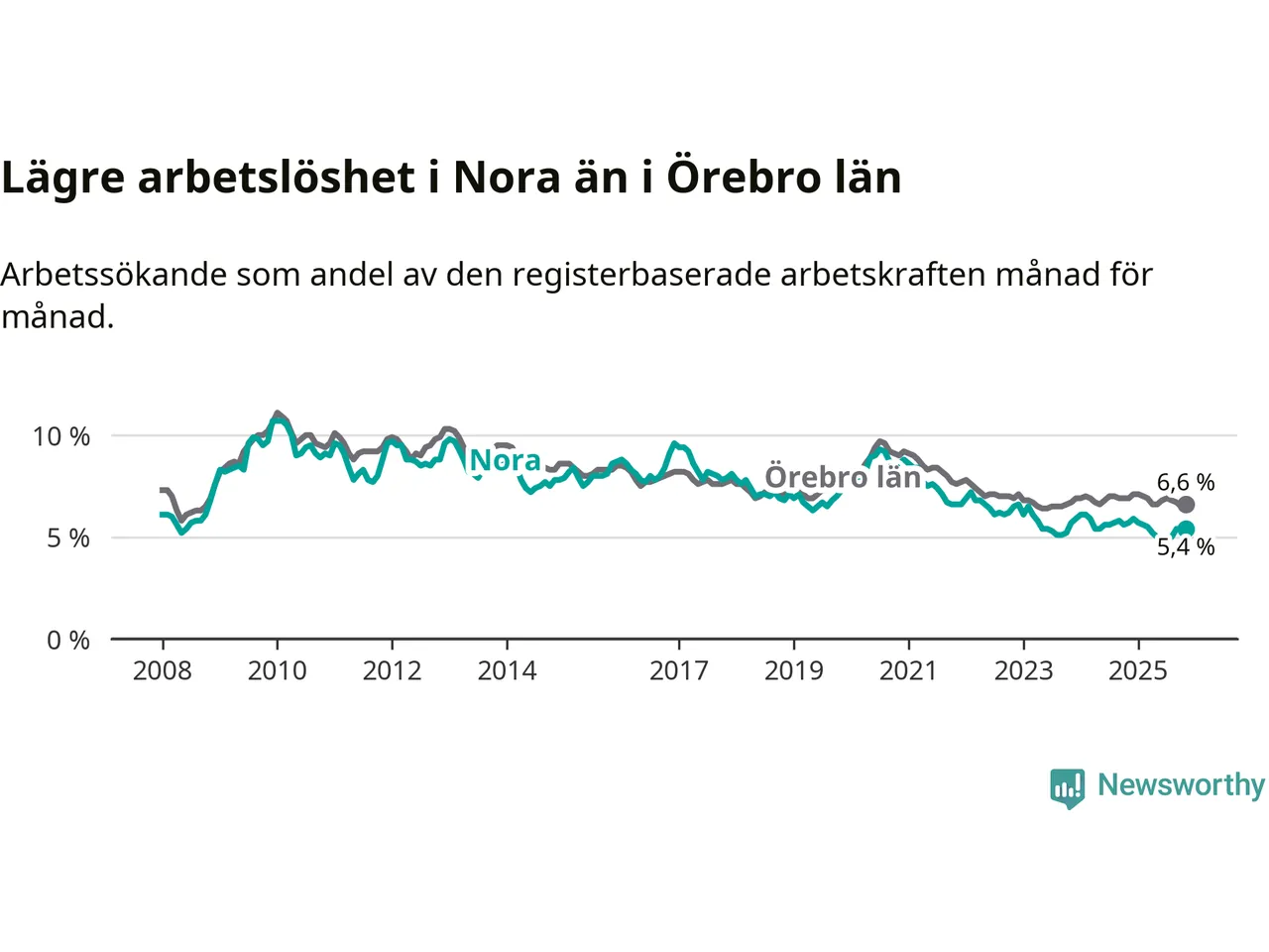 Under november månad rapporterade Nora kommun en total arbetslöshet på 5,4 procent. Det är en minskning jämfört med samma tidpunkt i fjol (−0,3 procentenheter). Även i Örebro län sjunker arbetslösheten .