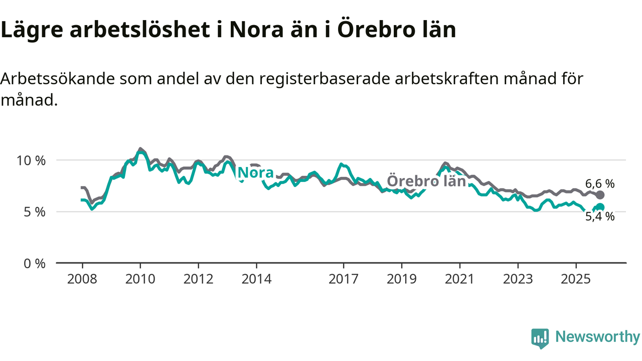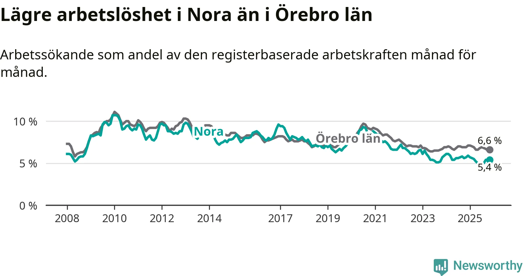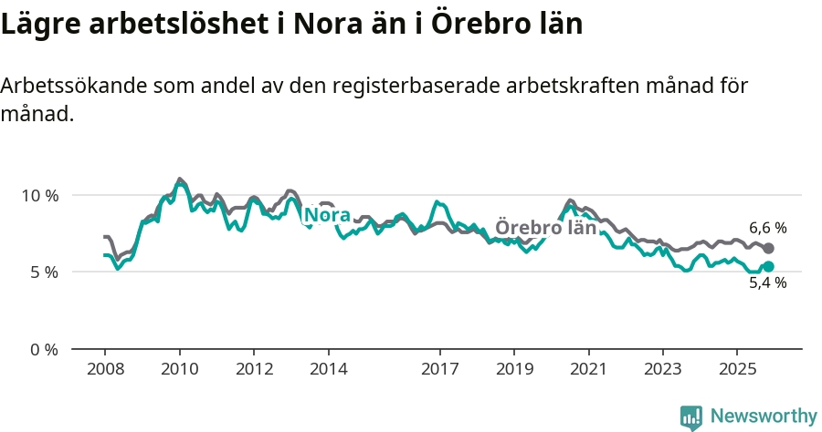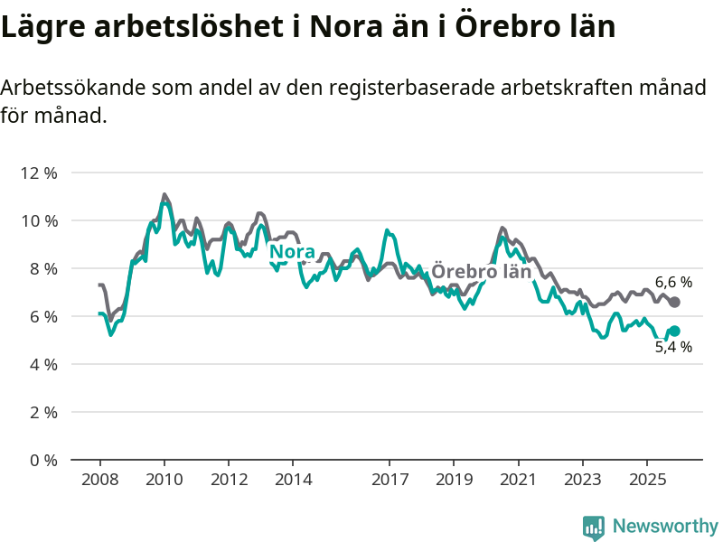 Under november månad rapporterade Nora kommun en total arbetslöshet på 5,4 procent. Det är en minskning jämfört med samma tidpunkt i fjol (−0,3 procentenheter). Även i Örebro län sjunker arbetslösheten .