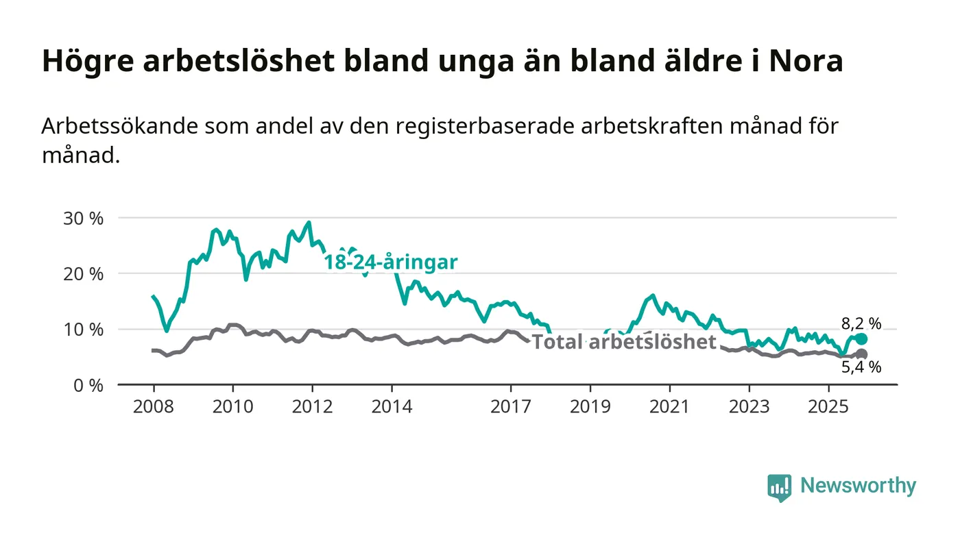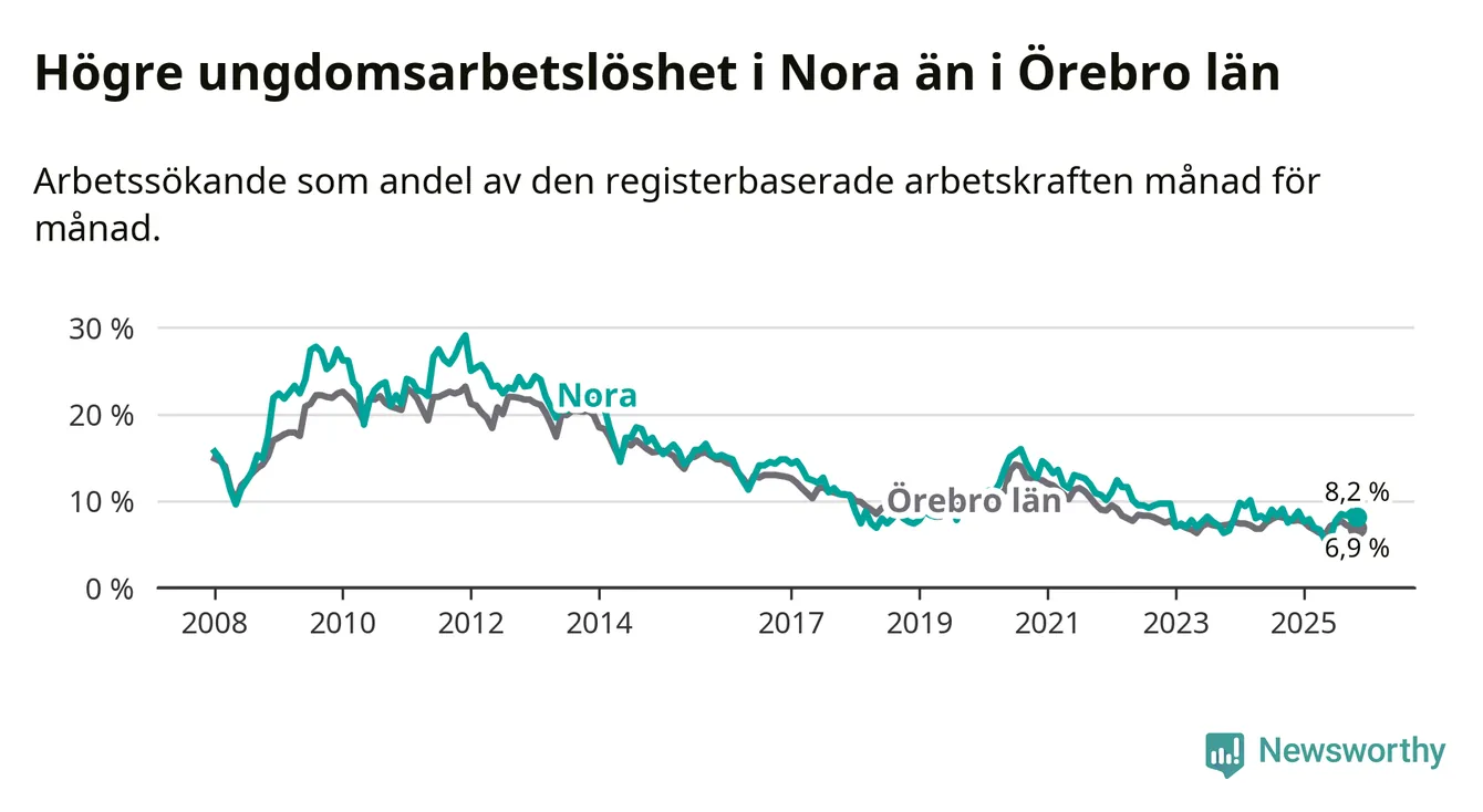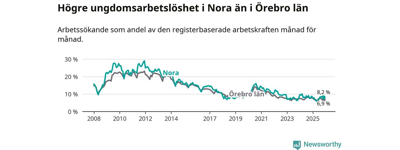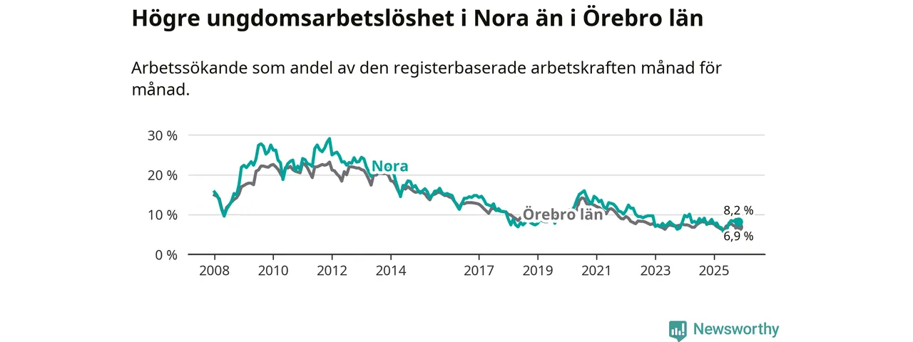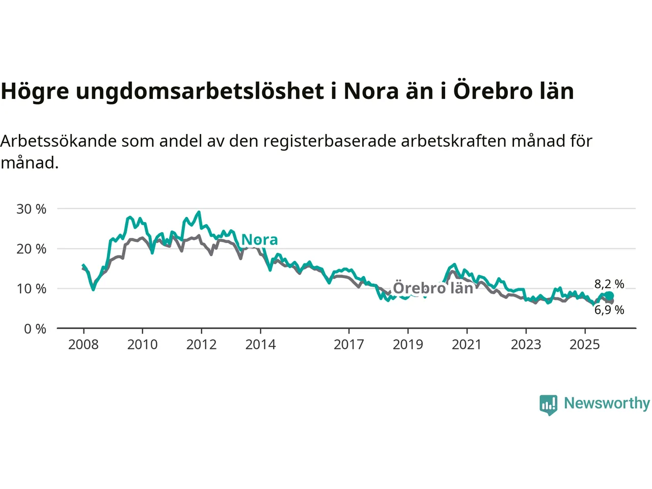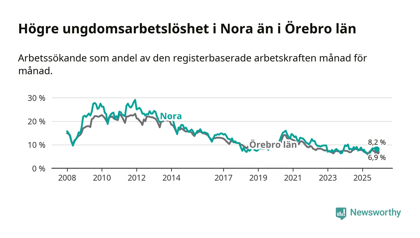 Medan Nora har lägre total arbetslöshet än Örebro, ligger ungdomsarbetslösheten 1,3 procentenheter högre i Nora.