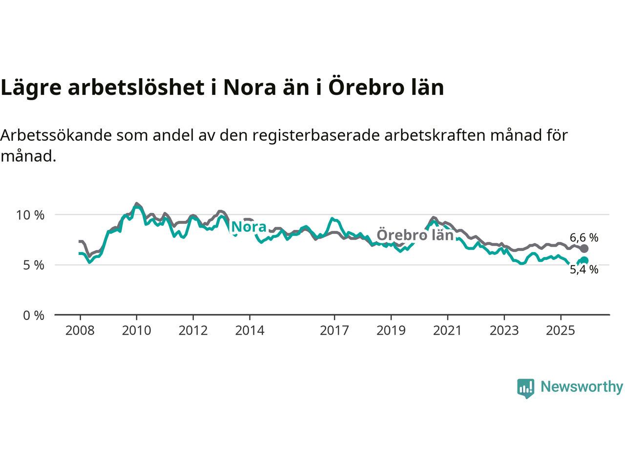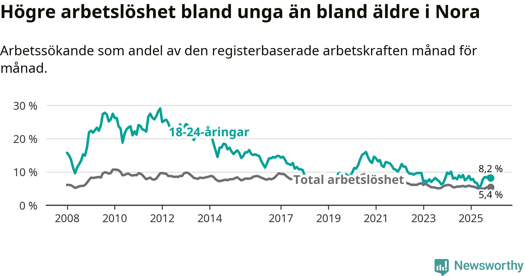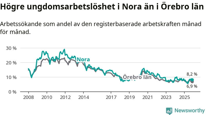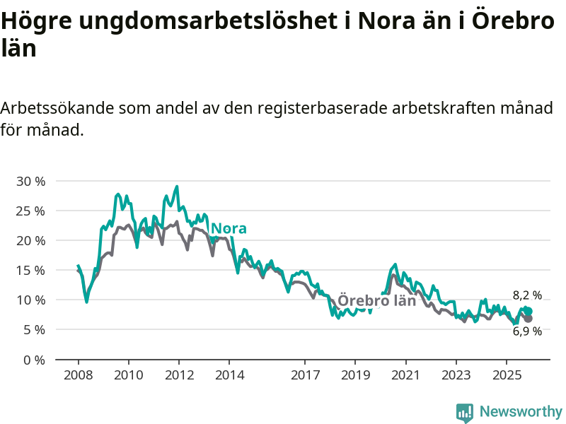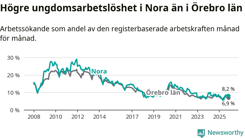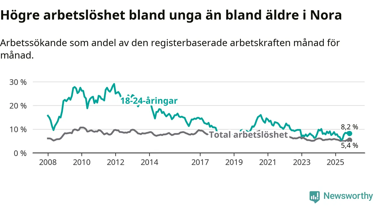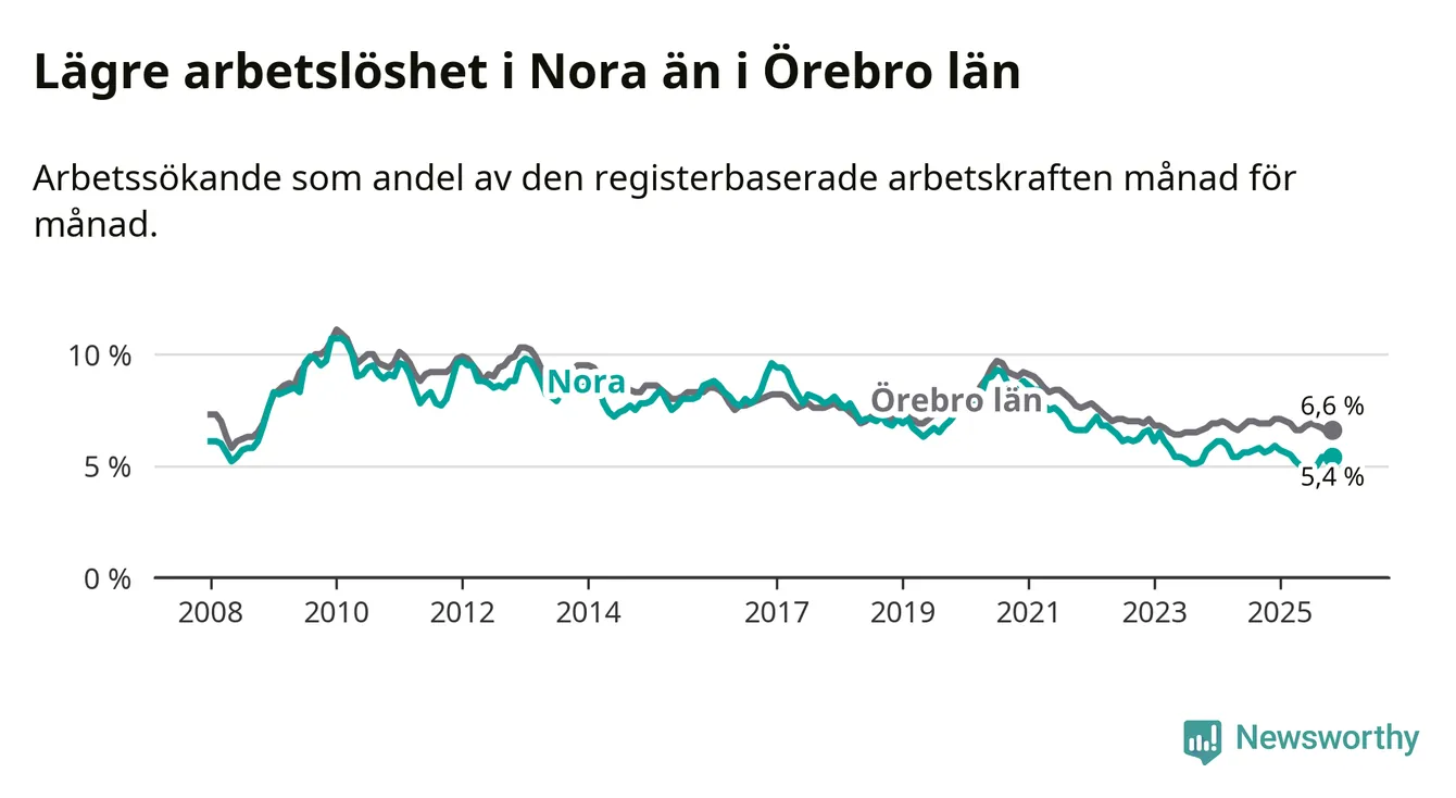 Medan Nora har lägre total arbetslöshet än Örebro, ligger ungdomsarbetslösheten 1,3 procentenheter högre i Nora.