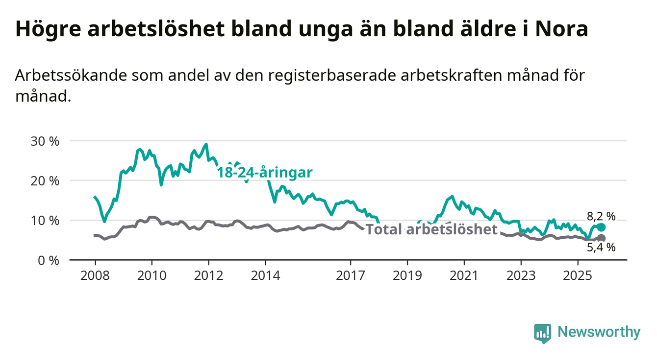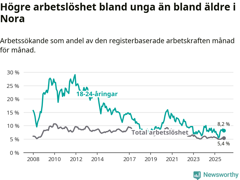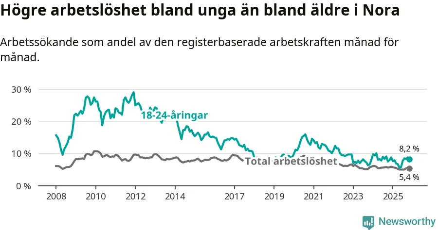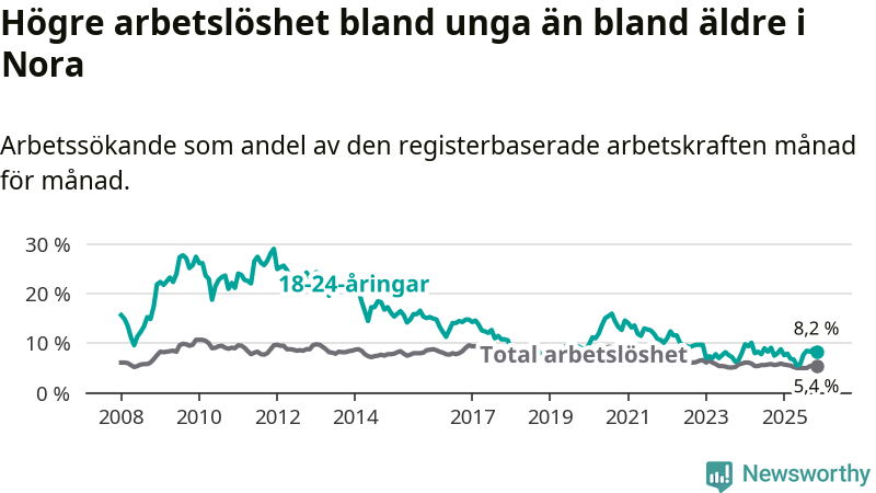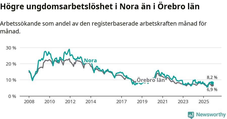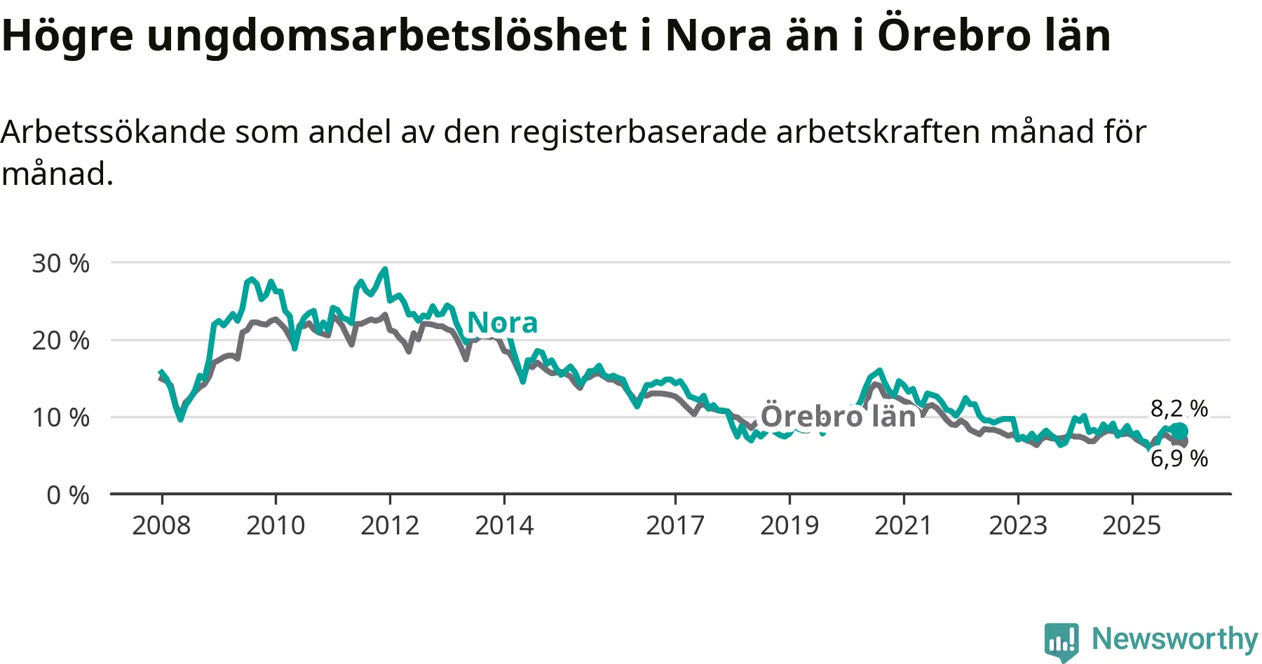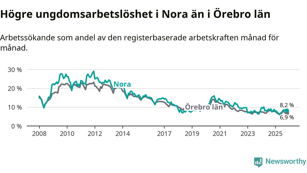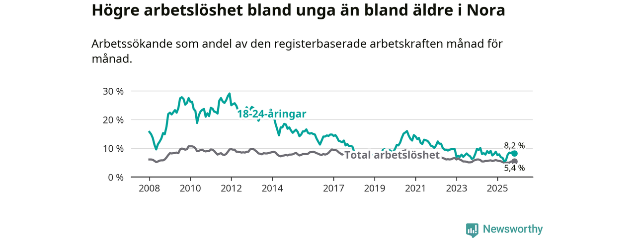 Medan Nora har lägre total arbetslöshet än Örebro, ligger ungdomsarbetslösheten 1,3 procentenheter högre i Nora.