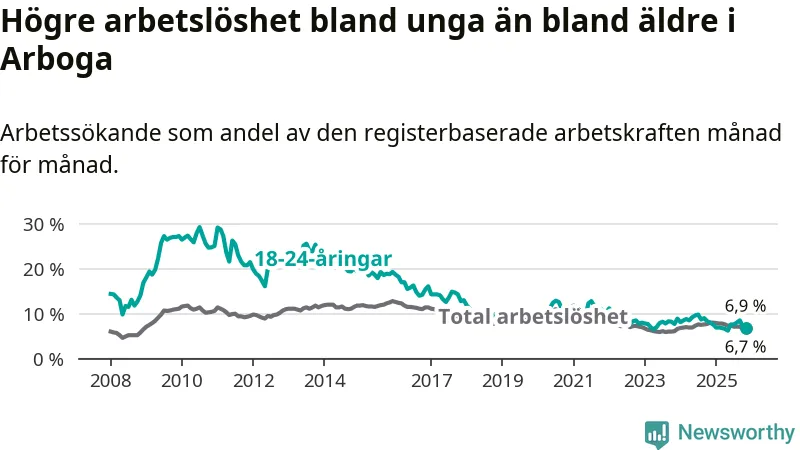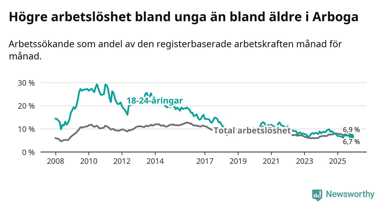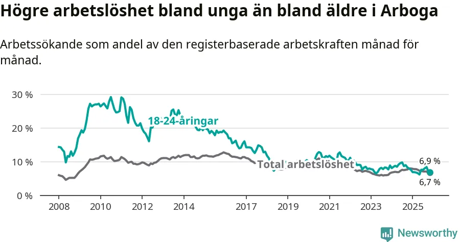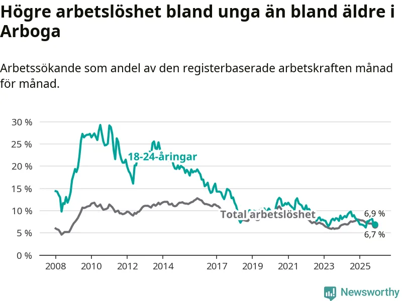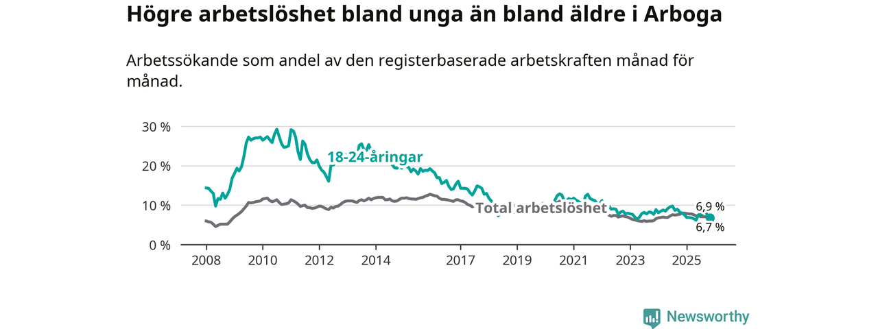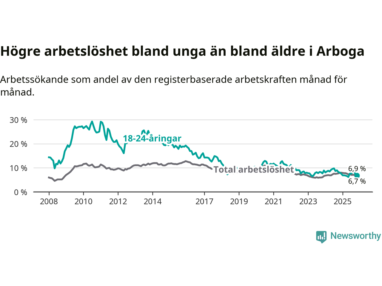 I och med den senaste månadens nedgång har de ungas arbetslöshet i Arboga sjunkit tolv månader i följd (ner från 8,0 procent i november 2024 till 6,9 procent nu).