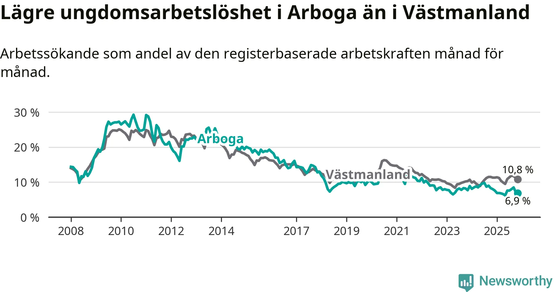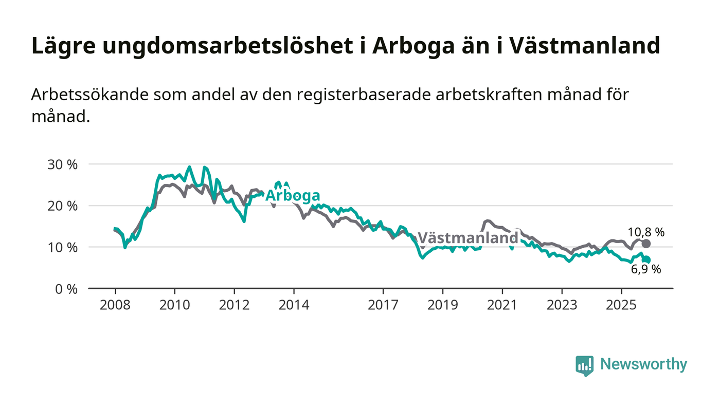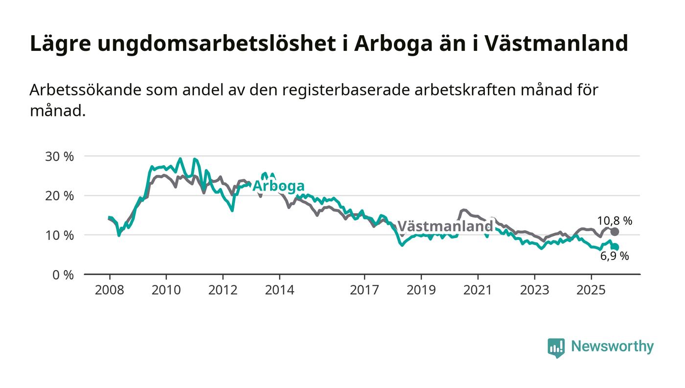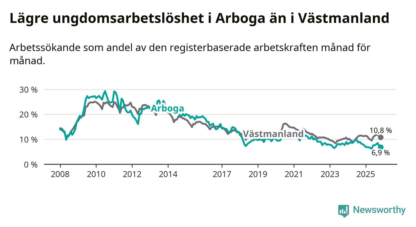 Graf: Arbetslöshet bland unga i Arboga kommun och Västmanlands län