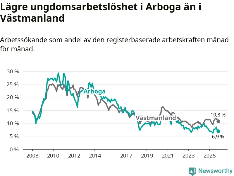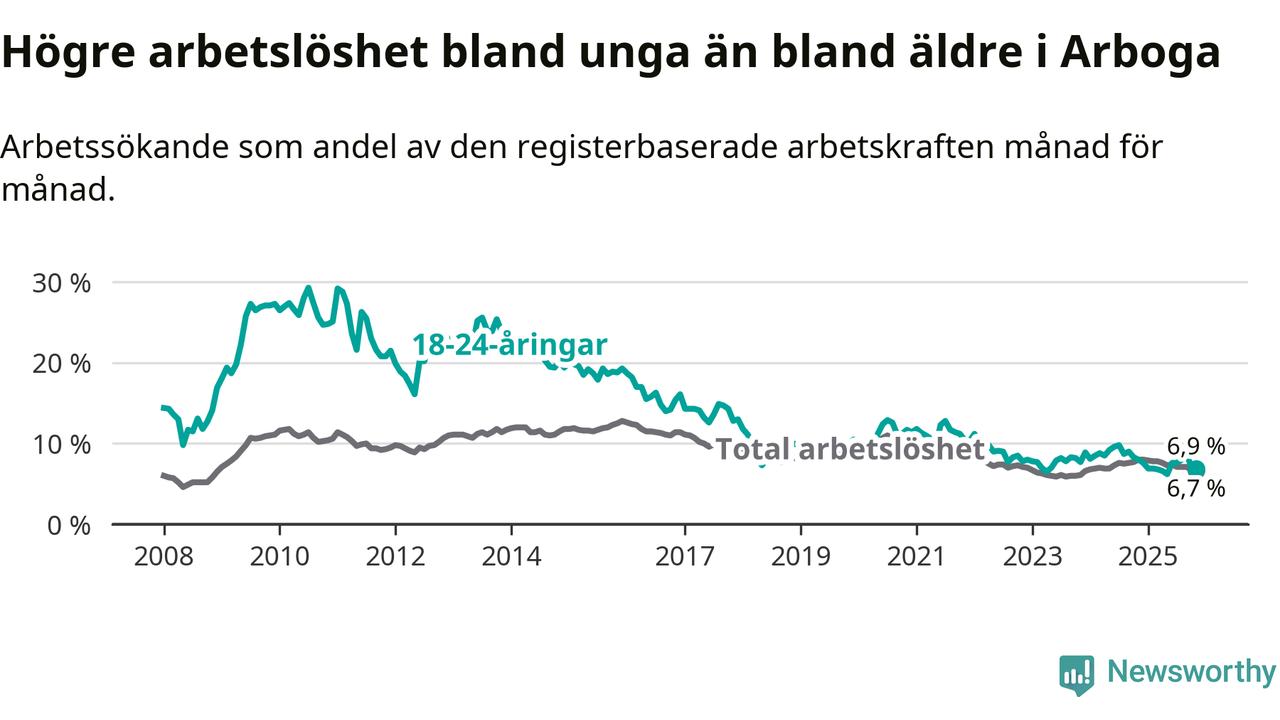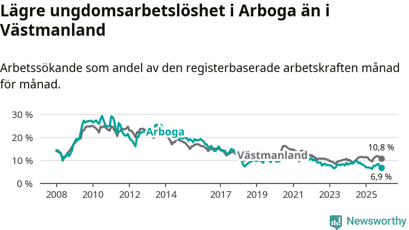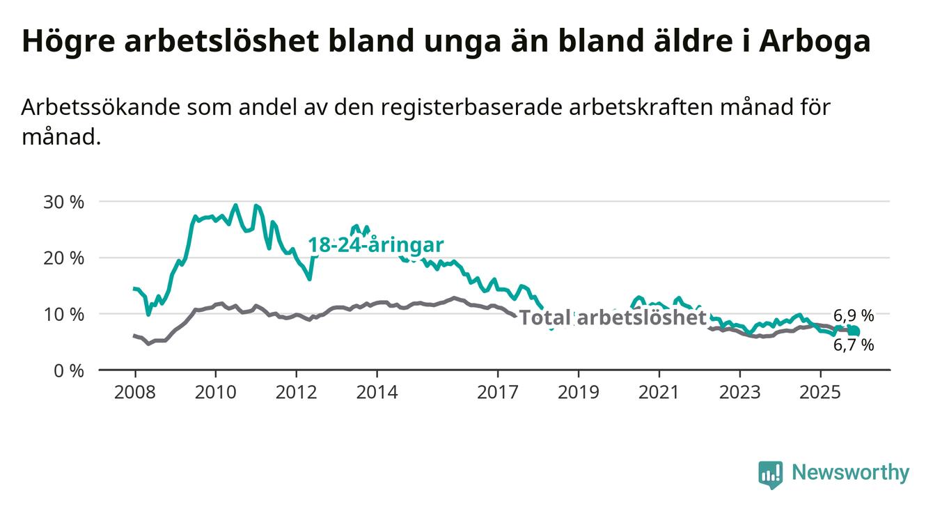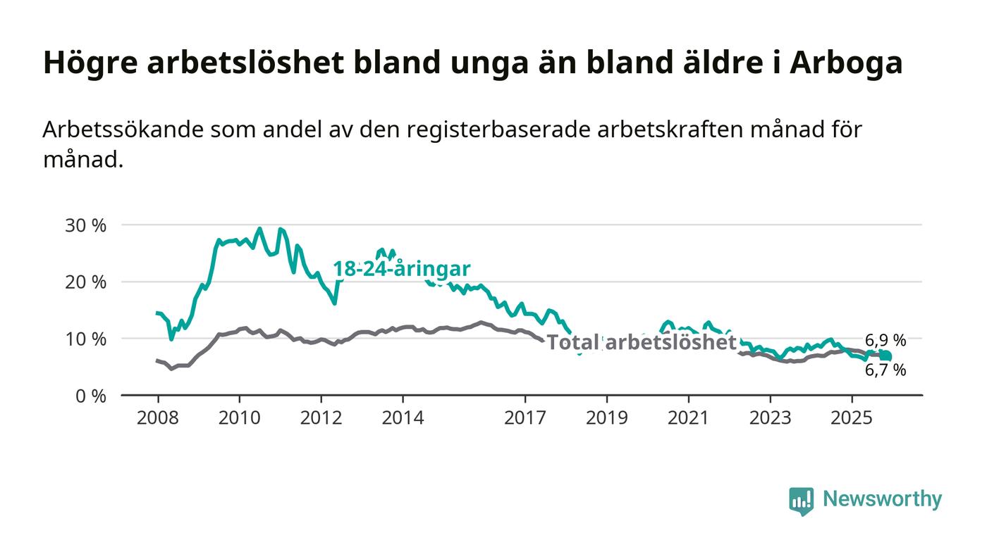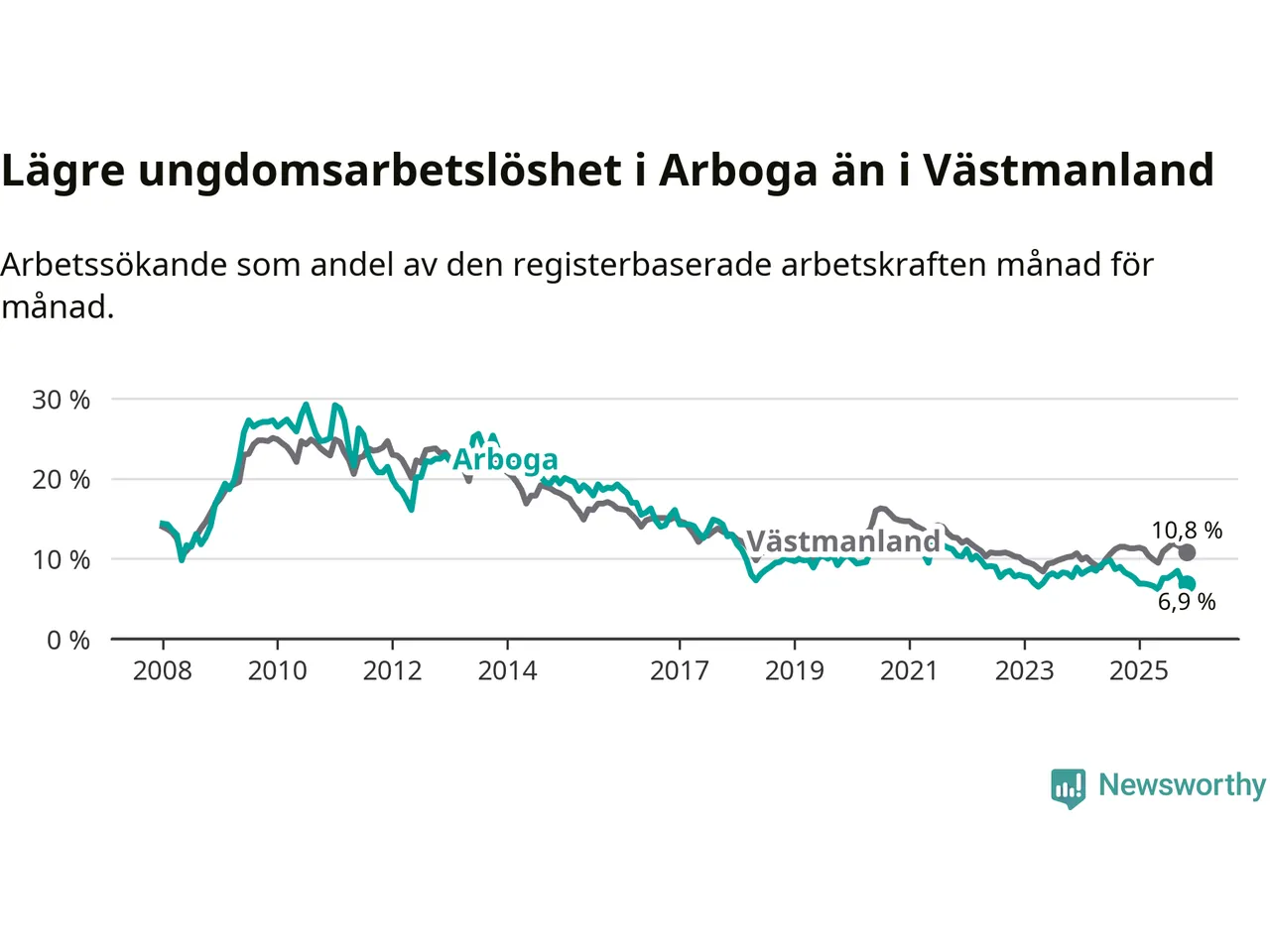 Graf: Arbetslöshet bland unga i Arboga kommun och Västmanlands län