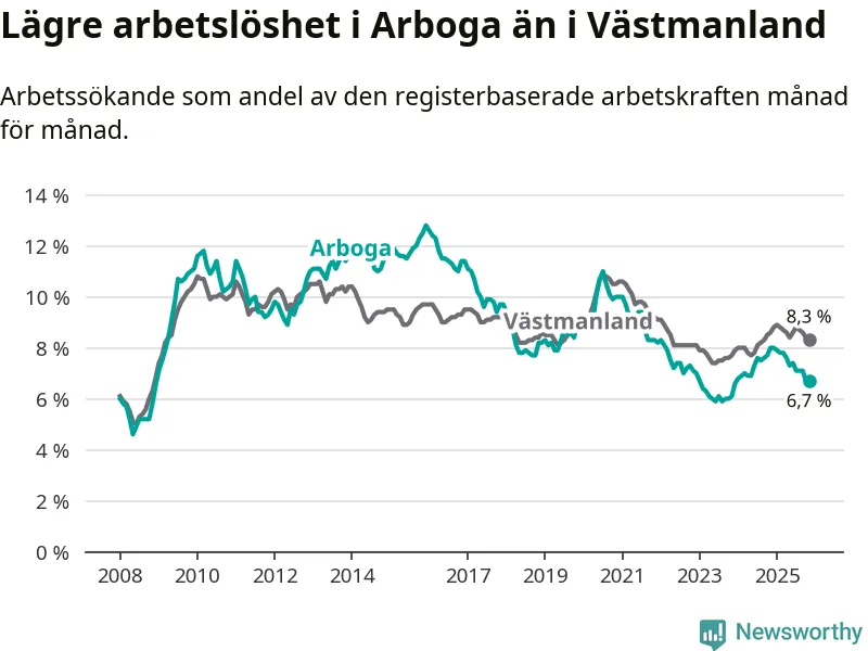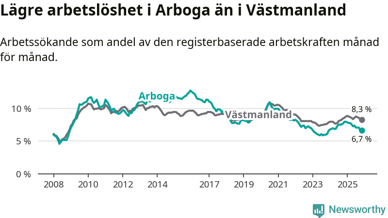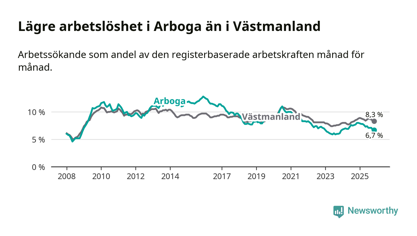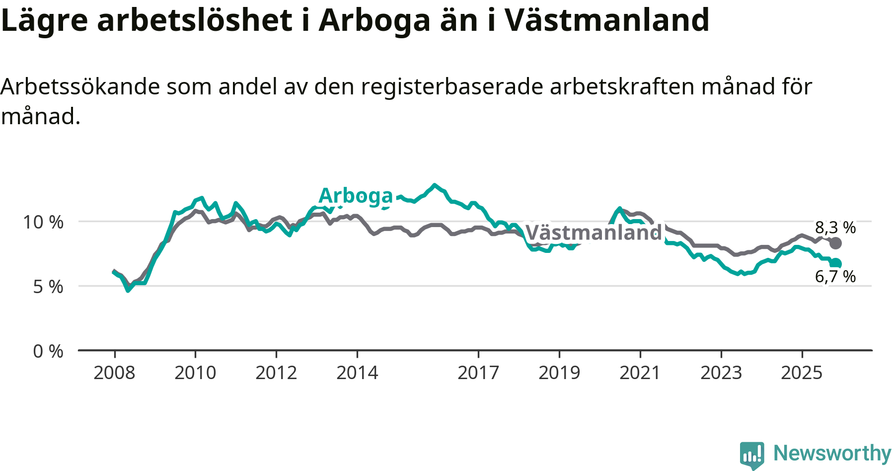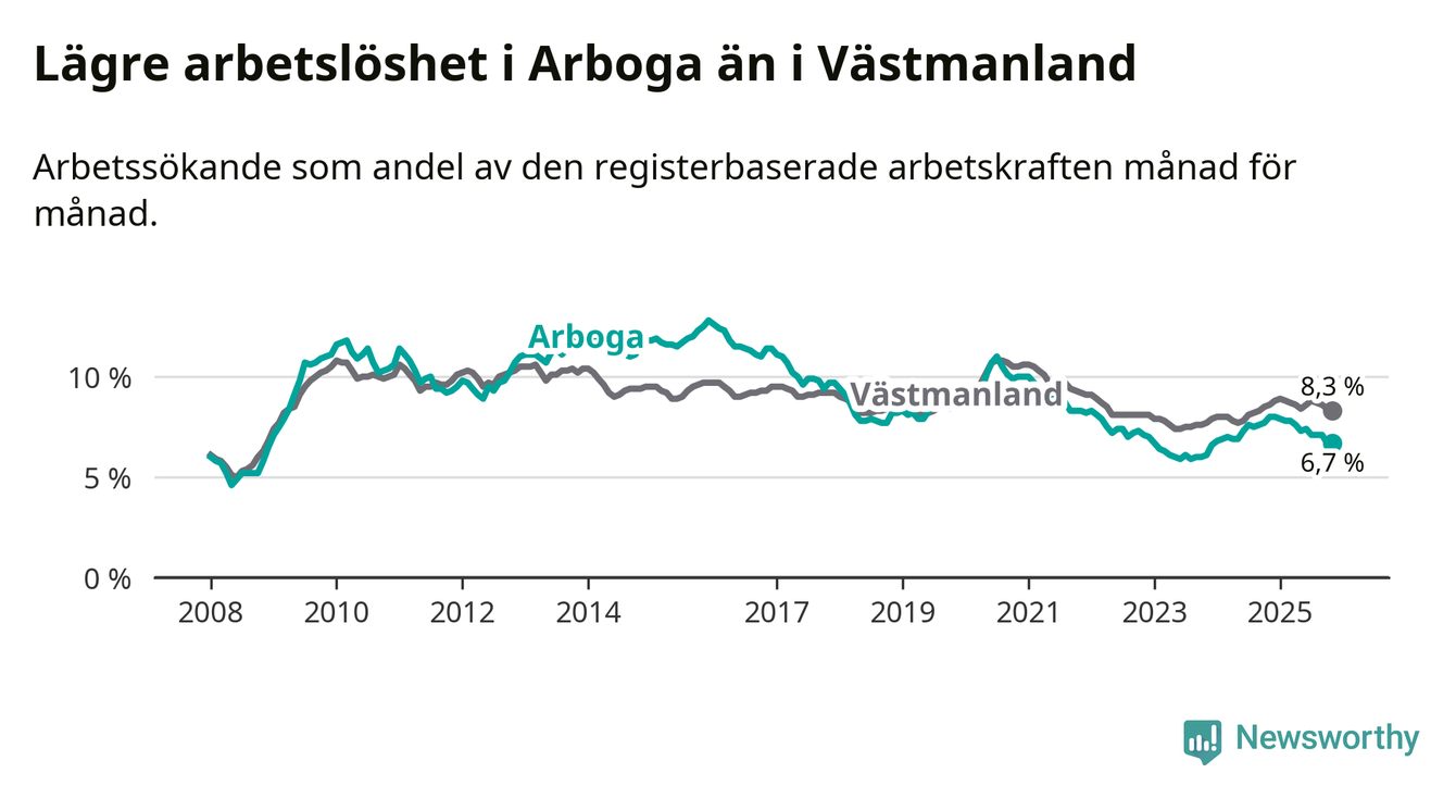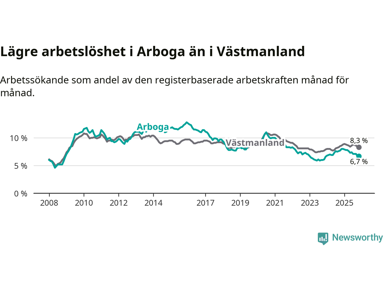 Graf: Arbetslöshet i Arboga kommun och Västmanlands län