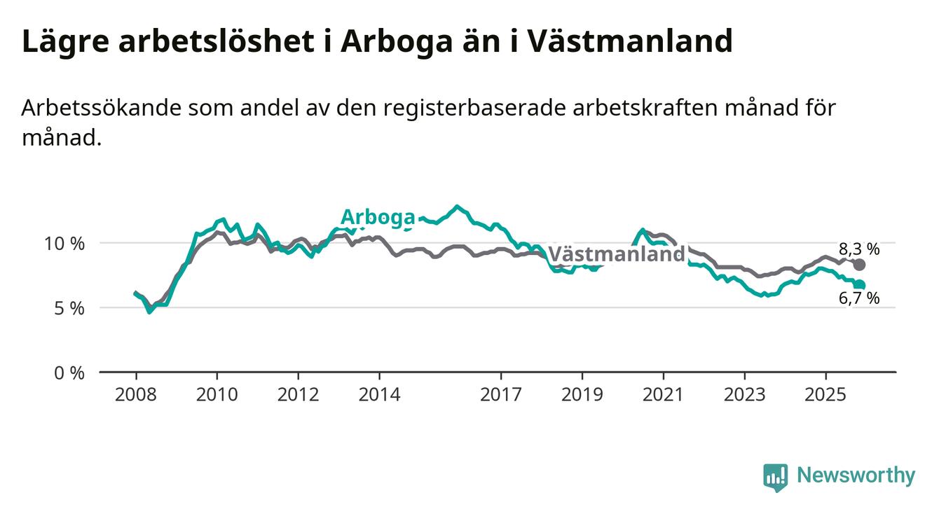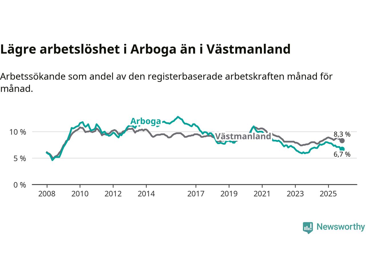 Under november månad rapporterade Arboga kommun en total arbetslöshet på 6,7 procent. Det är en minskning jämfört med samma tidpunkt i fjol (−1,3 procentenheter). Även i Västmanlands län sjunker arbetslösheten .