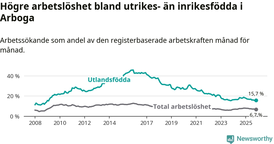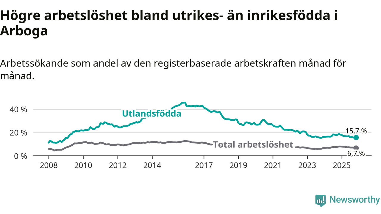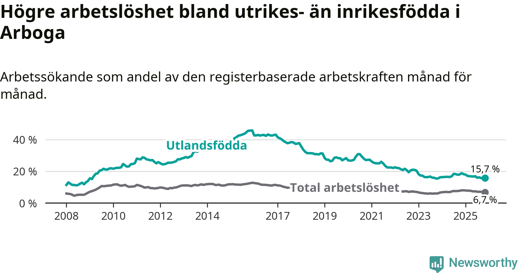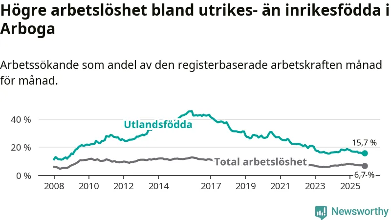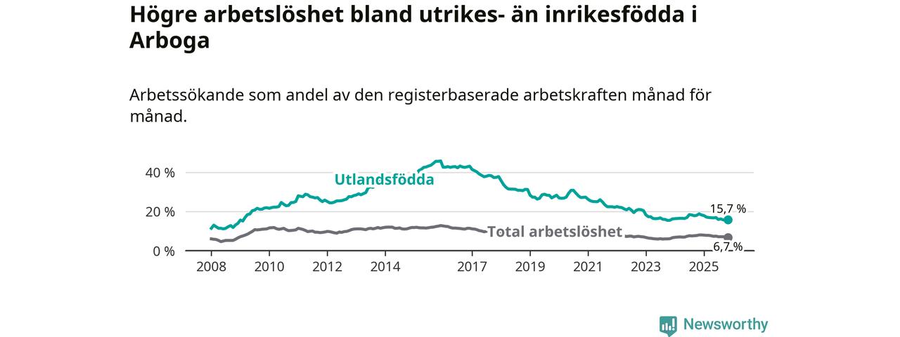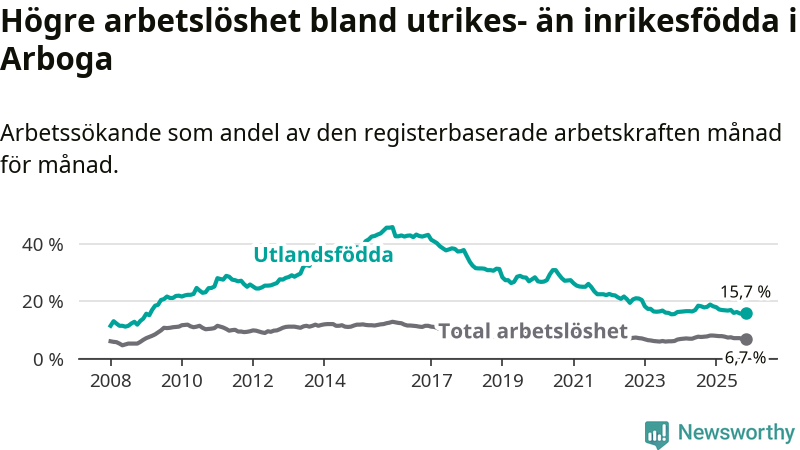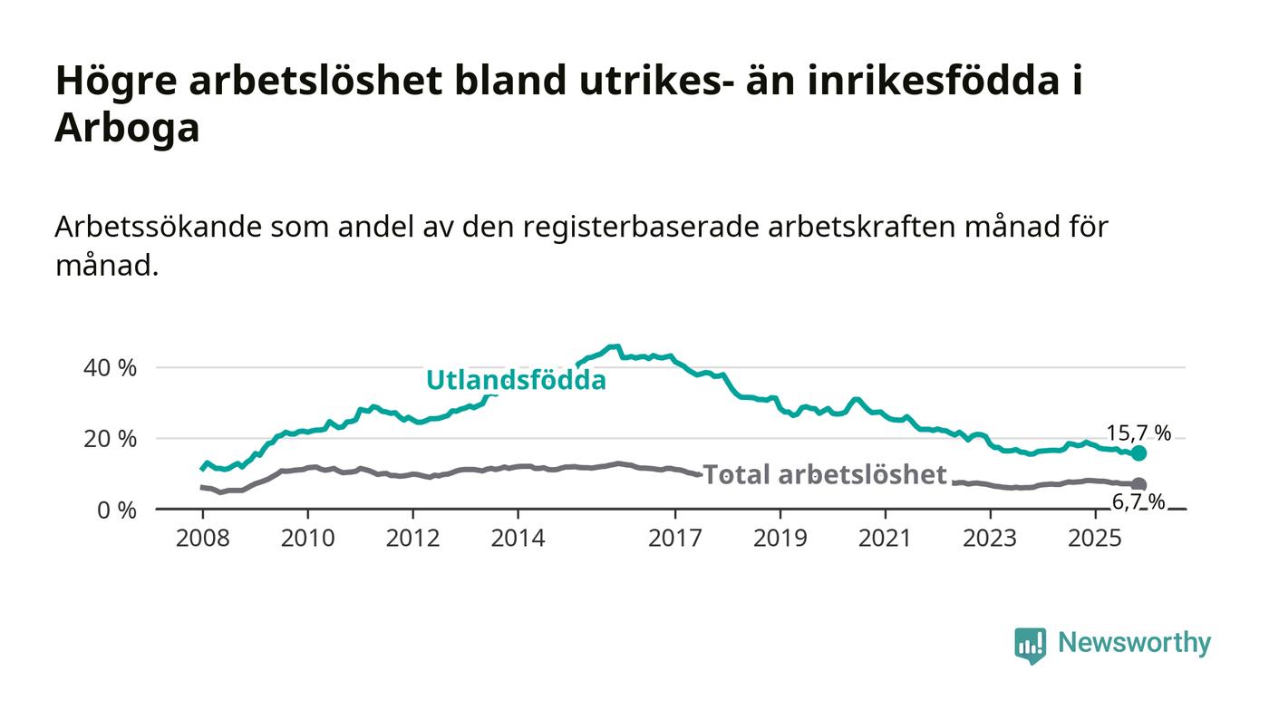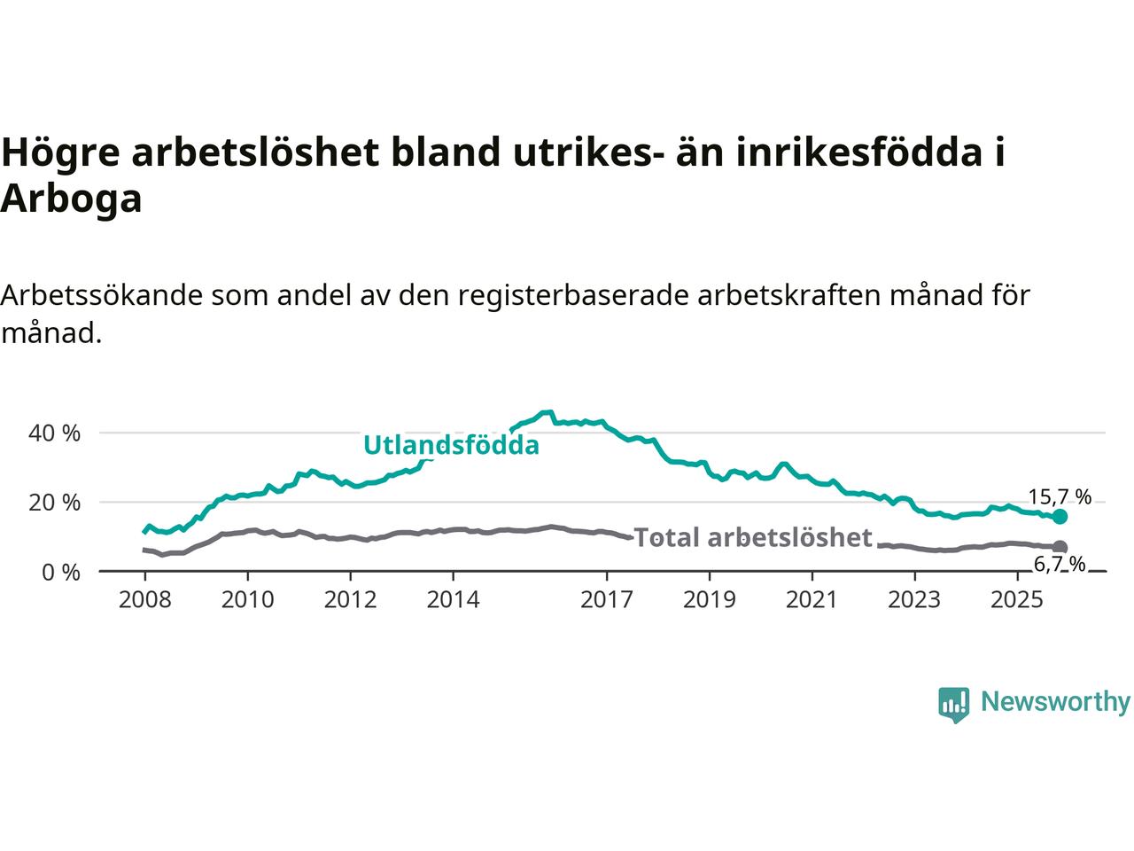 Arbetslösheten bland utlandsfödda var 15,7 procent i Arboga under november månad, motsvarande 178 av 1 134 personer. Det är 3,1 procentenheter färre än vid samma tidpunkt i fjol (−37 om man räknar personer).