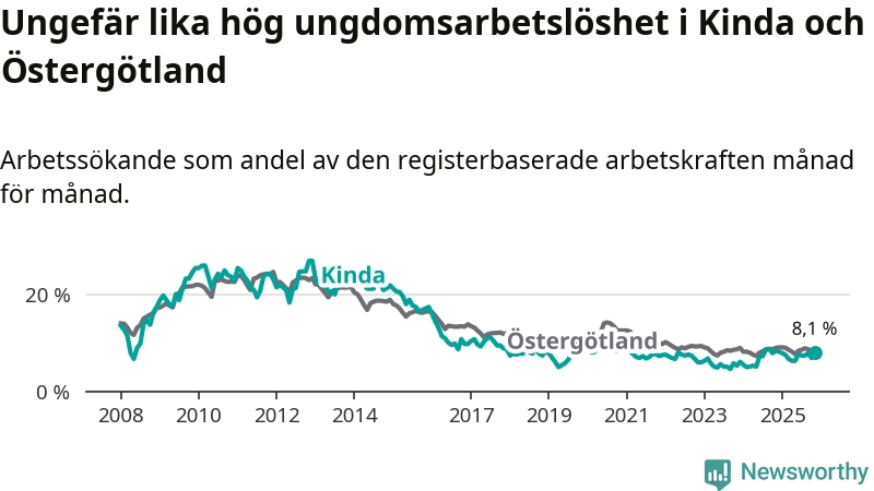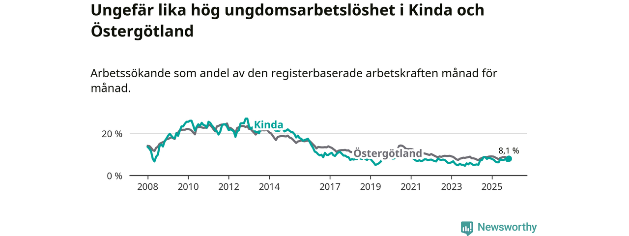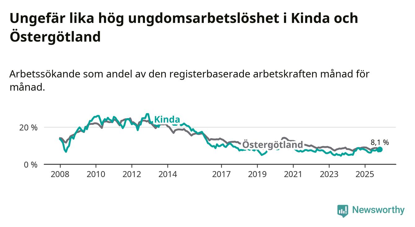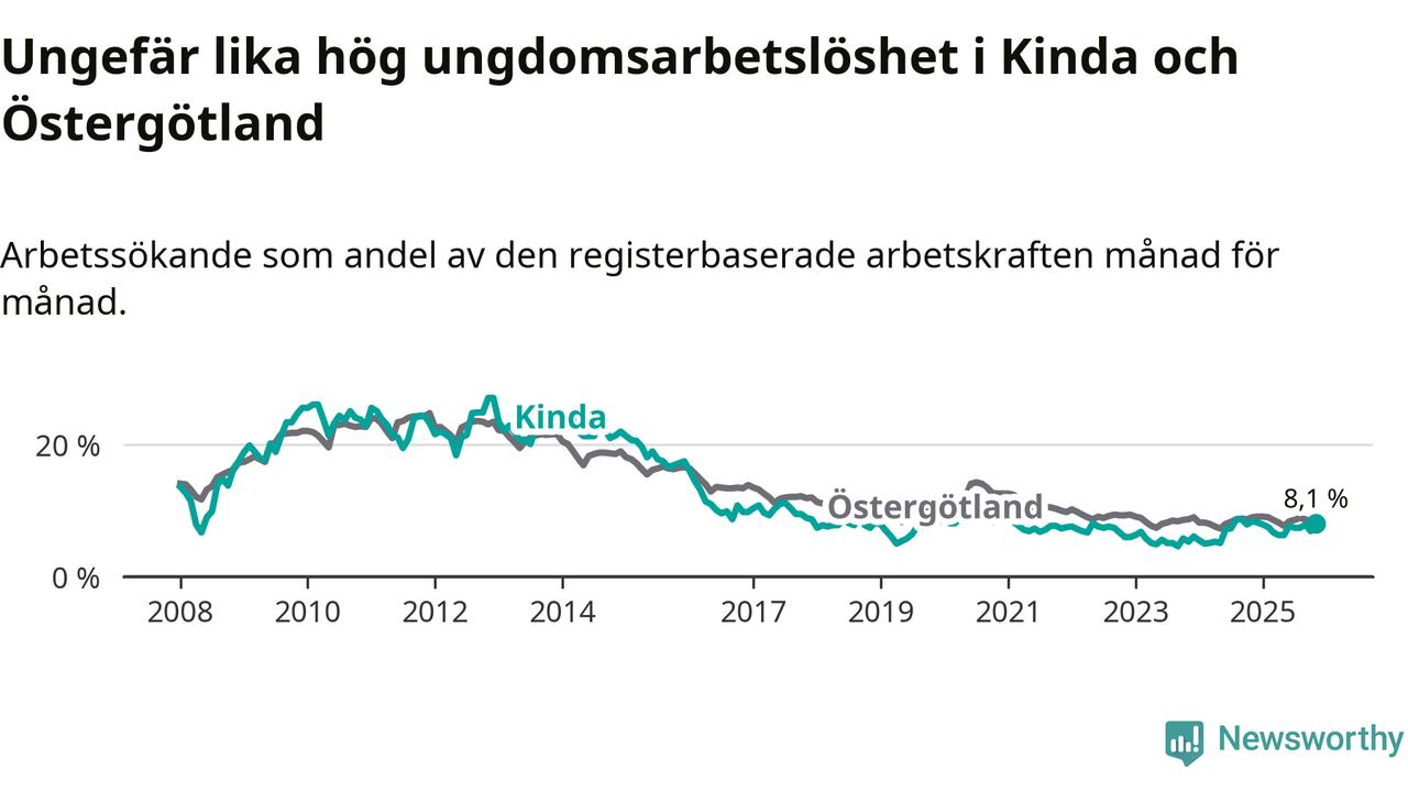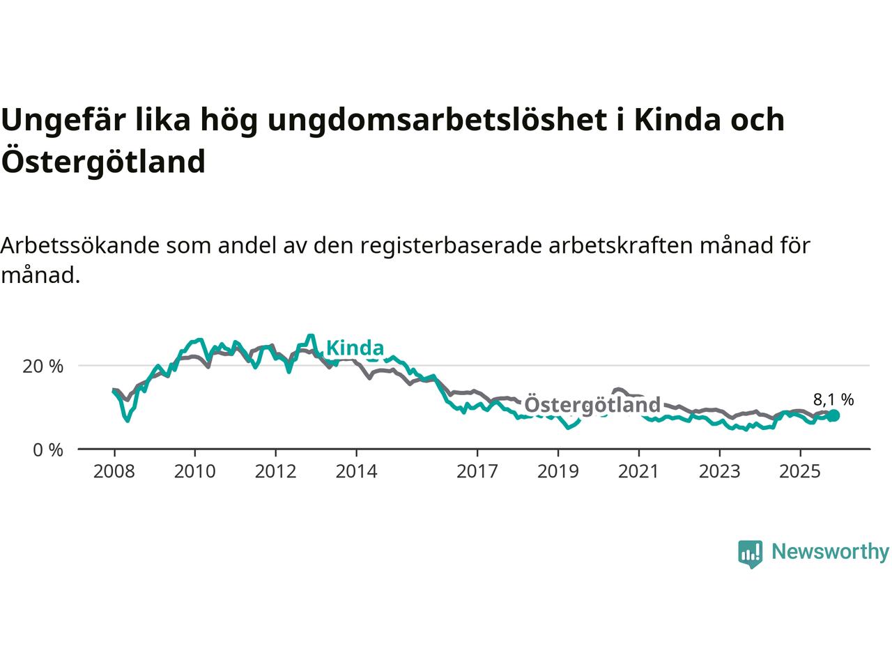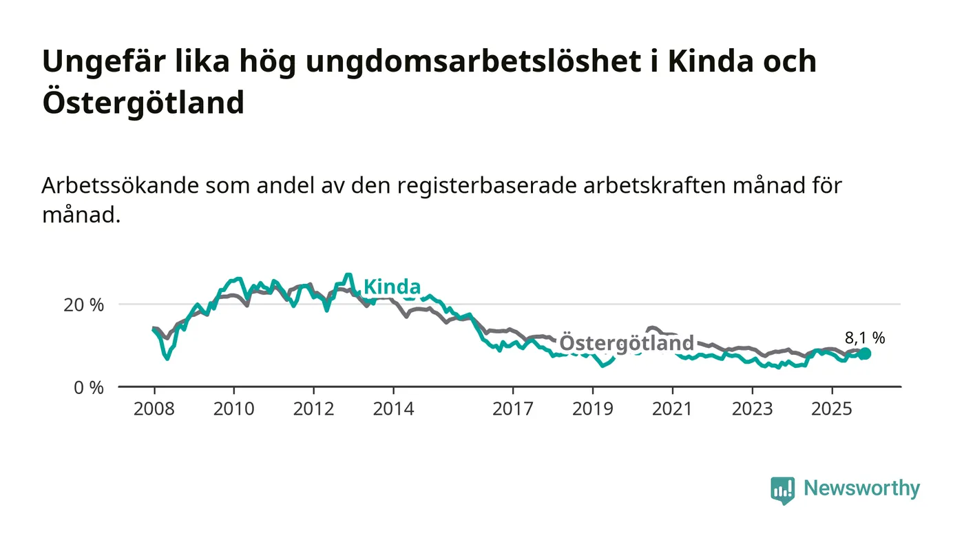Medan Kinda har lägre total arbetslöshet än Östergötland, ligger ungdomsarbetslösheten på i stort sett samma nivå.