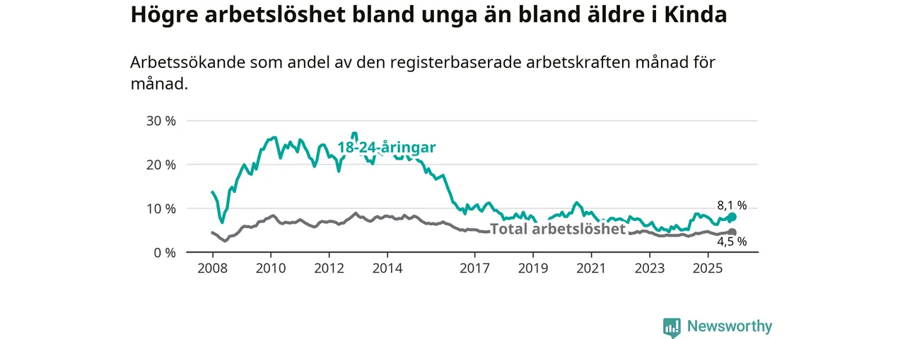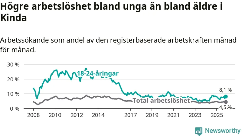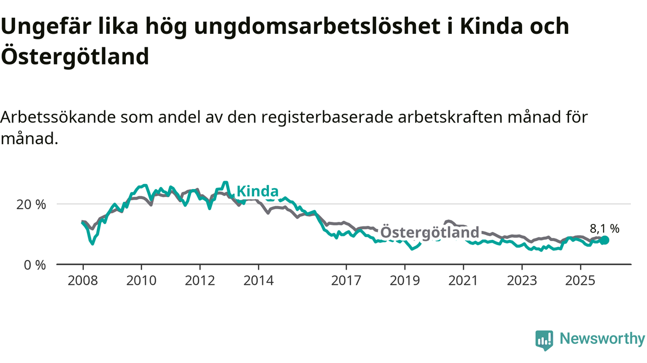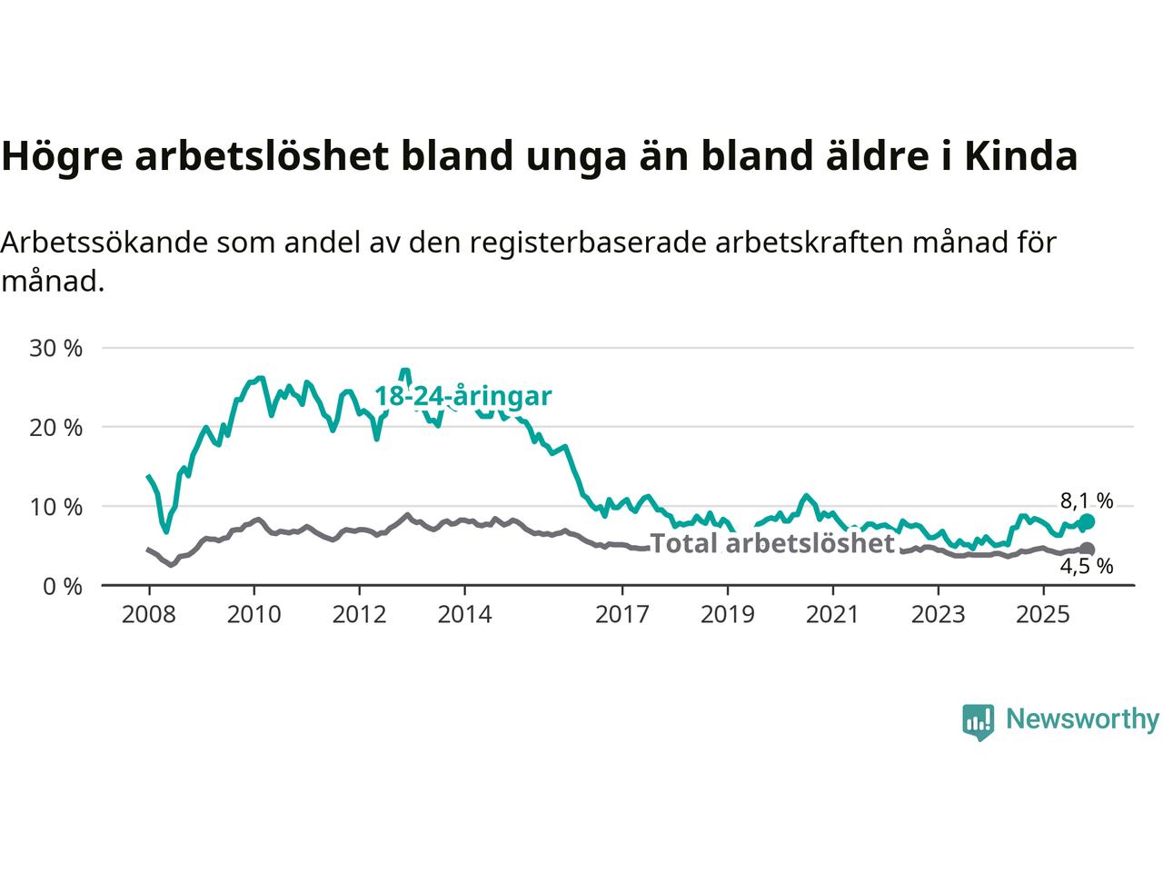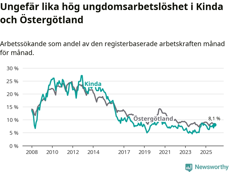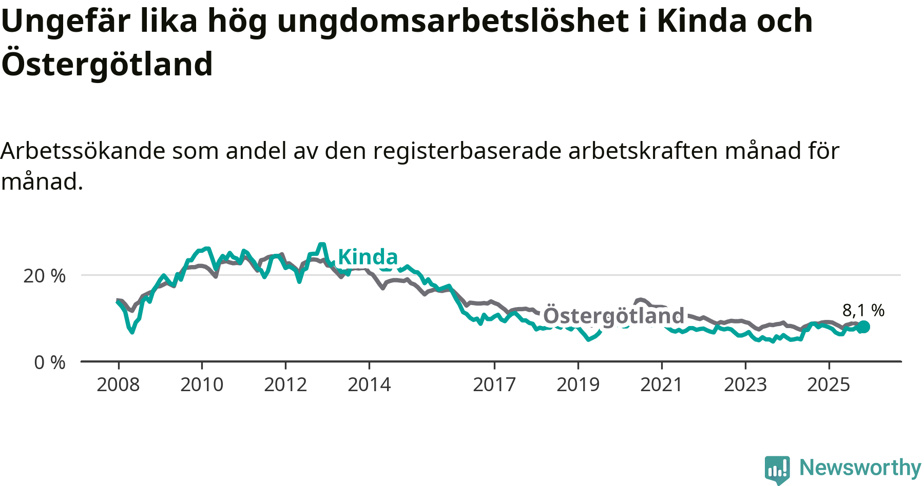 Medan Kinda har lägre total arbetslöshet än Östergötland, ligger ungdomsarbetslösheten på i stort sett samma nivå.