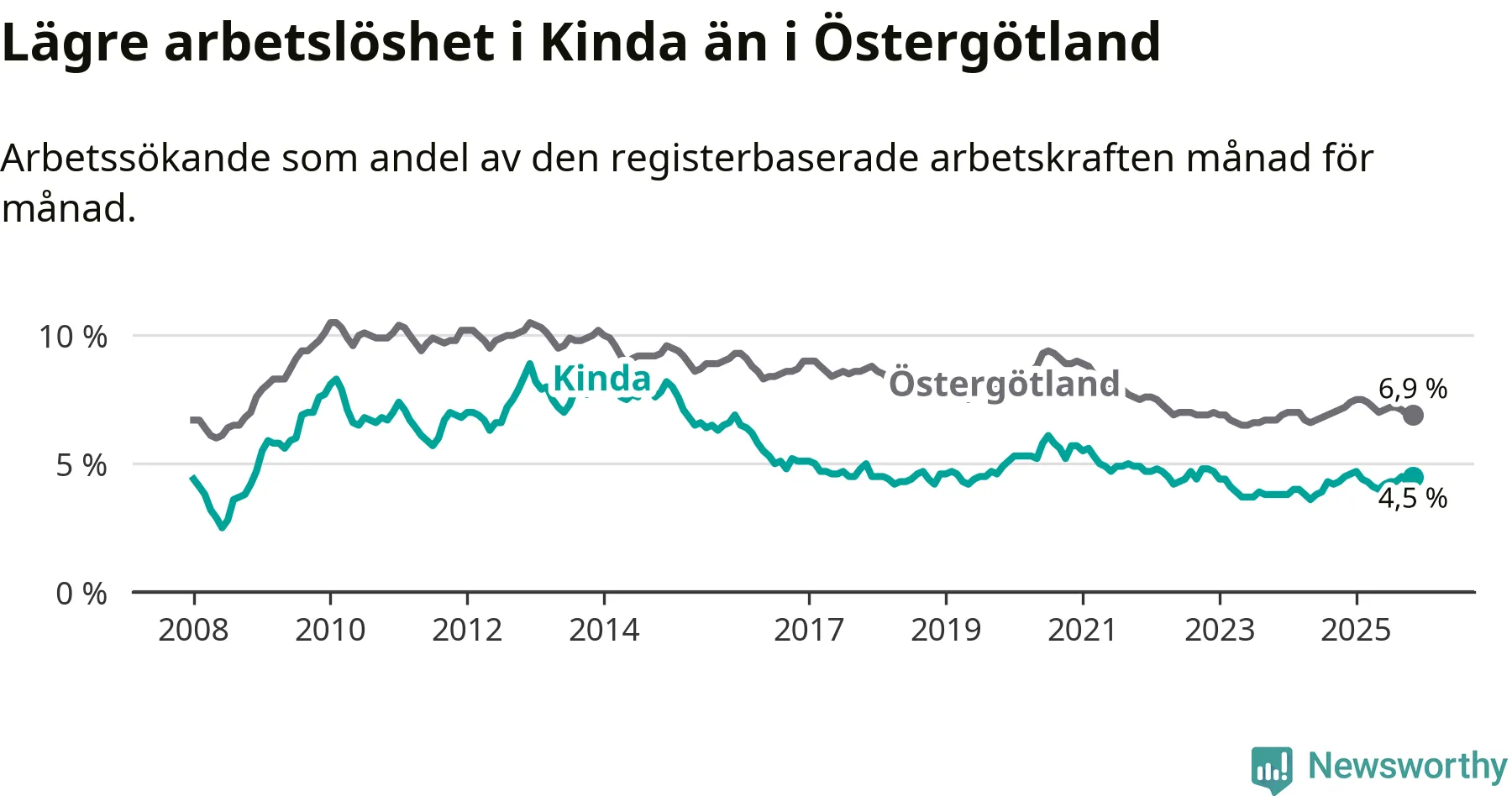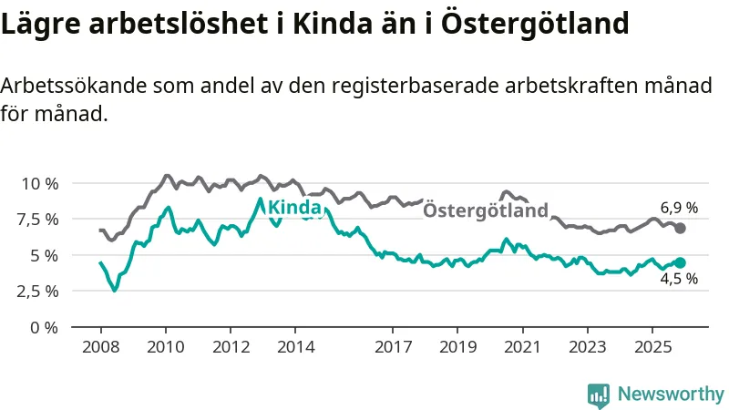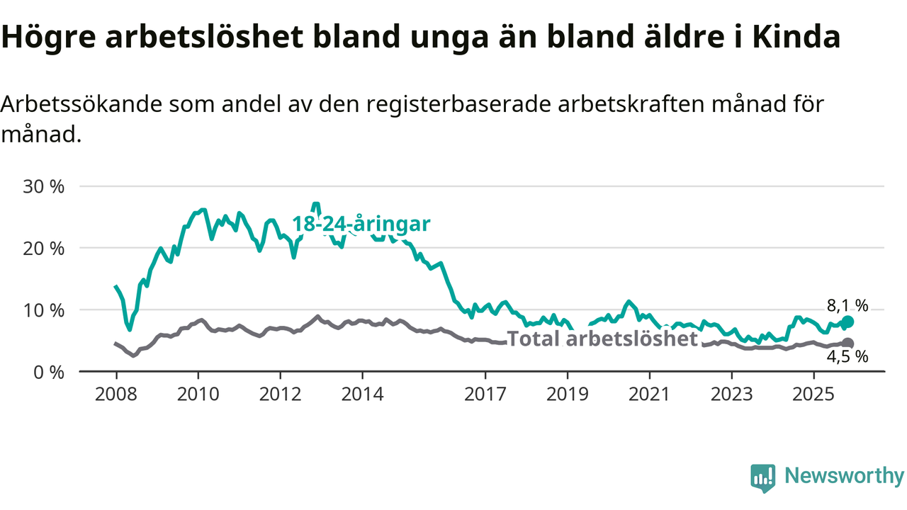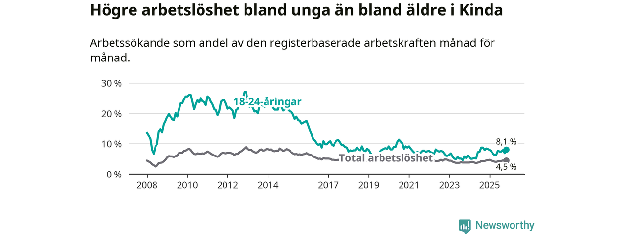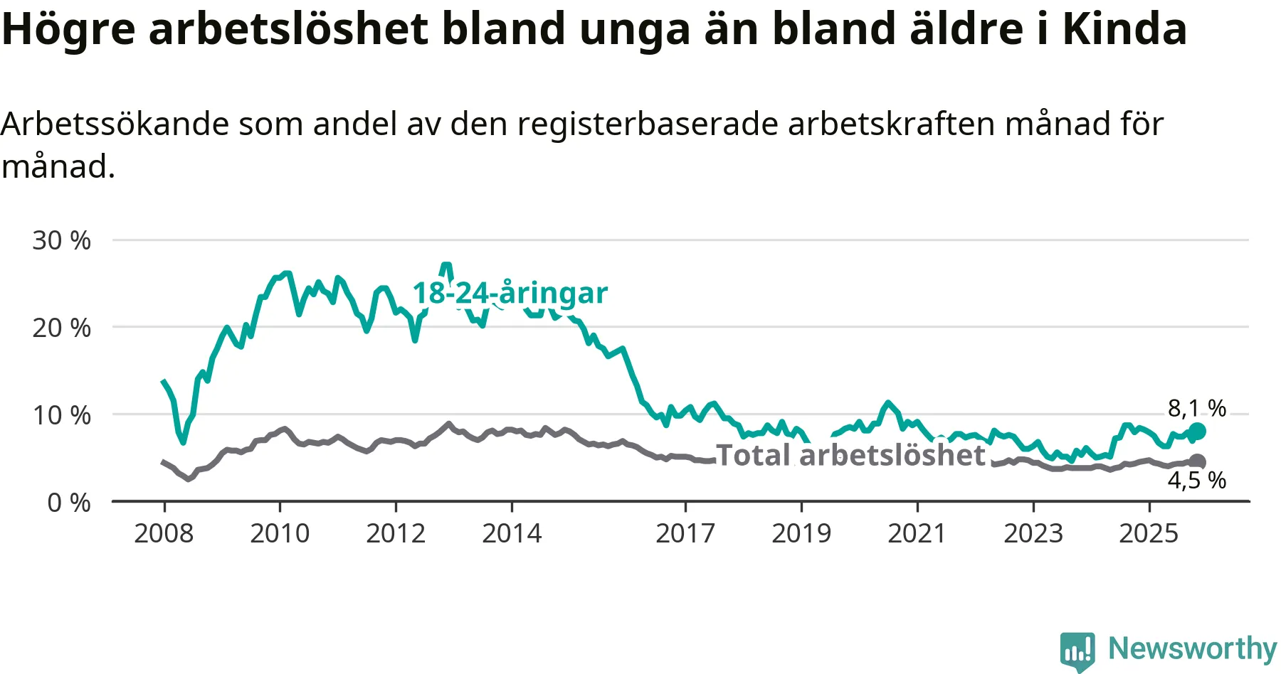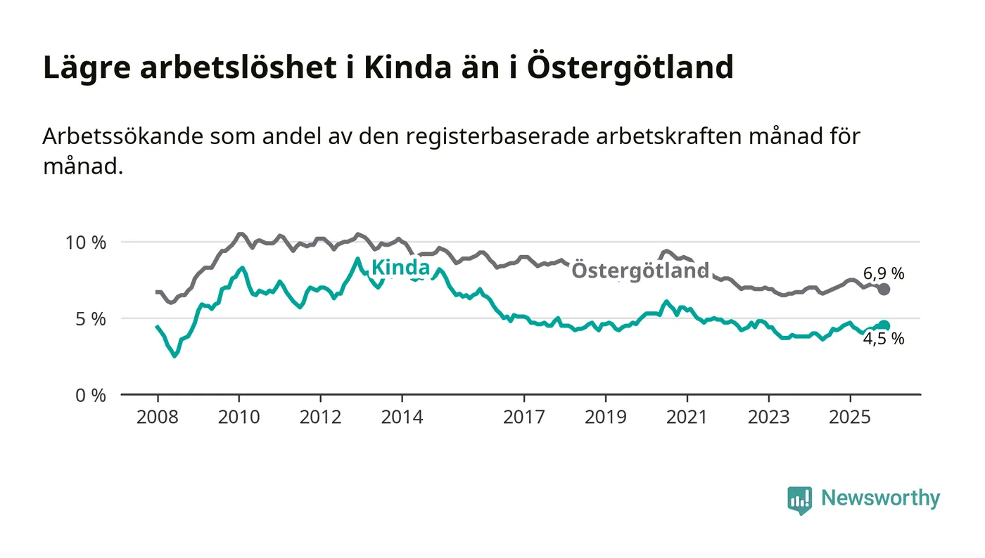 Medan Kinda har lägre total arbetslöshet än Östergötland, ligger ungdomsarbetslösheten på i stort sett samma nivå.