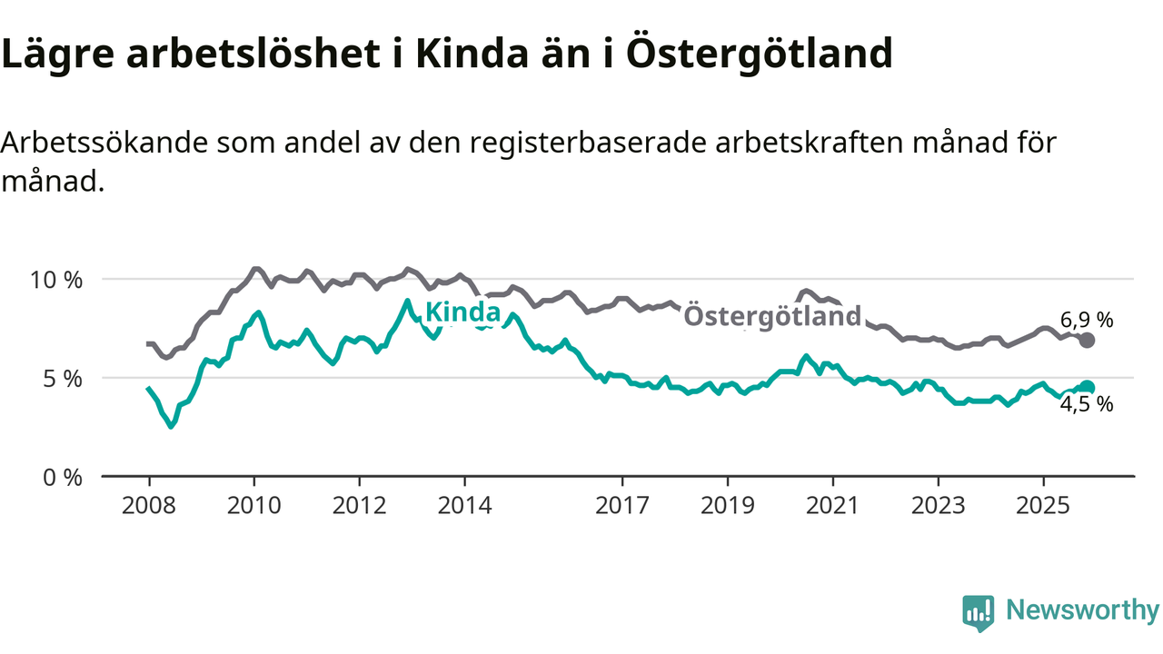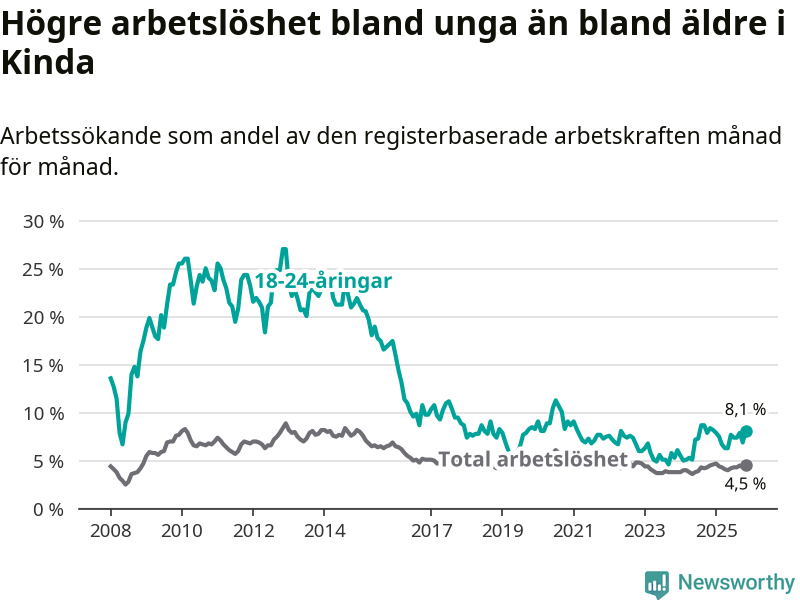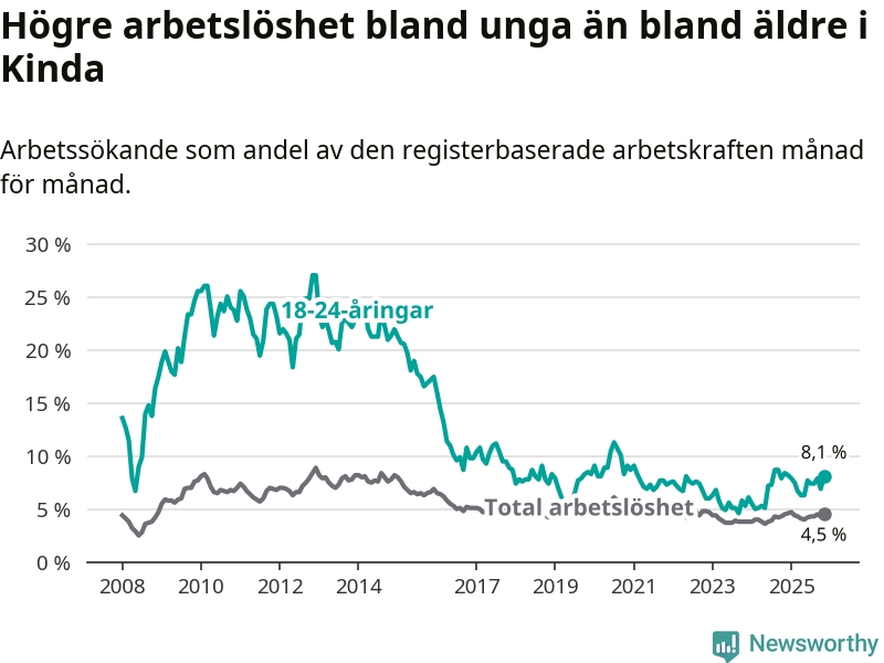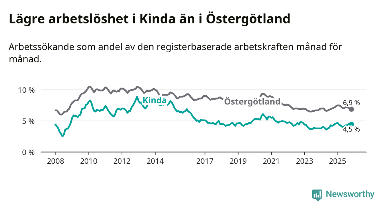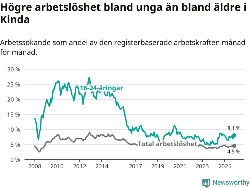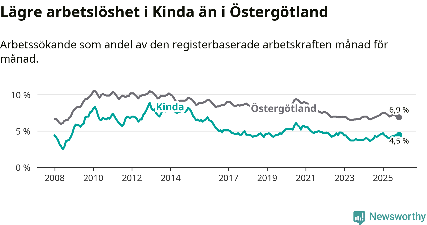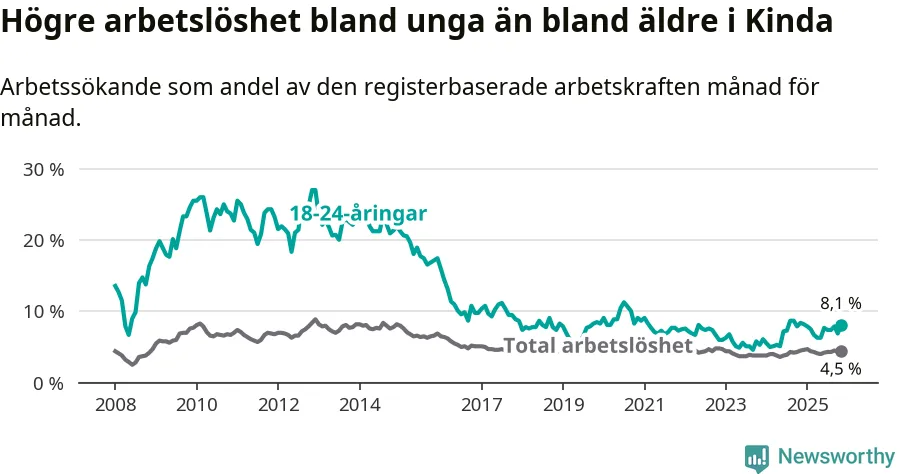 Medan Kinda har lägre total arbetslöshet än Östergötland, ligger ungdomsarbetslösheten på i stort sett samma nivå.