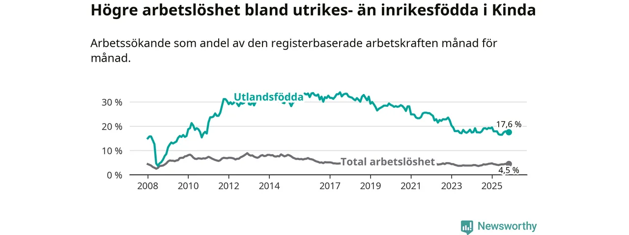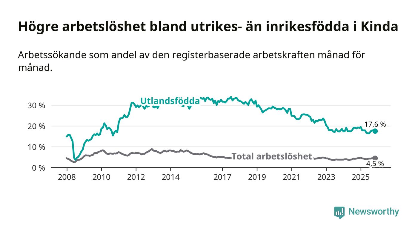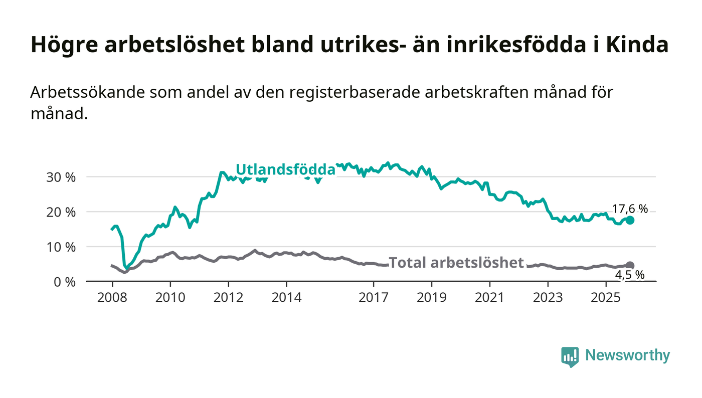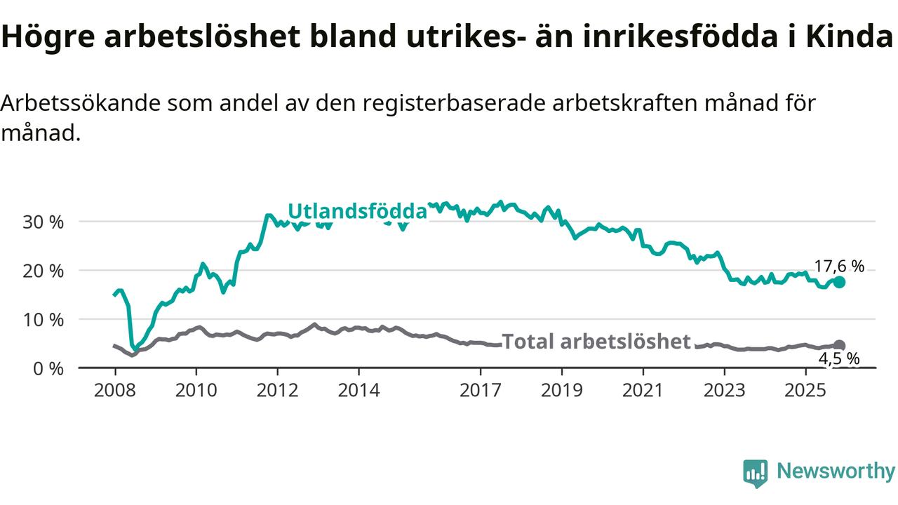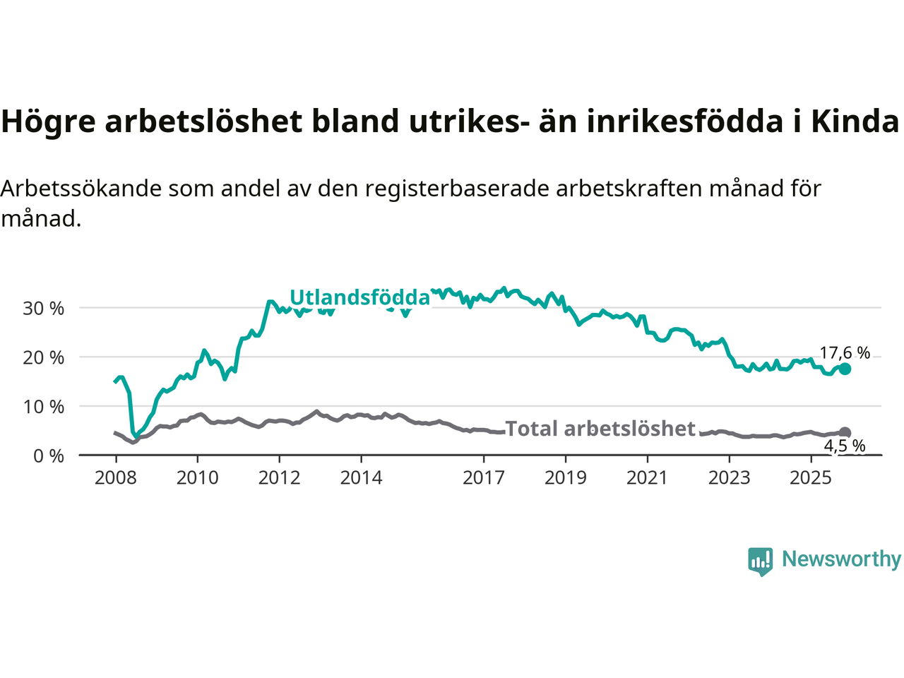 Skillnaden i arbetslöshet mellan utrikesfödda och hela befolkningen är 13,1 procentenheter i Kinda. Det är en betydligt mindre skillnad än för ett år sedan (−1,7 procentenheter).