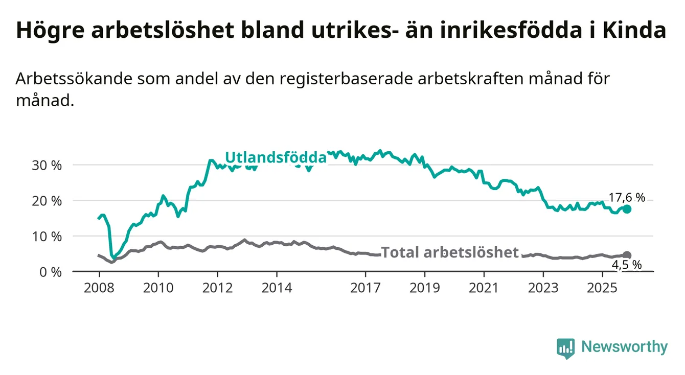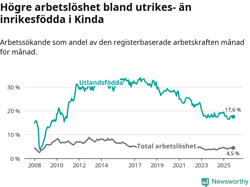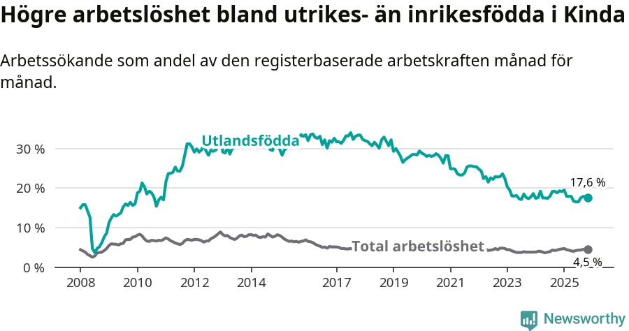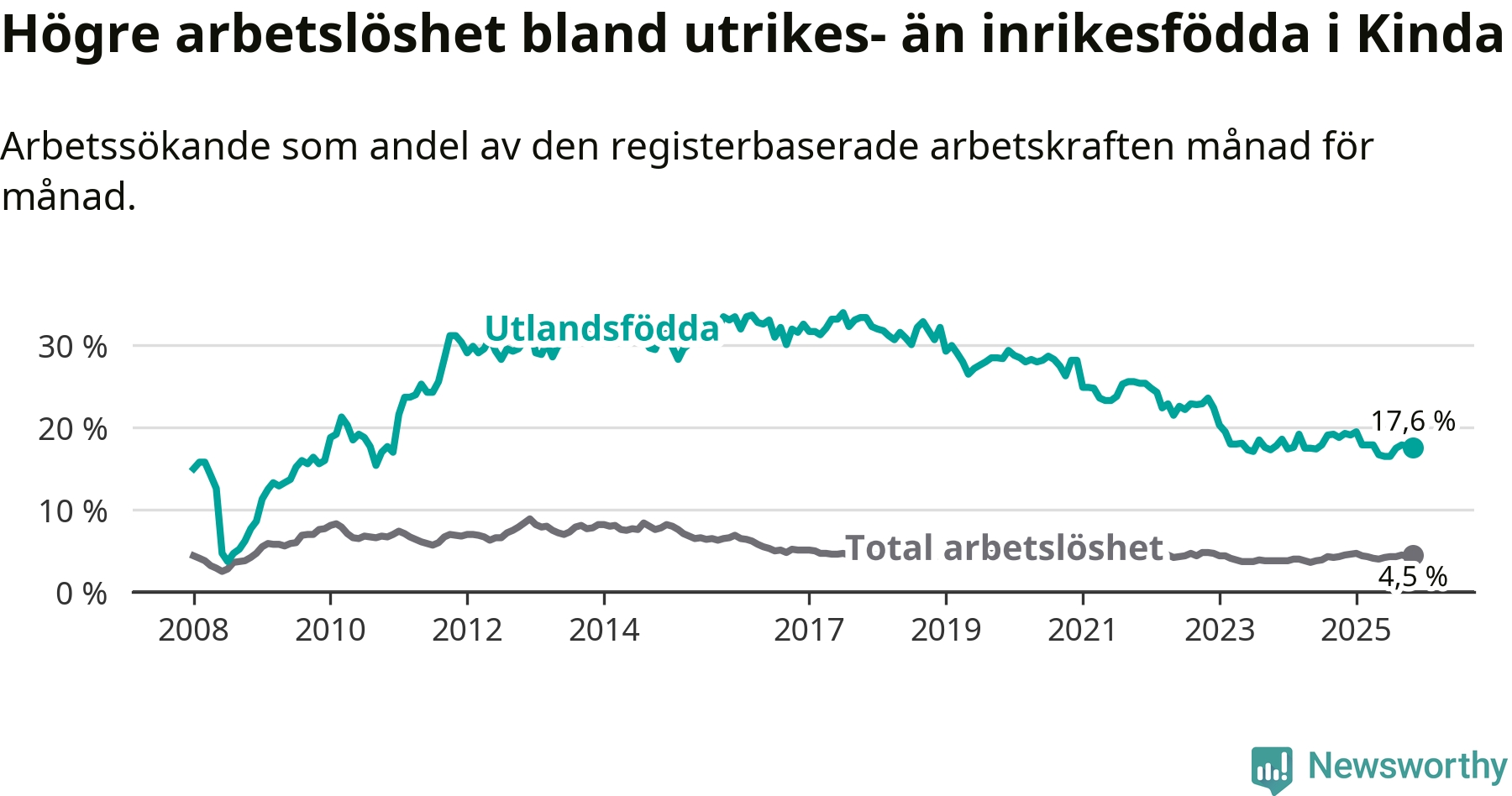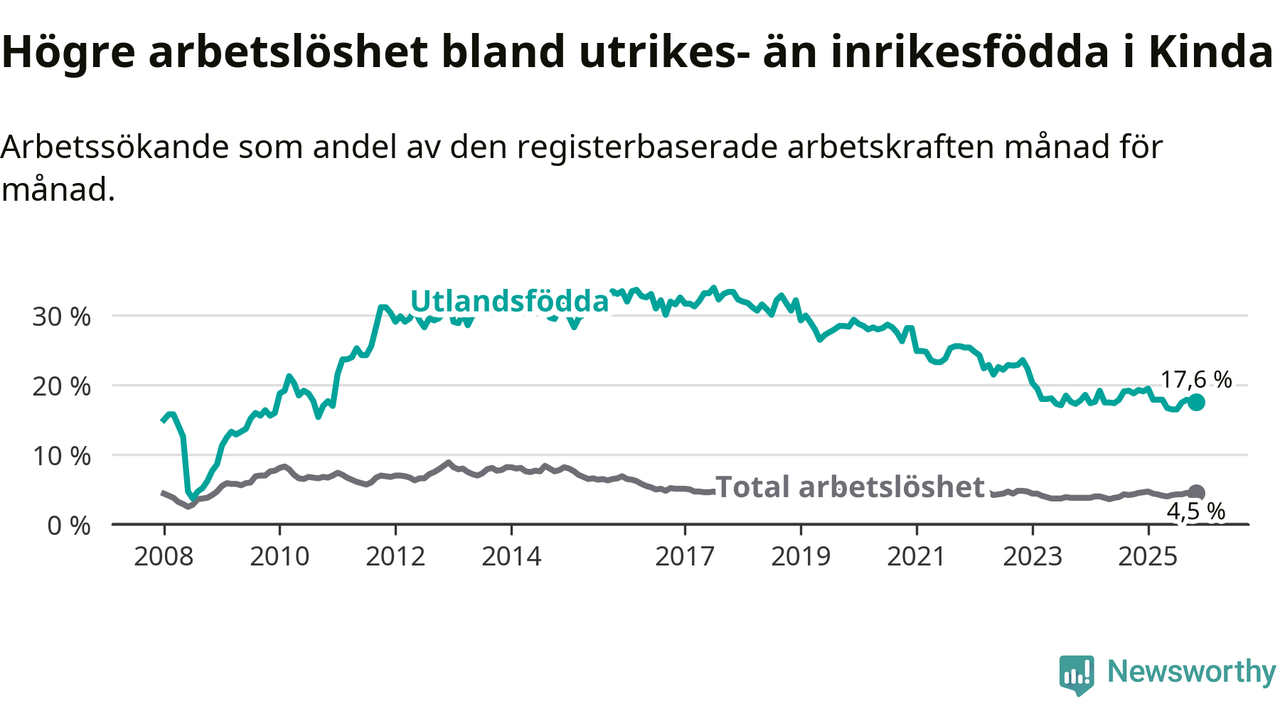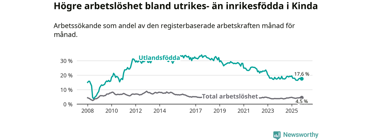 Skillnaden i arbetslöshet mellan utrikesfödda och hela befolkningen är 13,1 procentenheter i Kinda. Det är en betydligt mindre skillnad än för ett år sedan (−1,7 procentenheter).