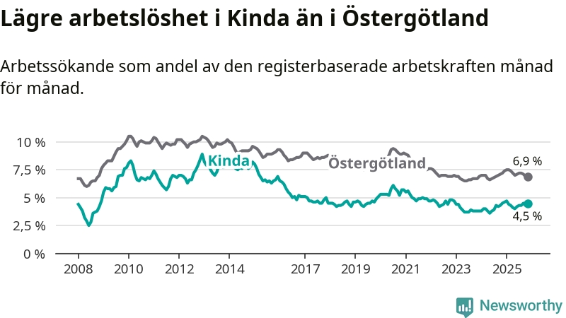 Under november månad rapporterade Kinda kommun en total arbetslöshet på 4,5 procent. Det är i samma nivå som i november i fjol. I Östergötlands län däremot sjunker arbetslösheten