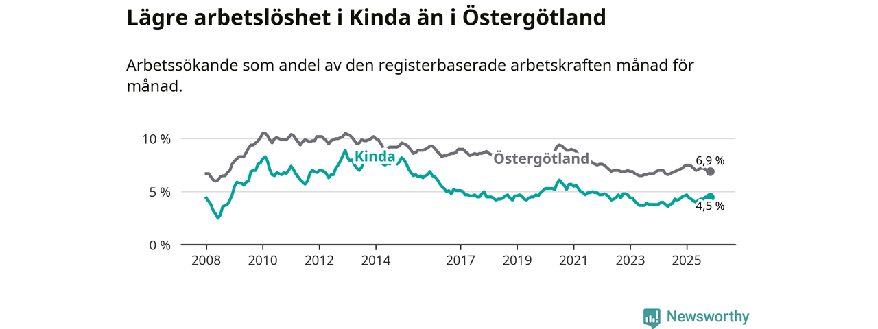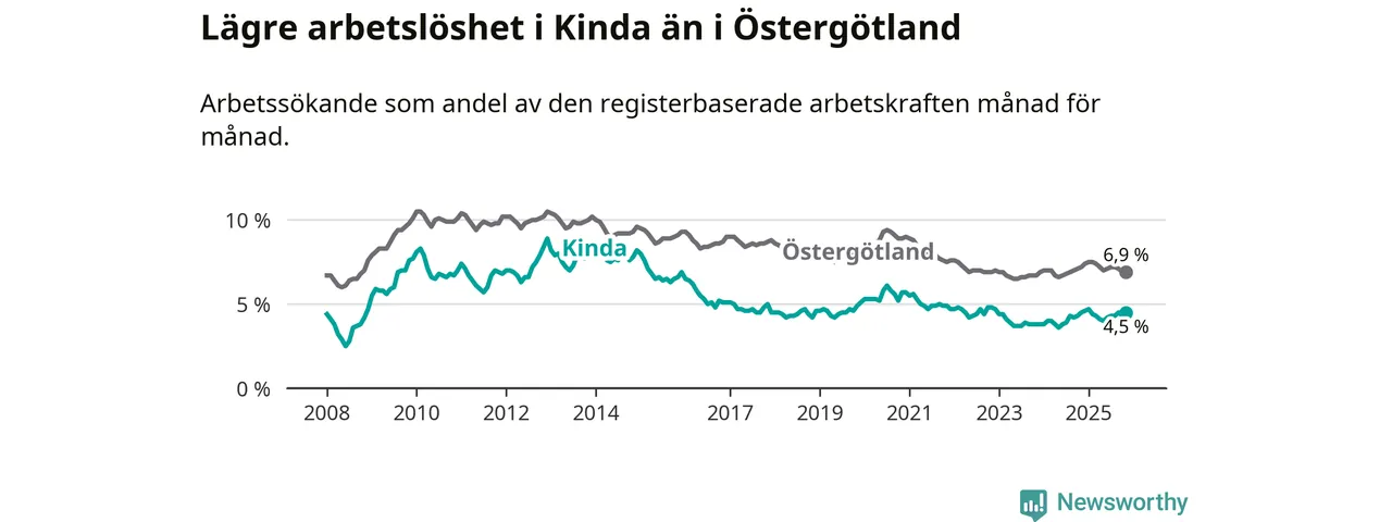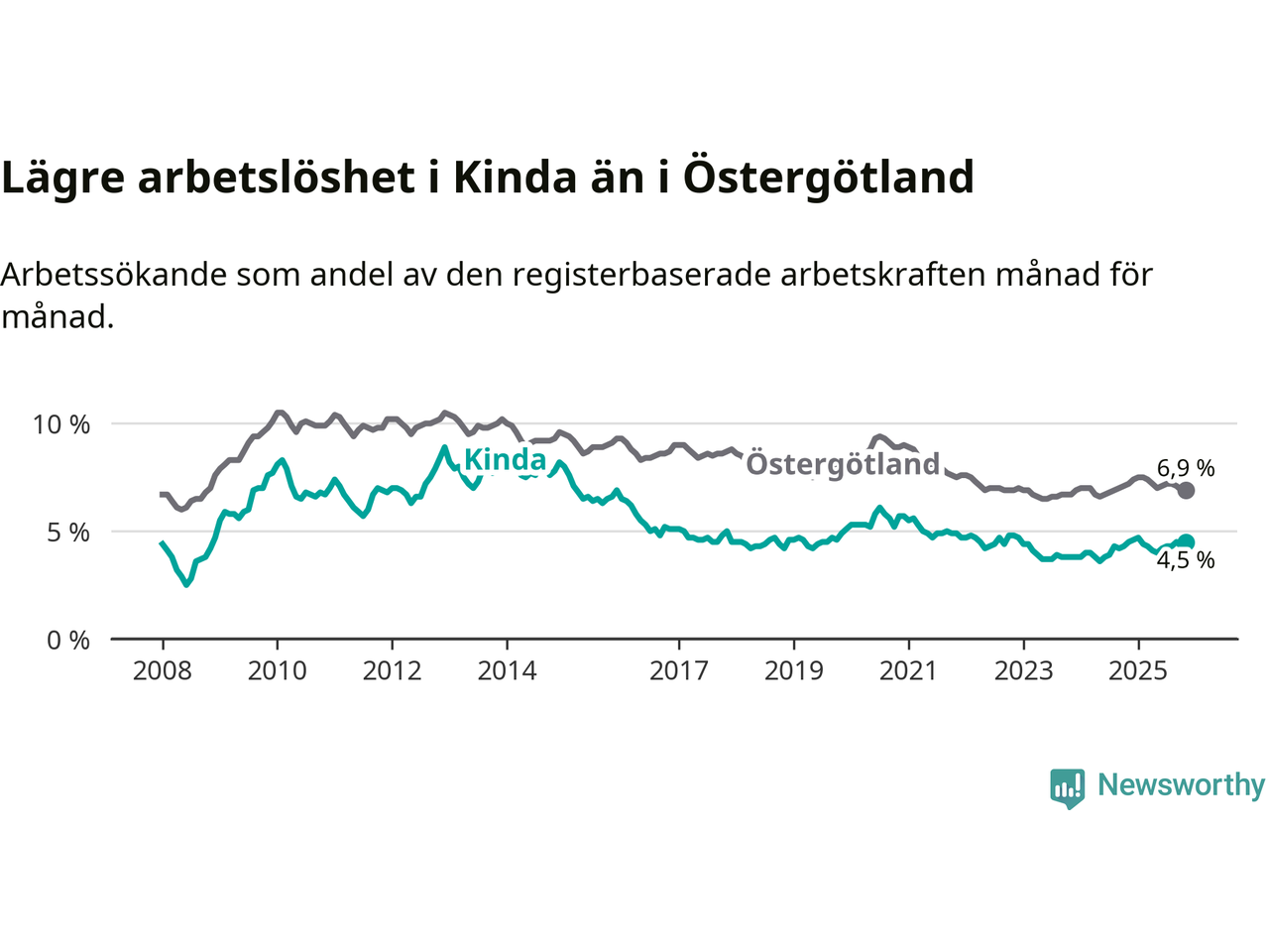 I de flesta andra kommuner i länet går arbetslösheten nedåt. Störst är minskningen i Motala, där arbetslösheten sjunker med 0,9 procentenheter. I tabellen längre ner ser du utvecklingen i samtliga kommuner i länet.
