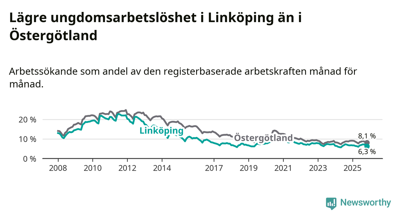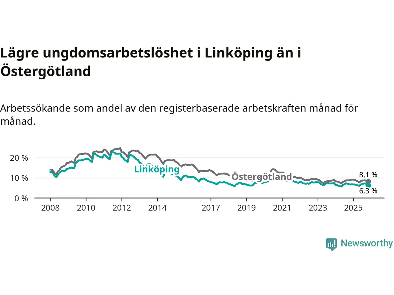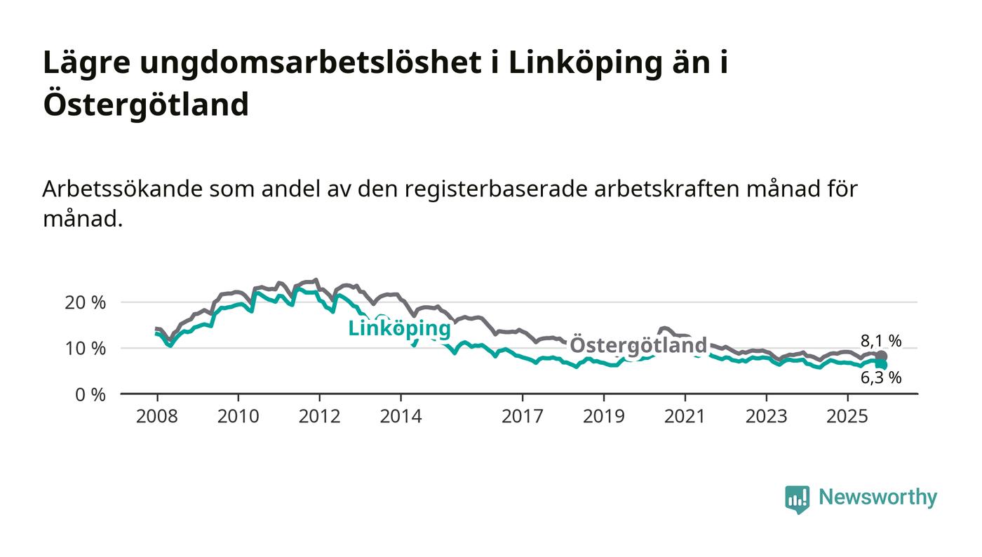 Precis som den totala arbetslösheten ligger ungdomsarbetslösheten i Linköping lägre än i Östergötland som helhet. Skillnaden mellan kommunen och länet är 1,8 procentenheter.