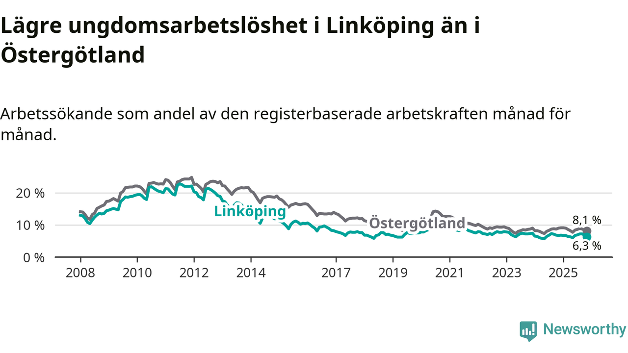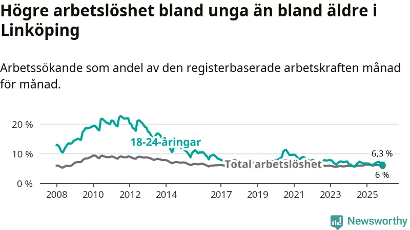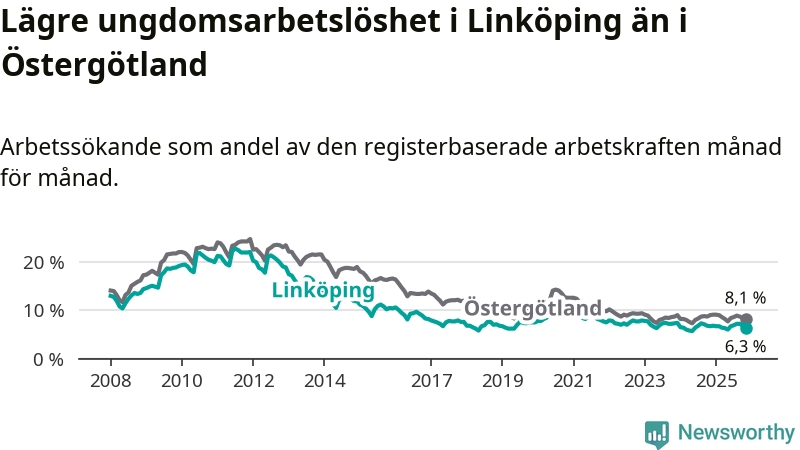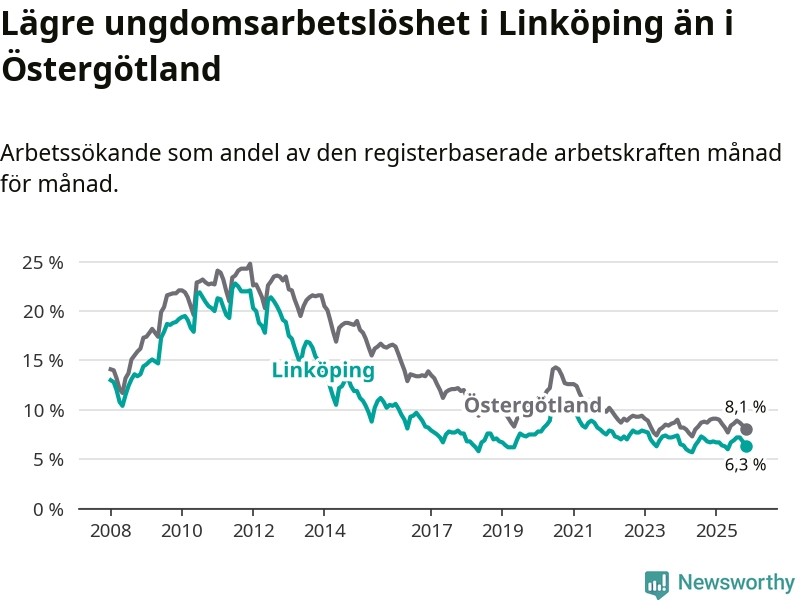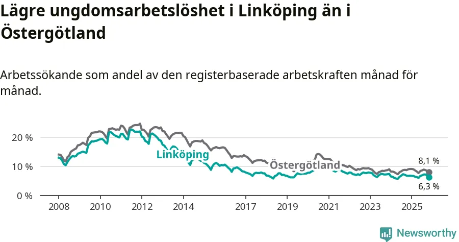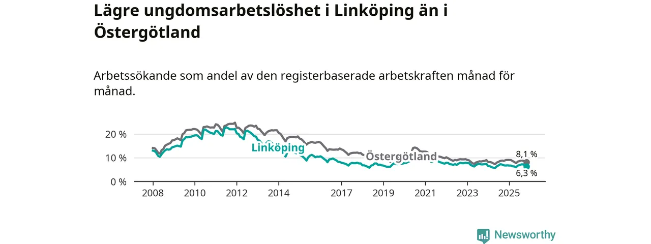 Precis som den totala arbetslösheten ligger ungdomsarbetslösheten i Linköping lägre än i Östergötland som helhet. Skillnaden mellan kommunen och länet är 1,8 procentenheter.