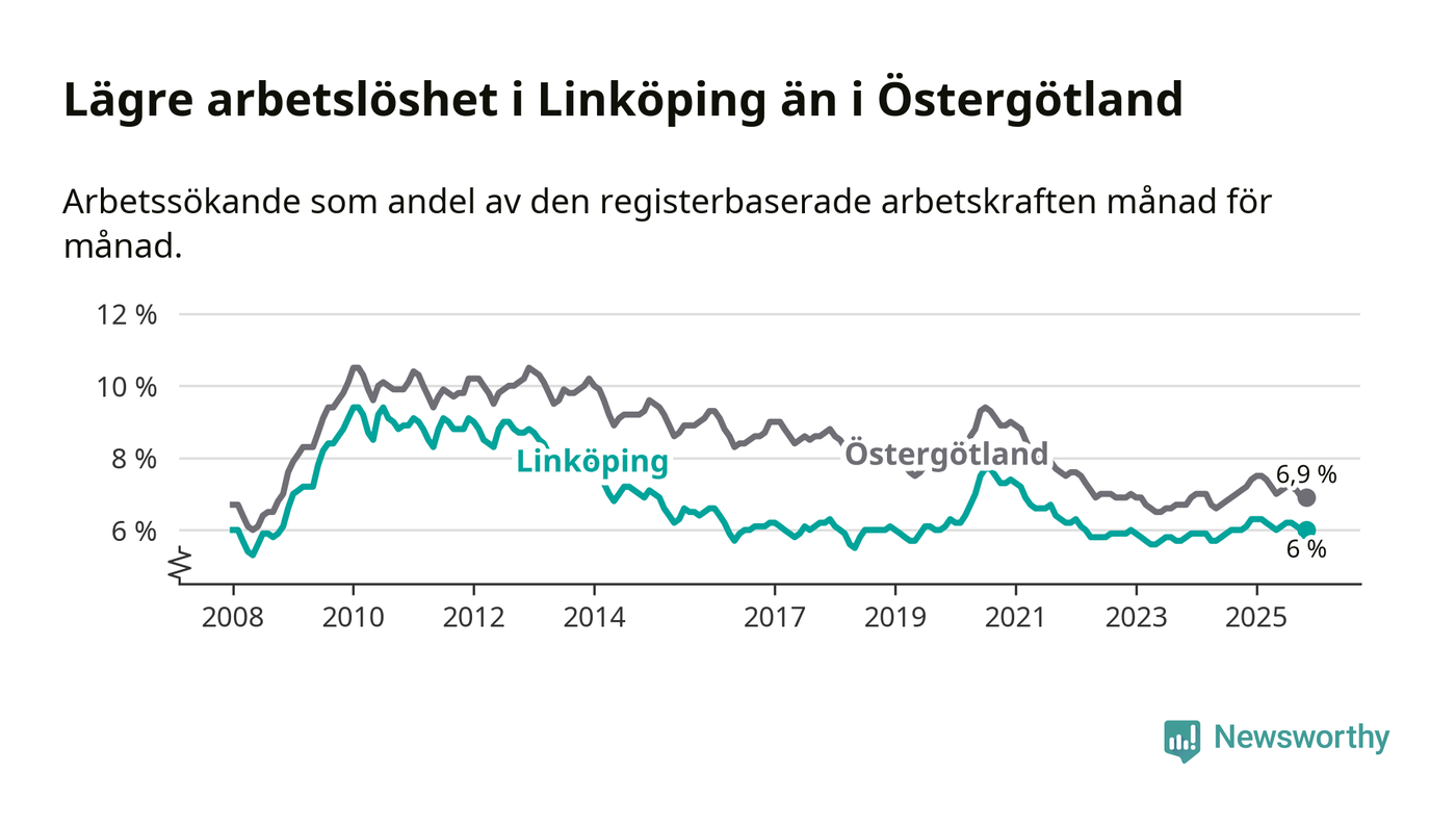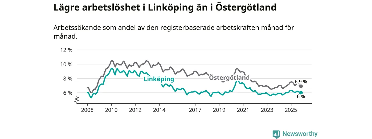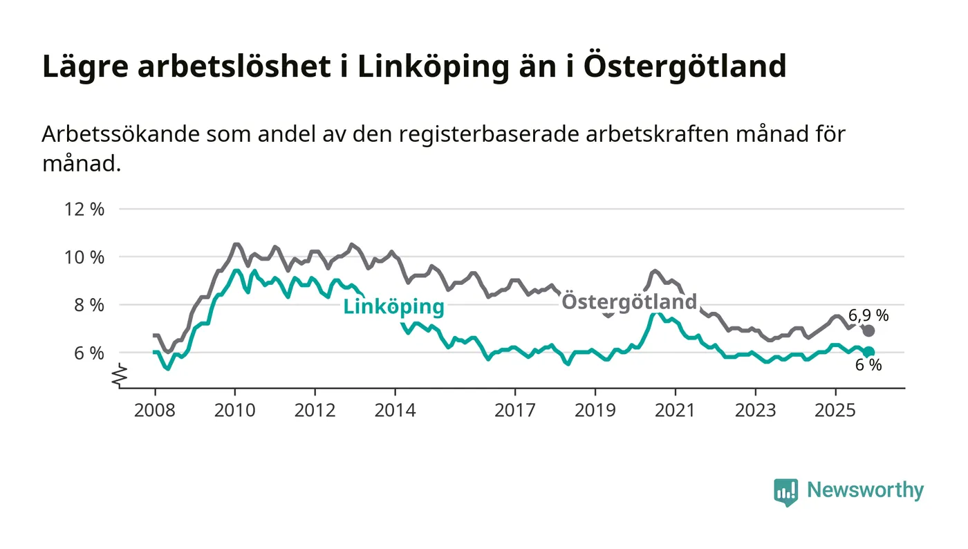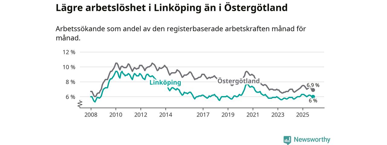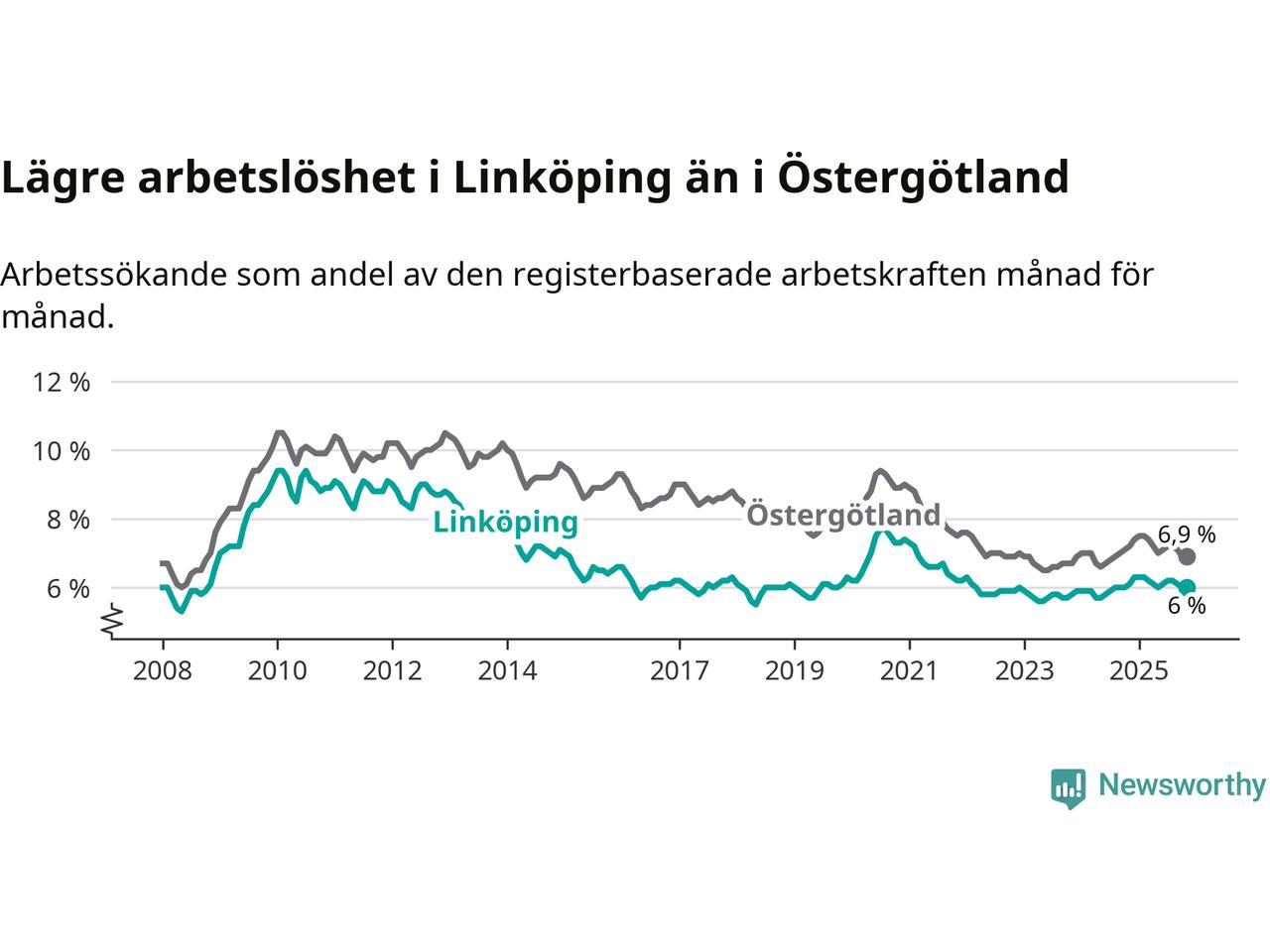 Under november månad rapporterade Linköpings kommun en total arbetslöshet på 6,0 procent. Det är en minskning jämfört med samma tidpunkt i fjol (−0,1 procentenheter). Även i Östergötlands län sjunker arbetslösheten .