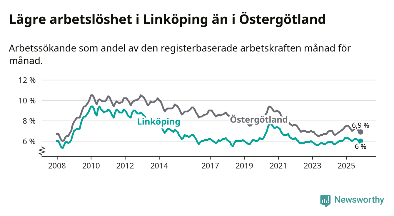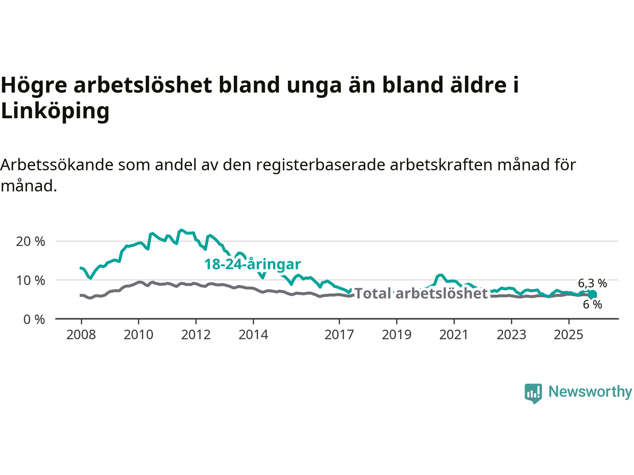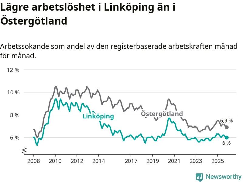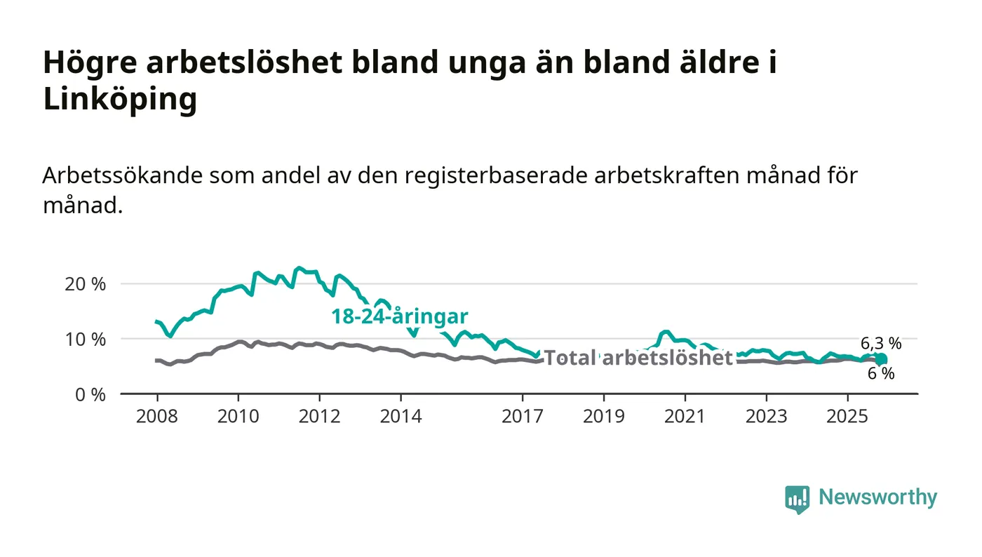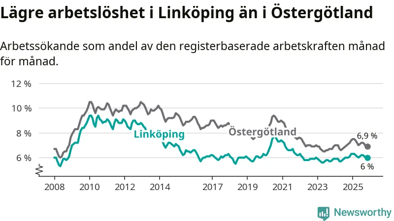 Under november månad rapporterade Linköpings kommun en total arbetslöshet på 6,0 procent. Det är en minskning jämfört med samma tidpunkt i fjol (−0,1 procentenheter). Även i Östergötlands län sjunker arbetslösheten .