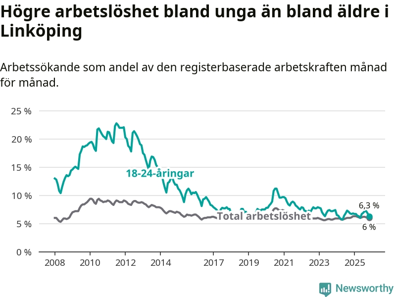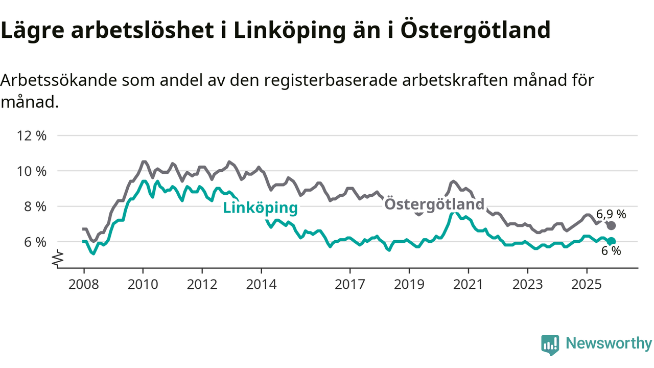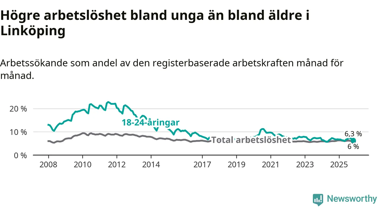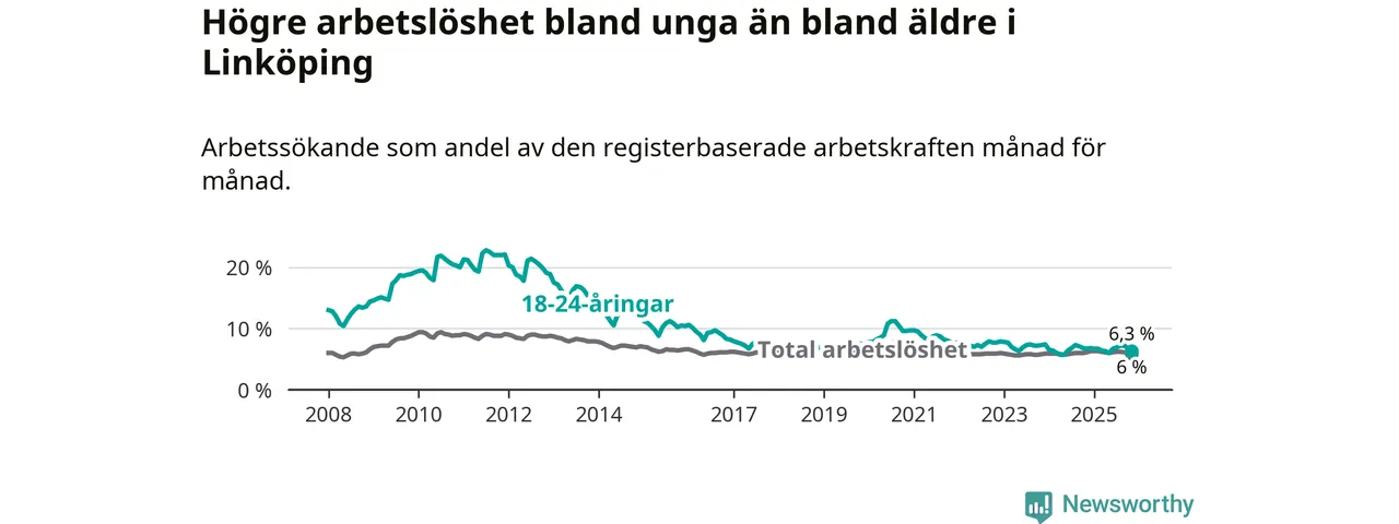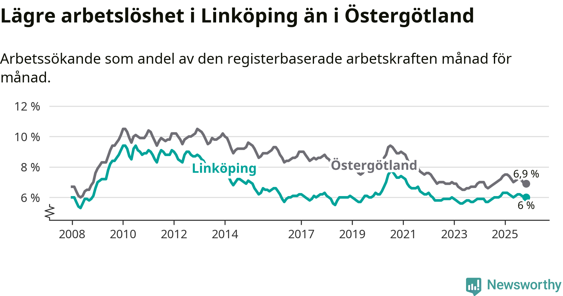 Under november månad rapporterade Linköpings kommun en total arbetslöshet på 6,0 procent. Det är en minskning jämfört med samma tidpunkt i fjol (−0,1 procentenheter). Även i Östergötlands län sjunker arbetslösheten .