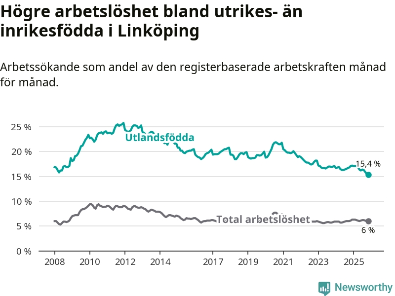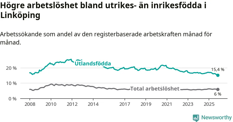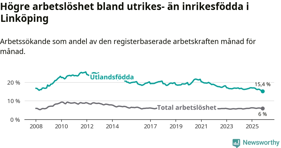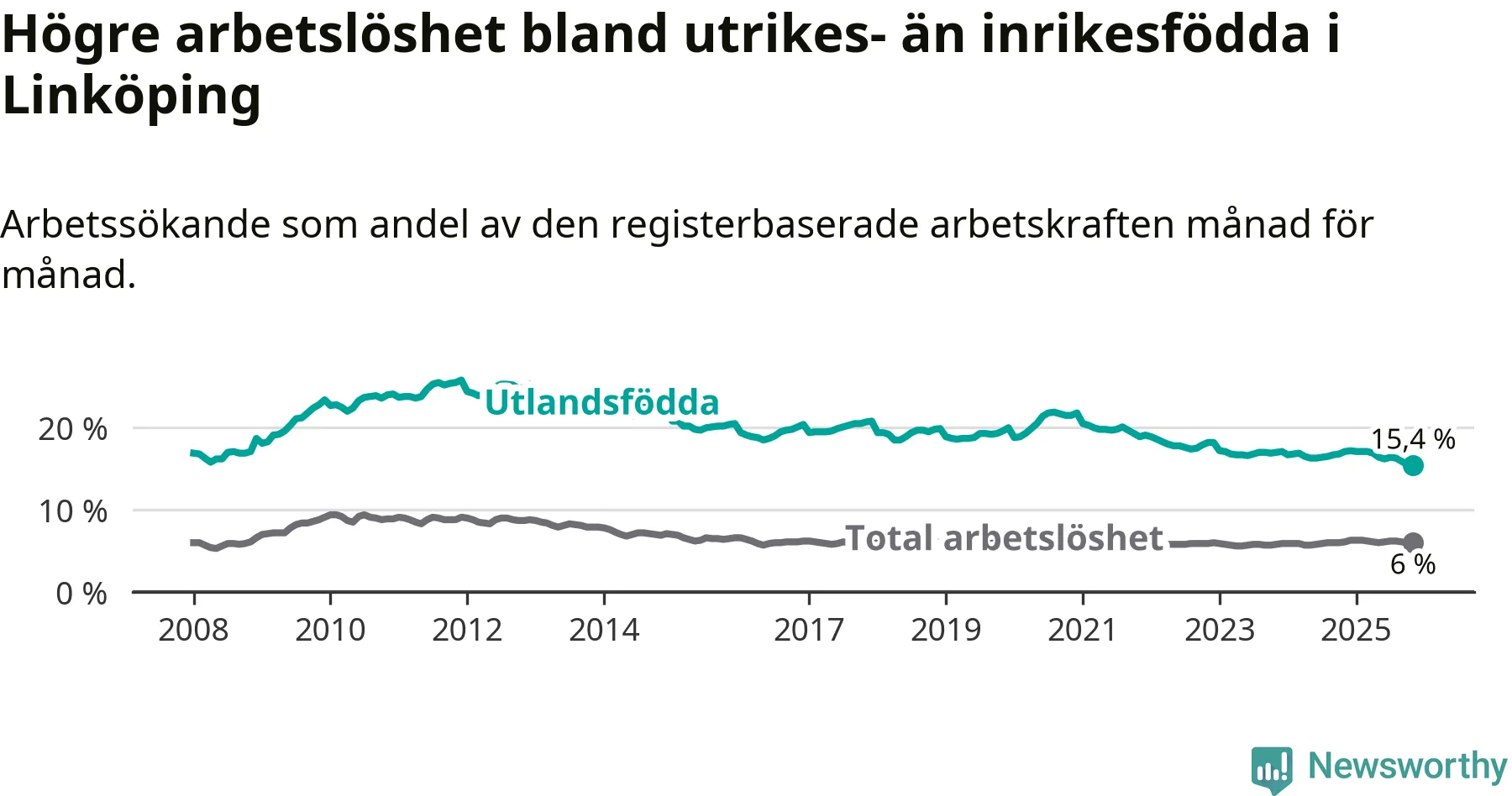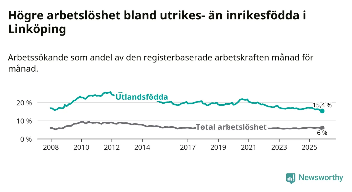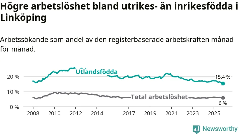 Arbetslösheten bland utlandsfödda var 15,4 procent i Linköping under november månad, motsvarande 2 940 av 19 091 personer. Det är 1,7 procentenheter färre än vid samma tidpunkt i fjol (−269 om man räknar personer). Den nuvarande arbetslöshetsnivån är den lägsta sedan januari 2008.