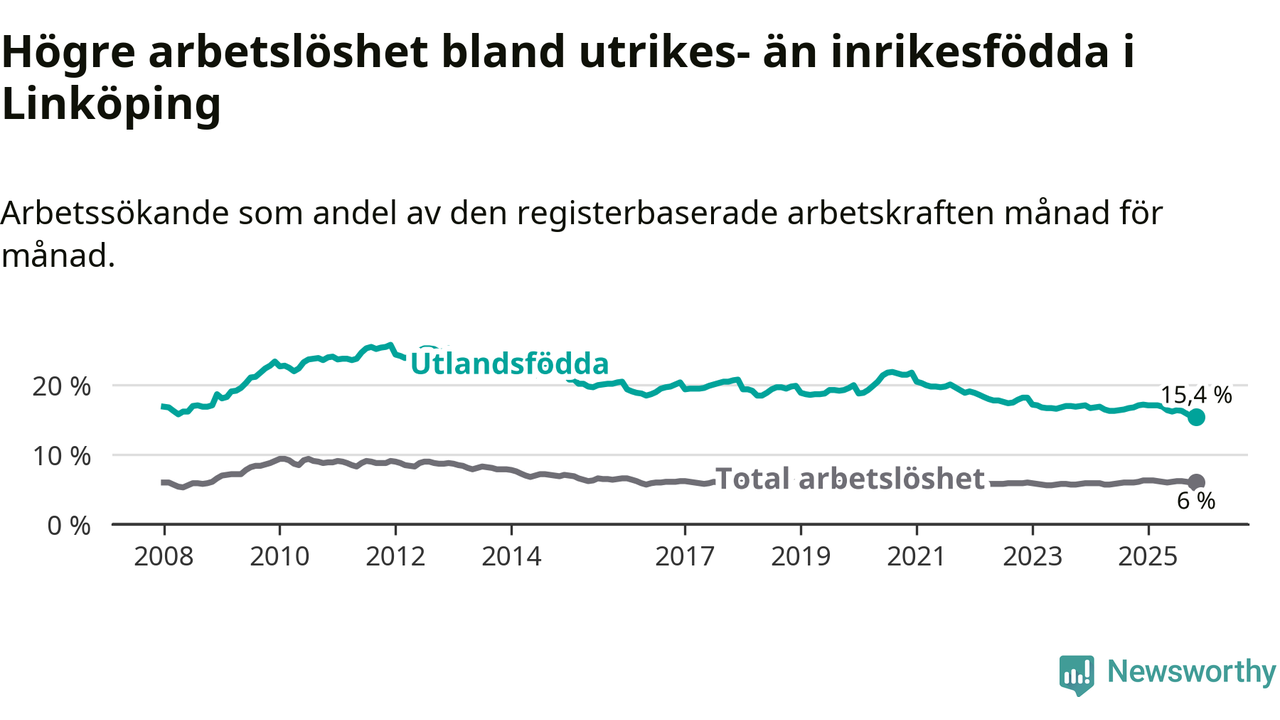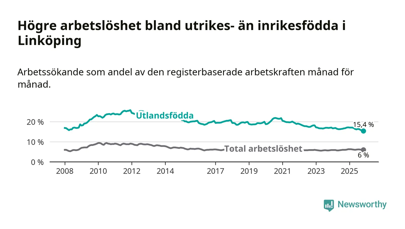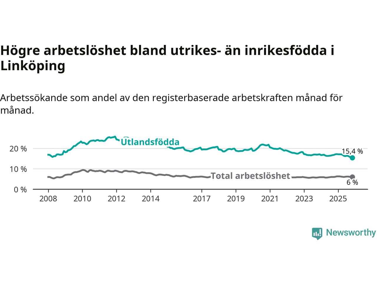 Skillnaden i arbetslöshet mellan utrikesfödda och hela befolkningen är 9,4 procentenheter i Linköping. Det är en betydligt mindre skillnad än för ett år sedan (−1,6 procentenheter).