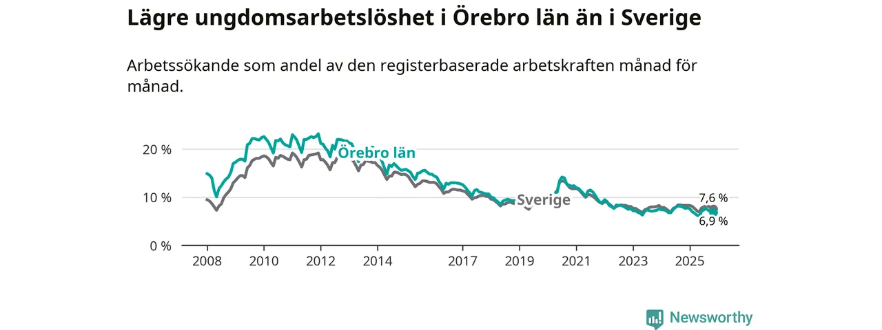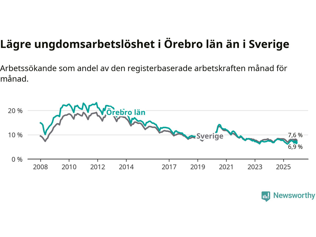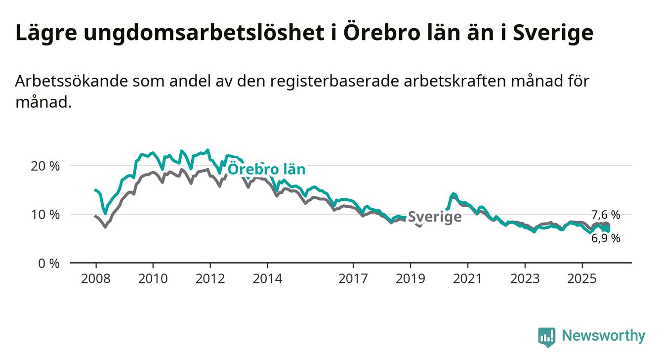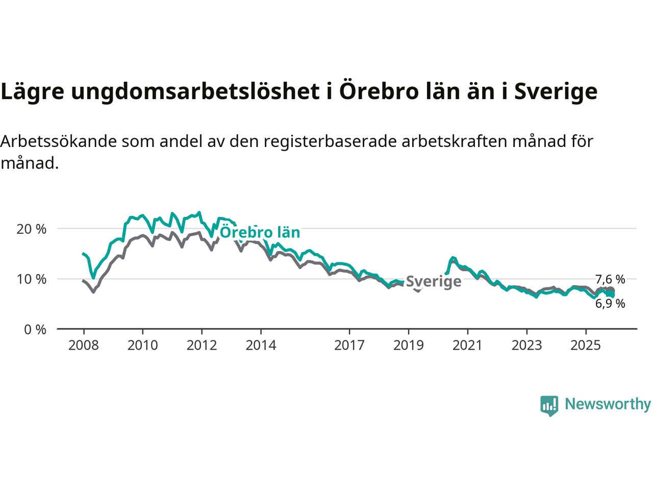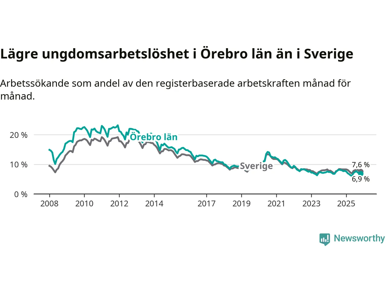 Medan Örebro har ungefär samma total arbetslöshet som Sverige, ligger ungdomsarbetslösheten 0,7 procentenheter lägre i Örebro.